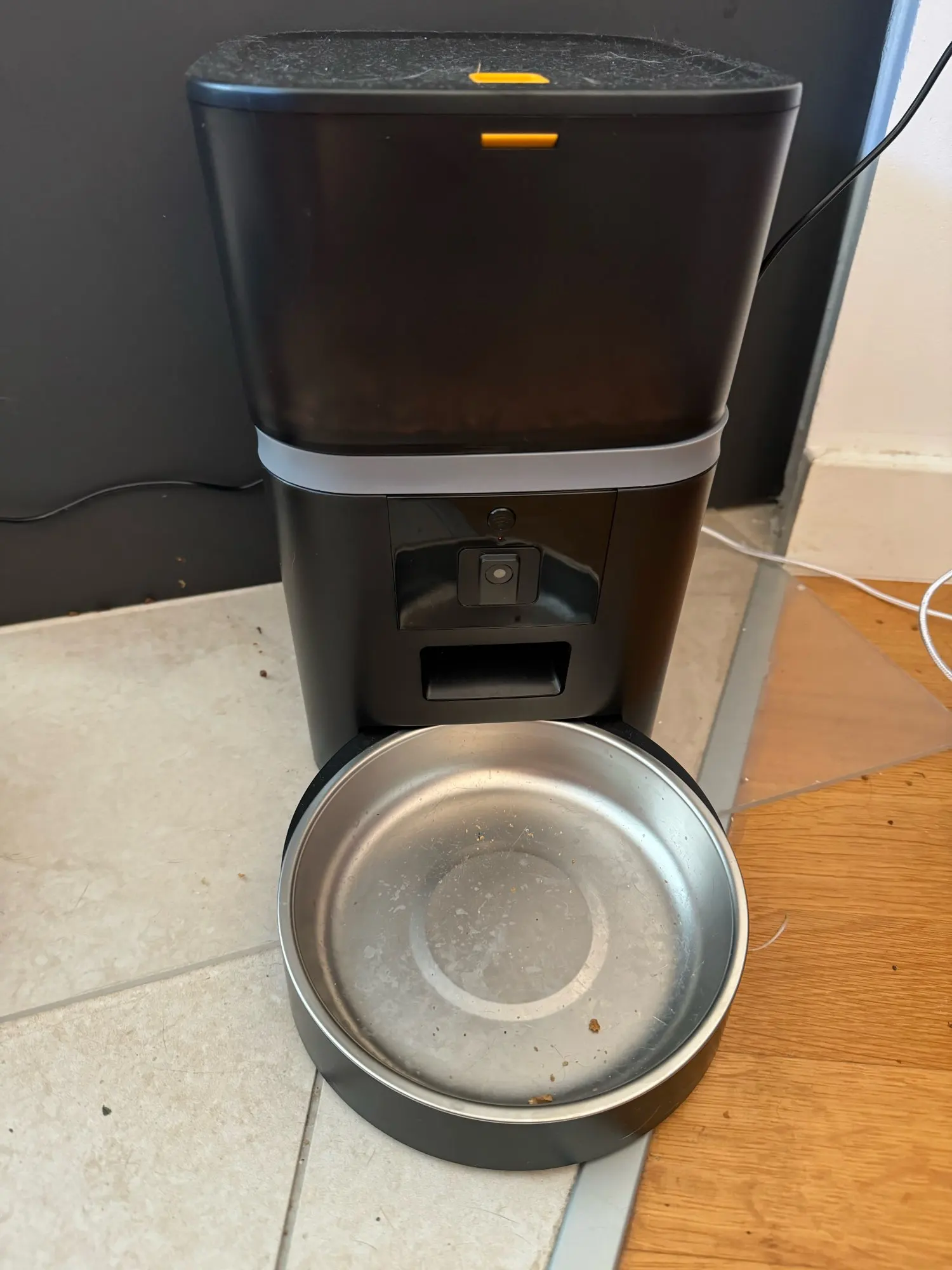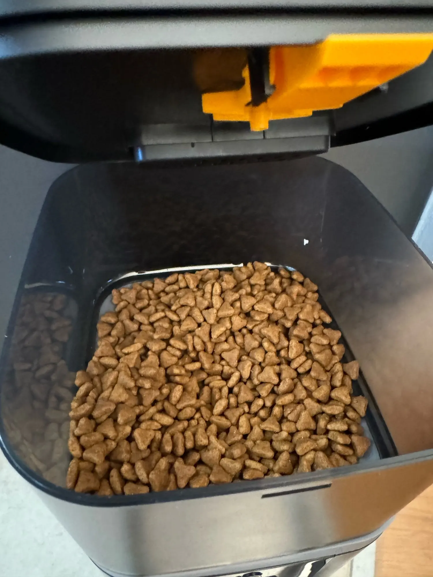 Работает потрясающе. Легко подключиться к приложению. Порция кошачьего корма составляет около 7 граммов. Вы можете полностью запрограммировать его внутри приложения. Верхний контейнер пришел с одним сломанным зажимом. Но я суперклеил его и не влияет на функцию фидера. Все во всех 5