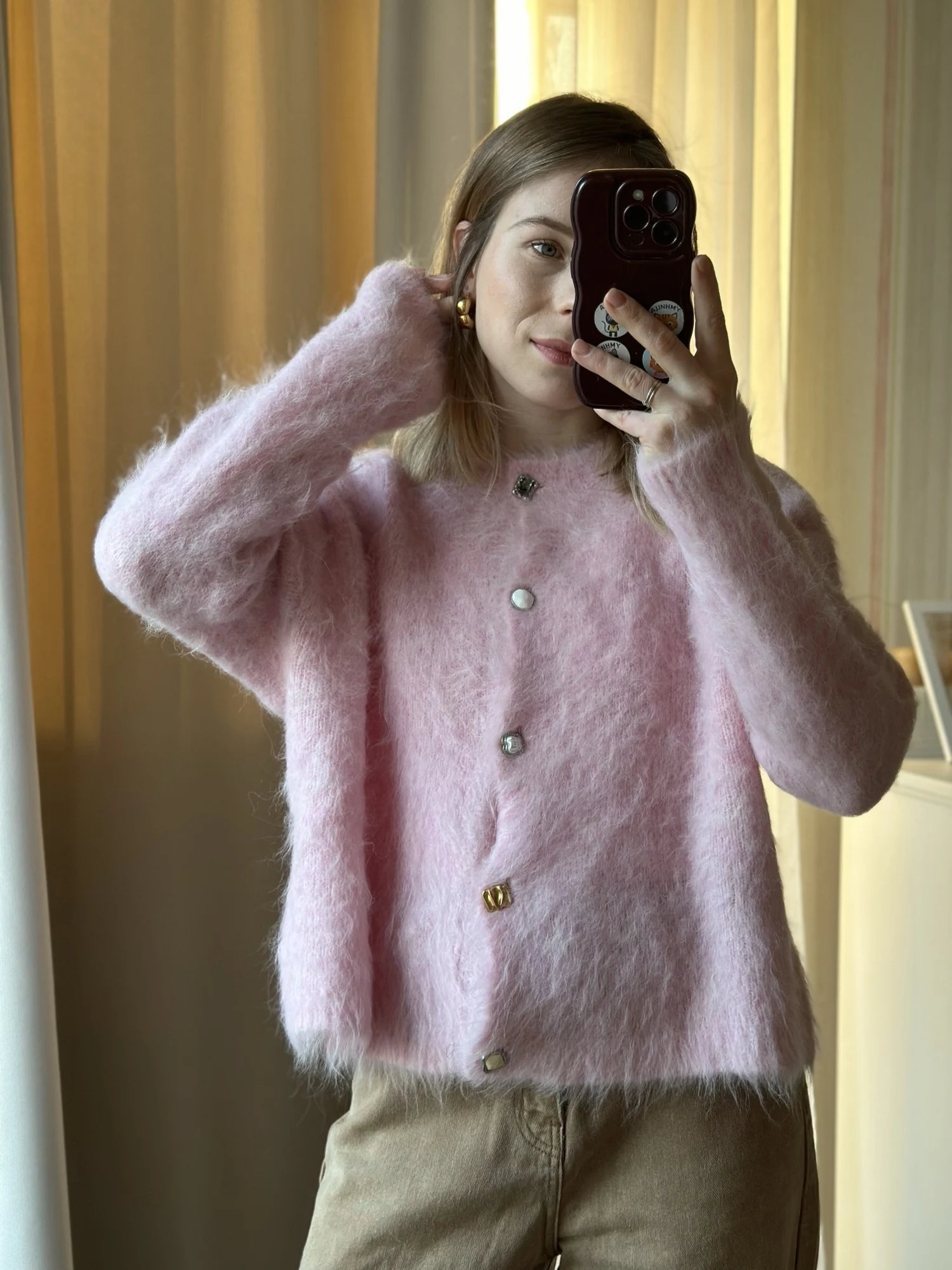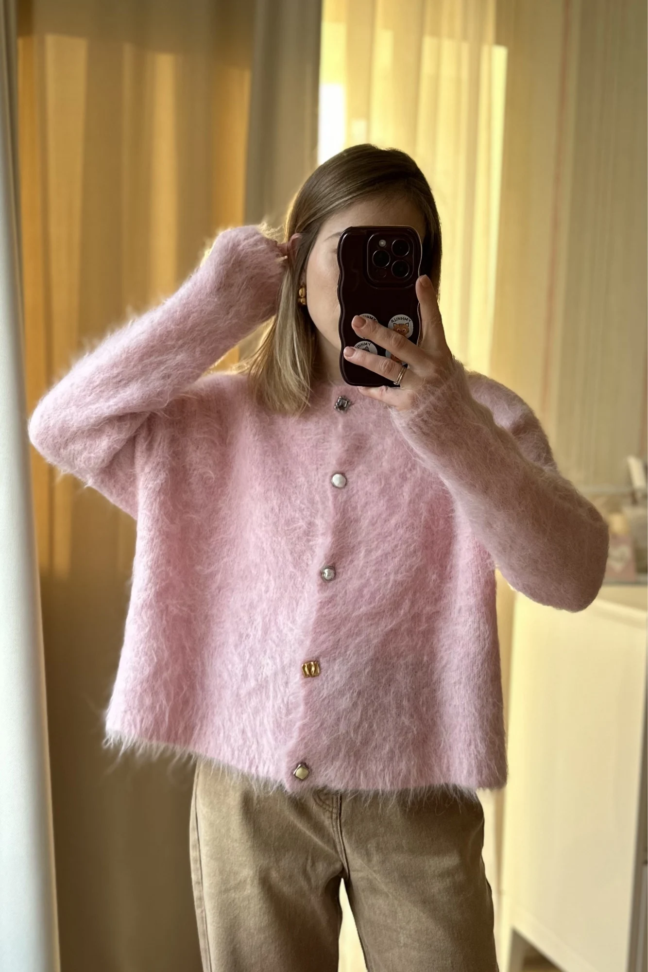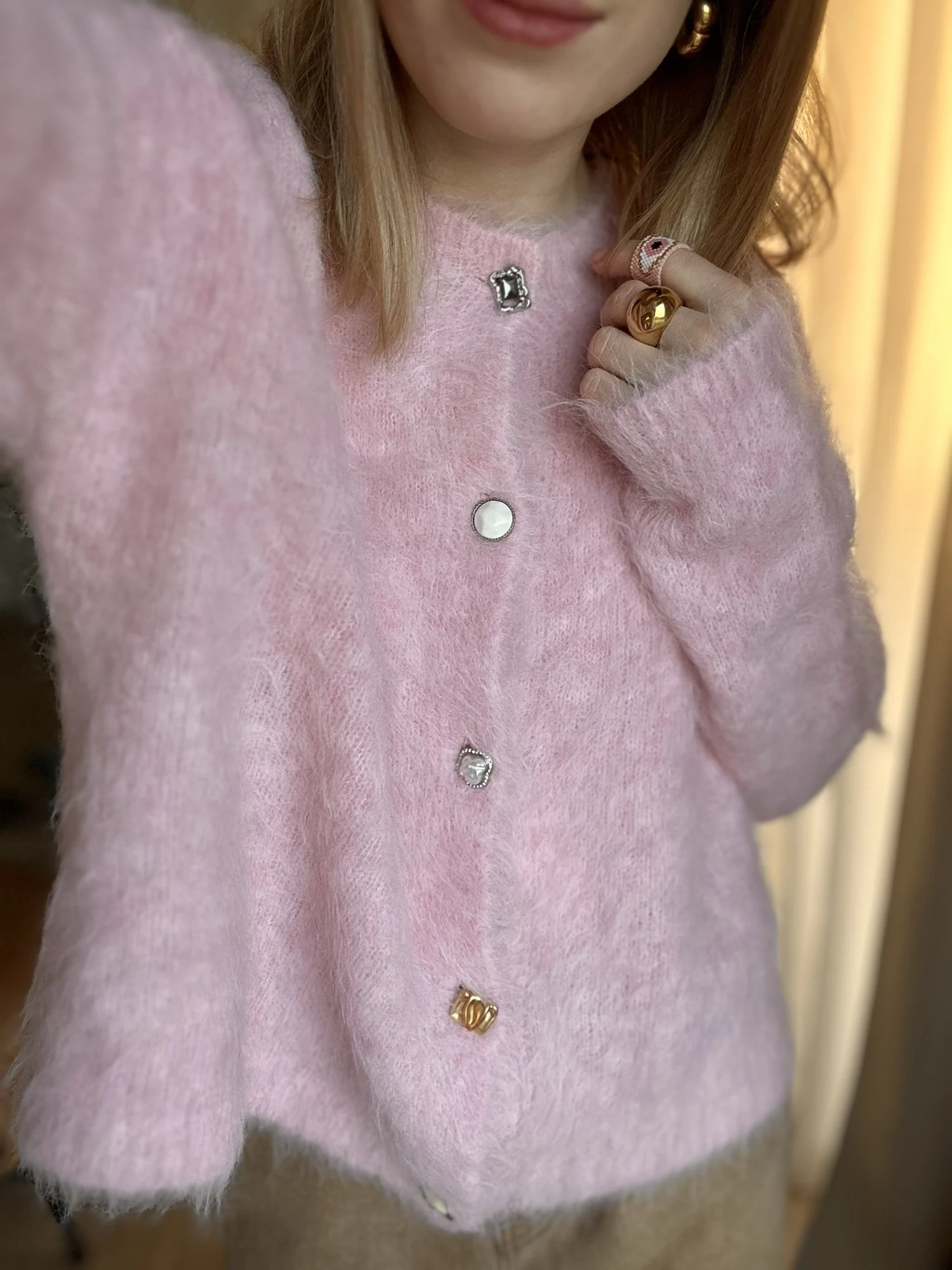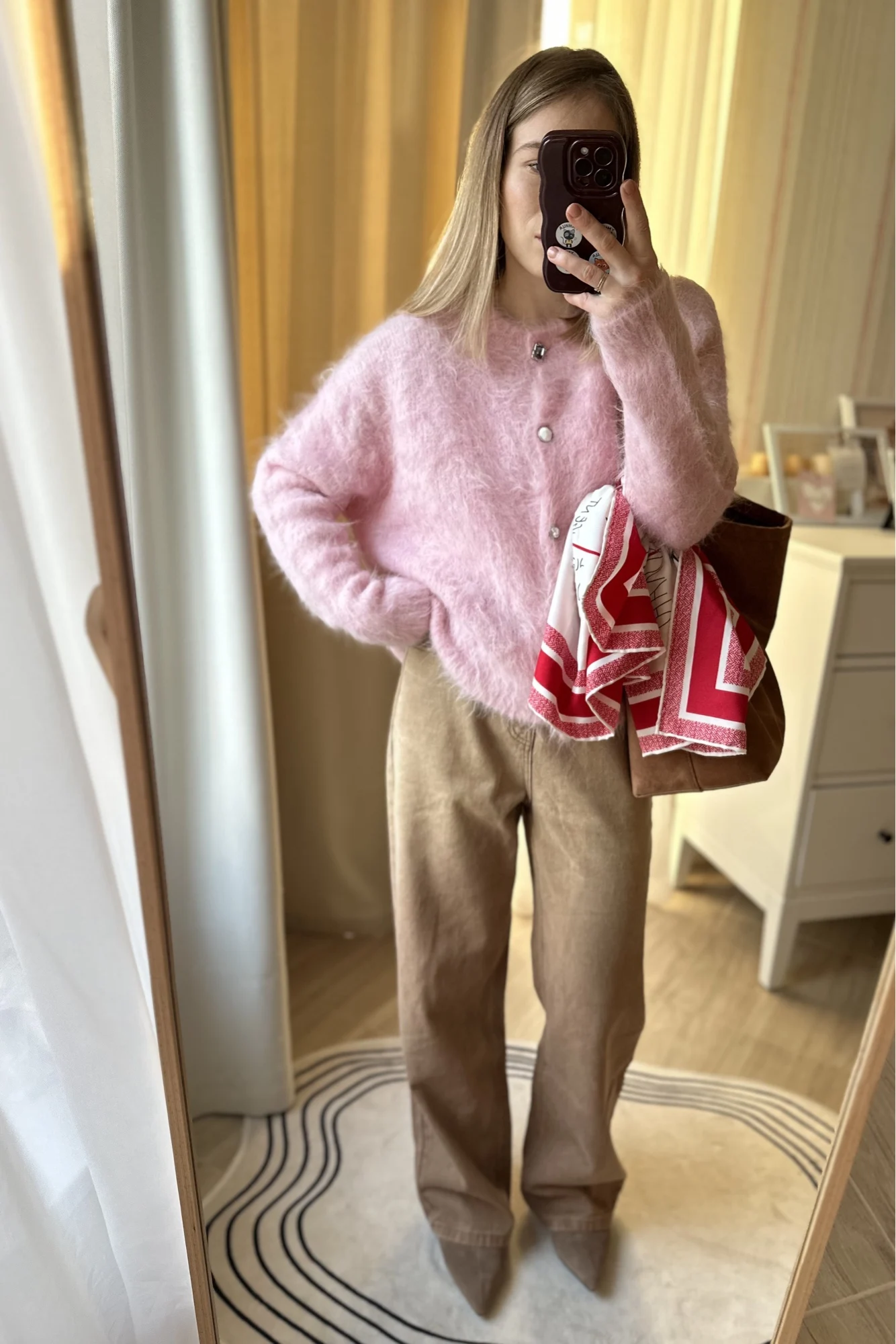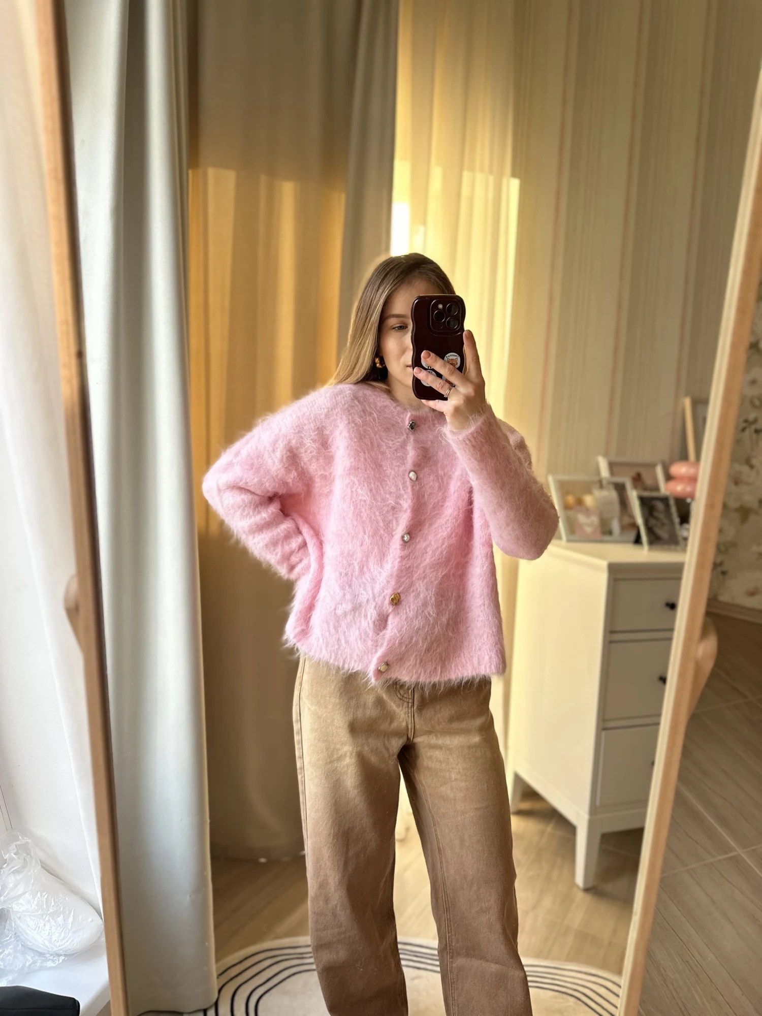 так прониклась этим кардиганом, что взяла его еще и в розовом цвете) Вы уже видели мой серый кардиган, так получилось, что заказала его вместо розового, потому что второго просто не было в наличии на то время у продавца. Теперь же, когда справедливость восторжествовала😜 я готова показать вам мой самый идеальный кардиган)) 78% альпака, 19% нейлон, 3% спандекса, мне так нравится, какой он пушистый, просто нежнейшее розовое облако) Микс пуговиц это самая главная изюминка этой вещи, признаться я в восторге, каждая из них очень красивая и очень необычная. Кардиган в едином размере, однако, мне показалось, что серый был Уже. Розовый прям широкий, но я люблю такой силуэт. Кардиган ооооочень легкий, его практически не ощущаешь на себе, но несмотря на это отлично греет, тестировала его вчера на улице с легким пуховичком, и мне было очень комфортно! Ну и роскошный внешний вид. Благодаря необычному цвету, пуговицам, смотрится роскошно и дорого, очень стильно) Сделала для вас обмеры, потому что мне показалось, что не на высокий рост. Рукав 65, длина 56, ширина 64. Рукава длинные, отличные, а вот длина самого изделия не позволит комфортно носить его девушкам выше 165, ориентировочно. Я в восторге, не пожалела, что пересказала этот кардиган второй раз, абсолютное попадание в мой вкус!) Мои параметры 159, 84-72-93, размер единый.
