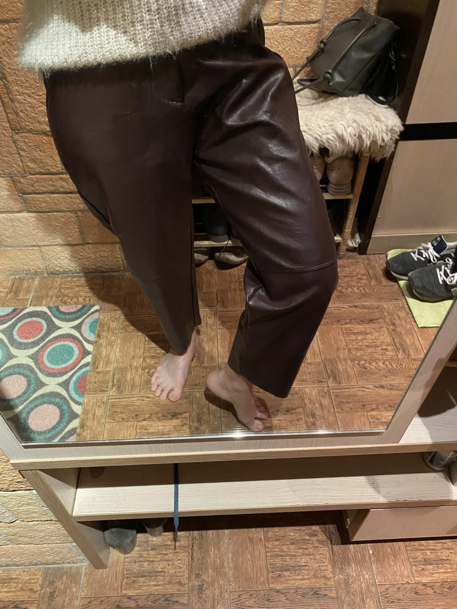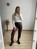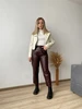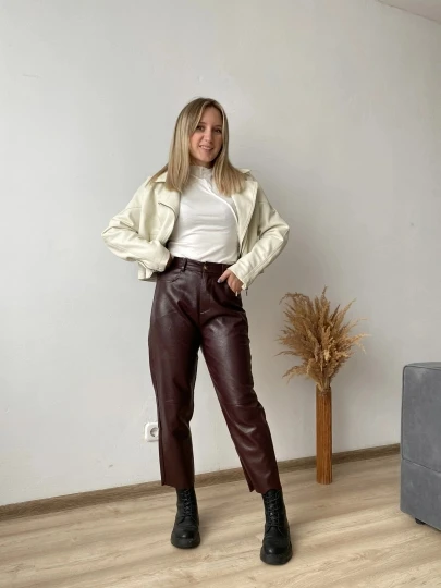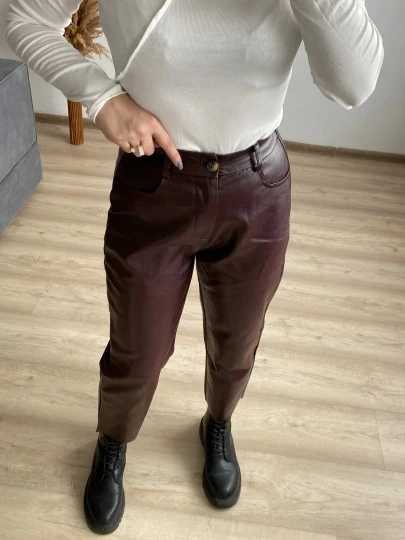 Кож.зам брюки У меня есть такие черные ,но с другого магазина . Сразу скажу ,что по качеству они одинаковые и я рада . На этот раз бордовый цвет,размер М. Мои параметры 88-66-90 рост 158см. Брюки плотные ,высокая посадка ,талия на резинке ,имеются карманы . На сезон осень весна ,смотрятся стильно . Еще не совсем поняла как стилизовать данный цвет ,но я придумаю