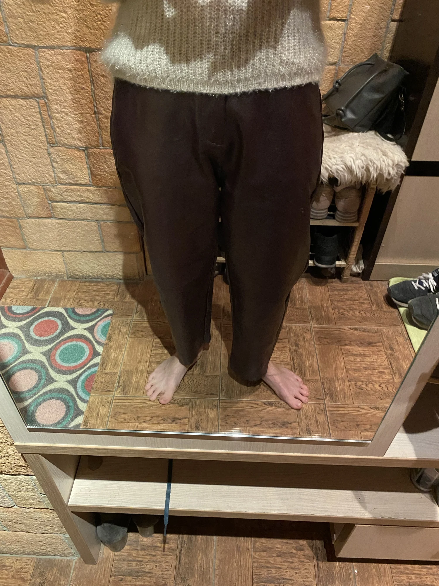 Брюки из молодого дермантина оказались великолепными. материал плотный,, изделие сшито аккуратно, смотрятся достойно. я брала размер XL, сели отлично. мои параметры: ОТ 70, ОБ 98. на мой рост 164 брюки коротковаты до косточки 3 пальца, но это закроет обувь. К покупке рекомендую.Anzhelika S. 30 октября 2024