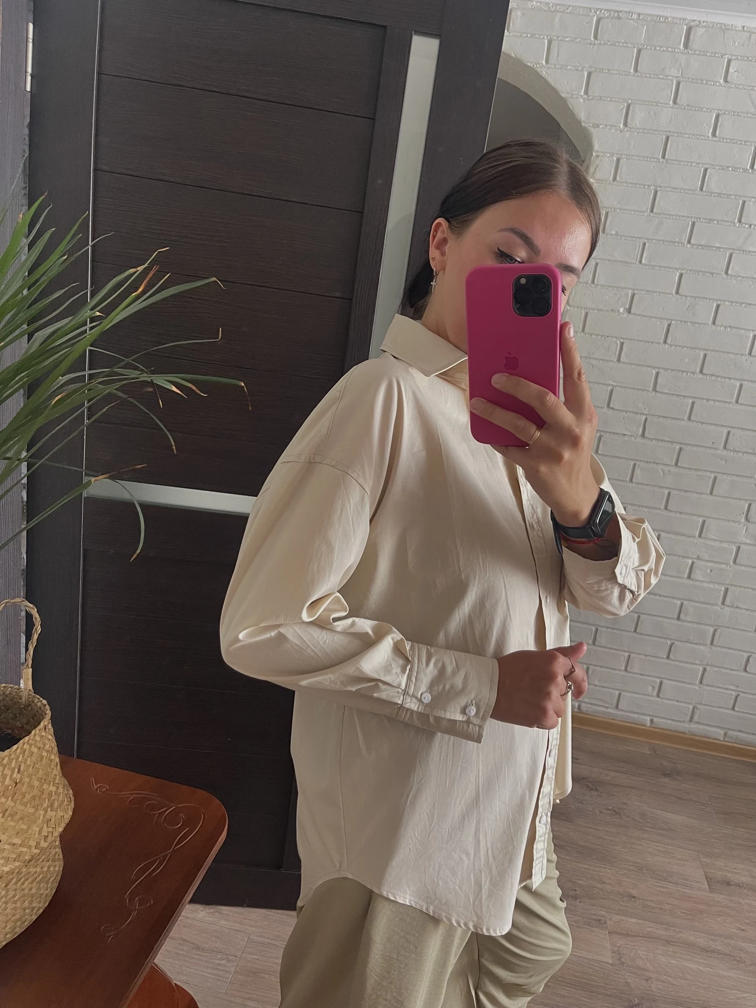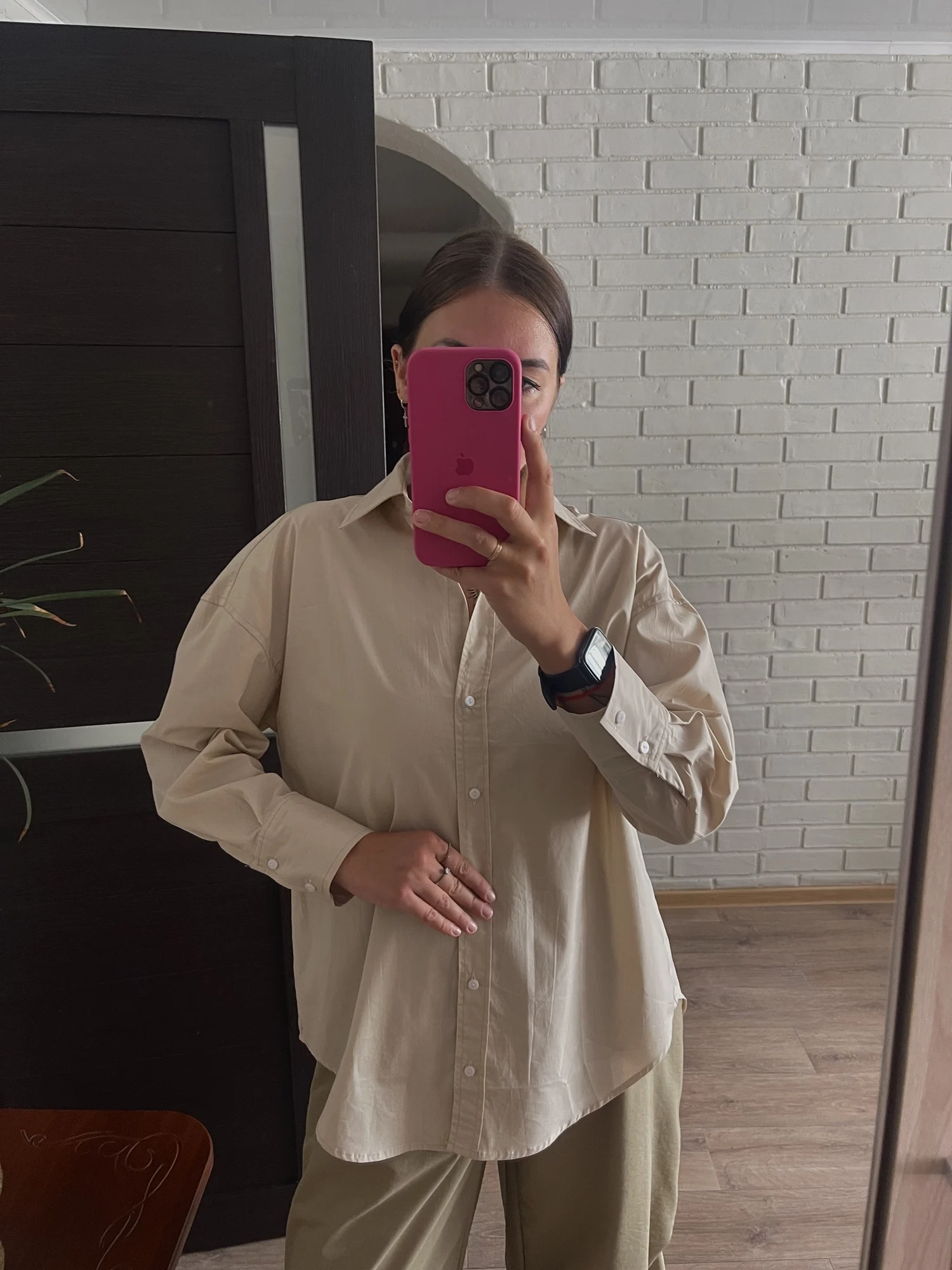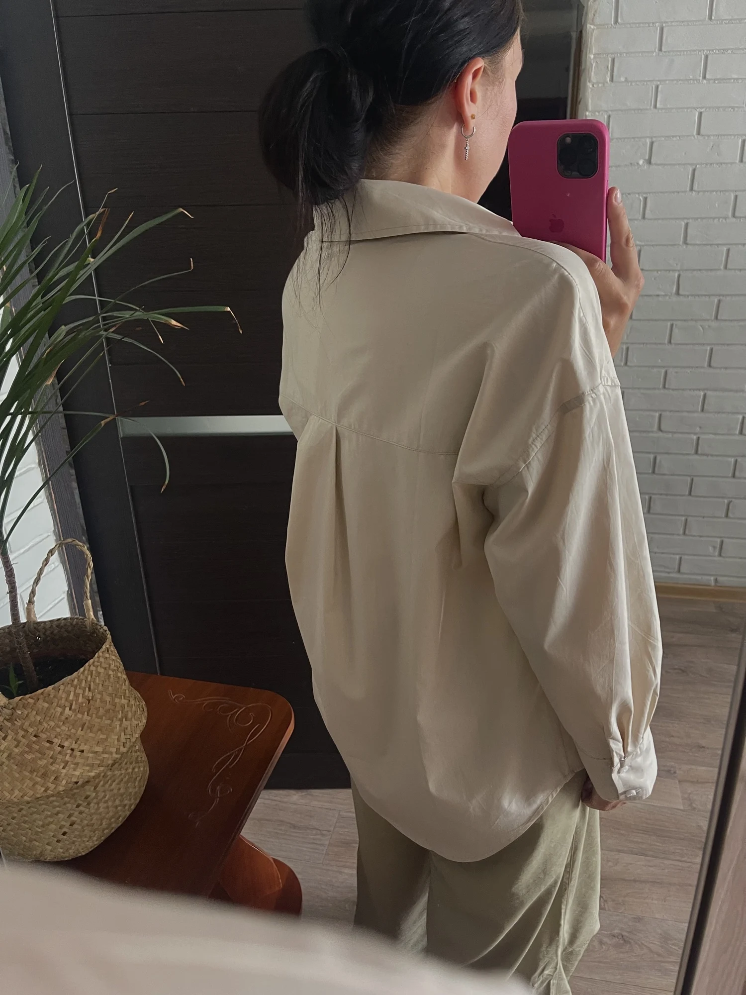 Рубашка выполнена из хлопковой ткани К телу приятная, не эластичная, не просвечивает. Отличный вариант на круглый год Смотрится стильно, оттенок beige в котором я выбрала приятный. Пошита качественно Швы обработанные, ровные. Пуговицы пришиты крепко. Фасон прямой по спинке удлиненная по бокам закругленная. Линия пуговиц от груди (не от шеи). Манжеты на пуговицах. Воротник классический отложной. Линия плеча спущена. На мне размер L, села оверсайз. Мне нравится. Мои параметры 90/70/94 рост 170. БИРКА и ярлык присутствует Доставка девять дней СДЕКом Рекомендую ❤️