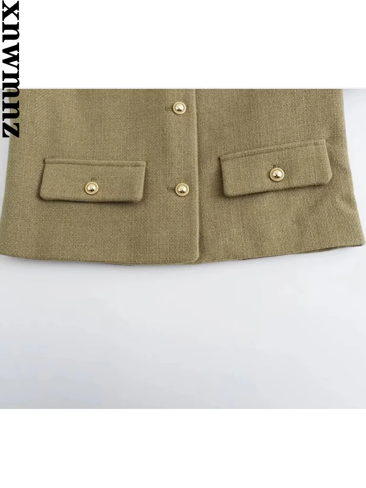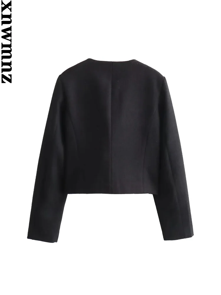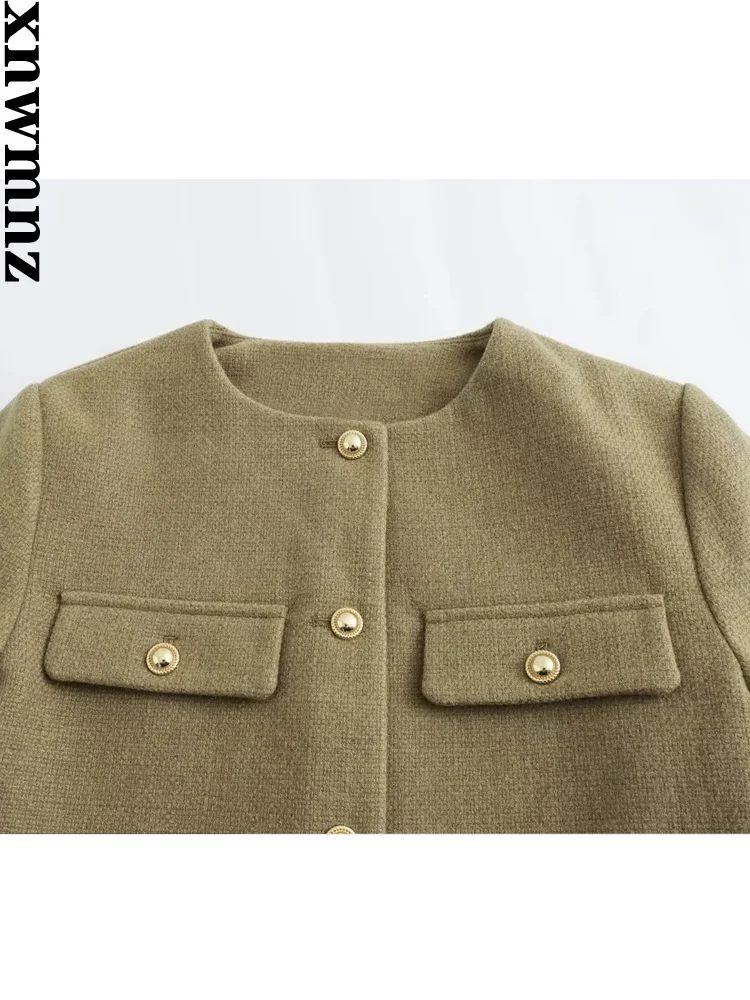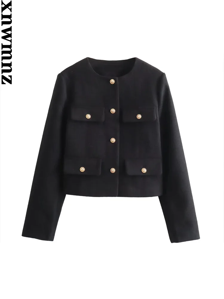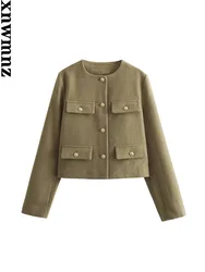 XNWMNZ женская мода 2023, осенне-зимняя укороченная куртка с клапаном и карманами, женский винтажный универсальный женский пиджак с круглым вырезом и длинными рукавами