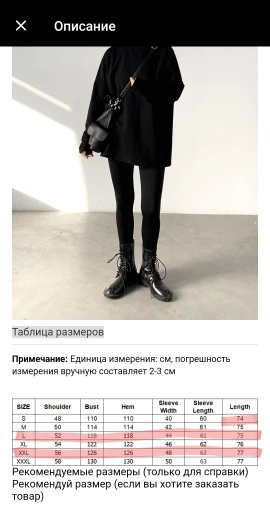 Заказала две, разного цвета, с разницей в неделю. Заказывала бы одну, поставила 5 звезд. А так, как будто в разных магазинах куплено, для 'хорошего' фабричного это, мягко говоря, странно. Упаковочный пакет одинаковый, но бирки разные. Белая была упакованна лучше, с прослойкой из тонкой бумаги в пакете и защитной пластиковой клепкой помимо прочего. Черная просто в пакете с биркой на нитке. Белая на два размера больше, но на 2см короче черной почему-то (я специально ее заказала на 2размера больше, чтоб попу прикрывало) в итоге она короче заявленной длины на 4!см и вообще короче заявленной длины самого маленького размера на целый сантиметр! Черная короче заявленного на 1см, это еще ничего. Заказывала еще кофту на пуговицах, она тоже короче таблицы на 3см. Боюсь представить что будет после стирки. Ткань плотная, ниток практически нет, только на швах у горловины. Если бы не полное несоответствие длины, то была бы довольна. Дорого для соотношения цена/качество, но тут каждый выбирает сам.