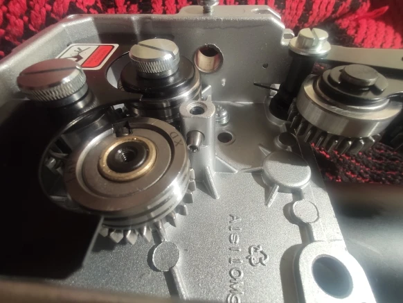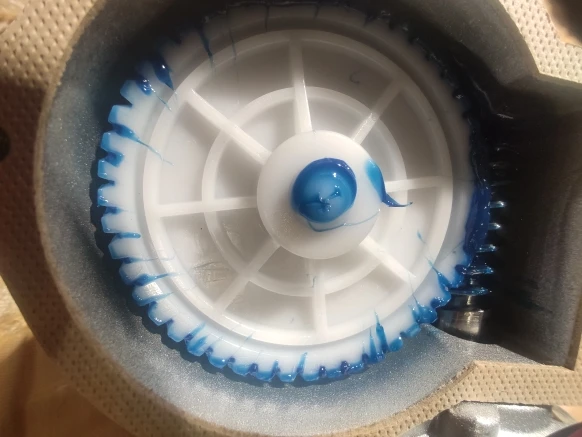 Доставка в пакете, внутри пенопластовая коробка, которая рассыпалась. Повреждений и царапин нету. Шестерёнки на латуневых втулках крутятся. В редукторе шестерёнка пластиковая, надеюсь не сточится, это немного разочаровало, на фото смазка родная. Мотор добротный большой, 73мм диаметр, катушки двигателя не залиты лаком. При напряжении 1.3В медленно крутит ролики.
