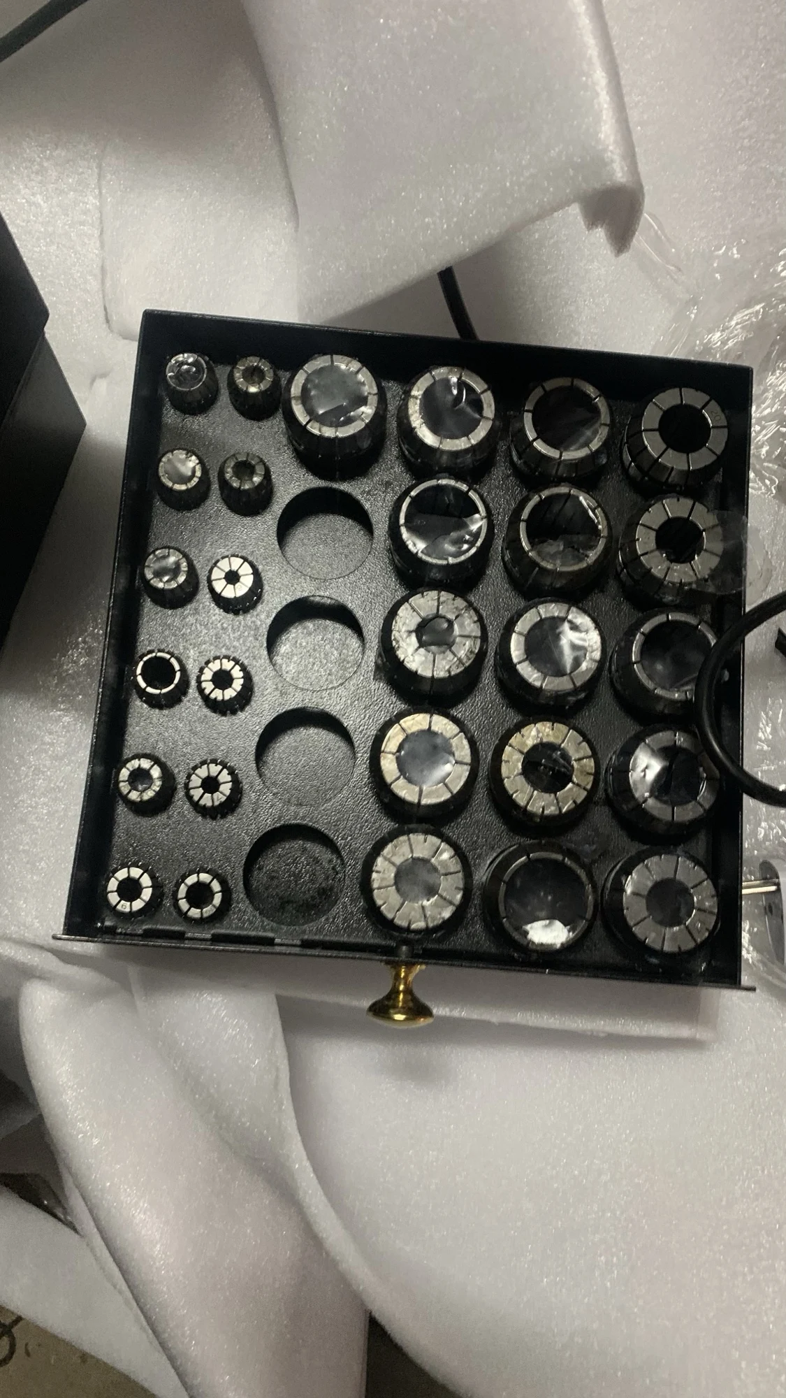 пустые ячейки, наверное надо докупать цанги, каких размеров нет, незнаю, буду выяснять и докупать. все работает, упаковоно хорошо, сломоного нет нечего. цанги при транспортировки все выпали , так как на коробке , (оснавная коробка, которая заклеена вся скочем и мешком, под этой поробке было указатели верх низ), а на сомой коробке нет указателей верх, низ. но это не не страшно было. станок нормальный. про вилку: не еврапейкая, (( с переходником на еврапейскую. надо будет поискать такой провод с европейской выходом. думаю от компьютера подойдет.