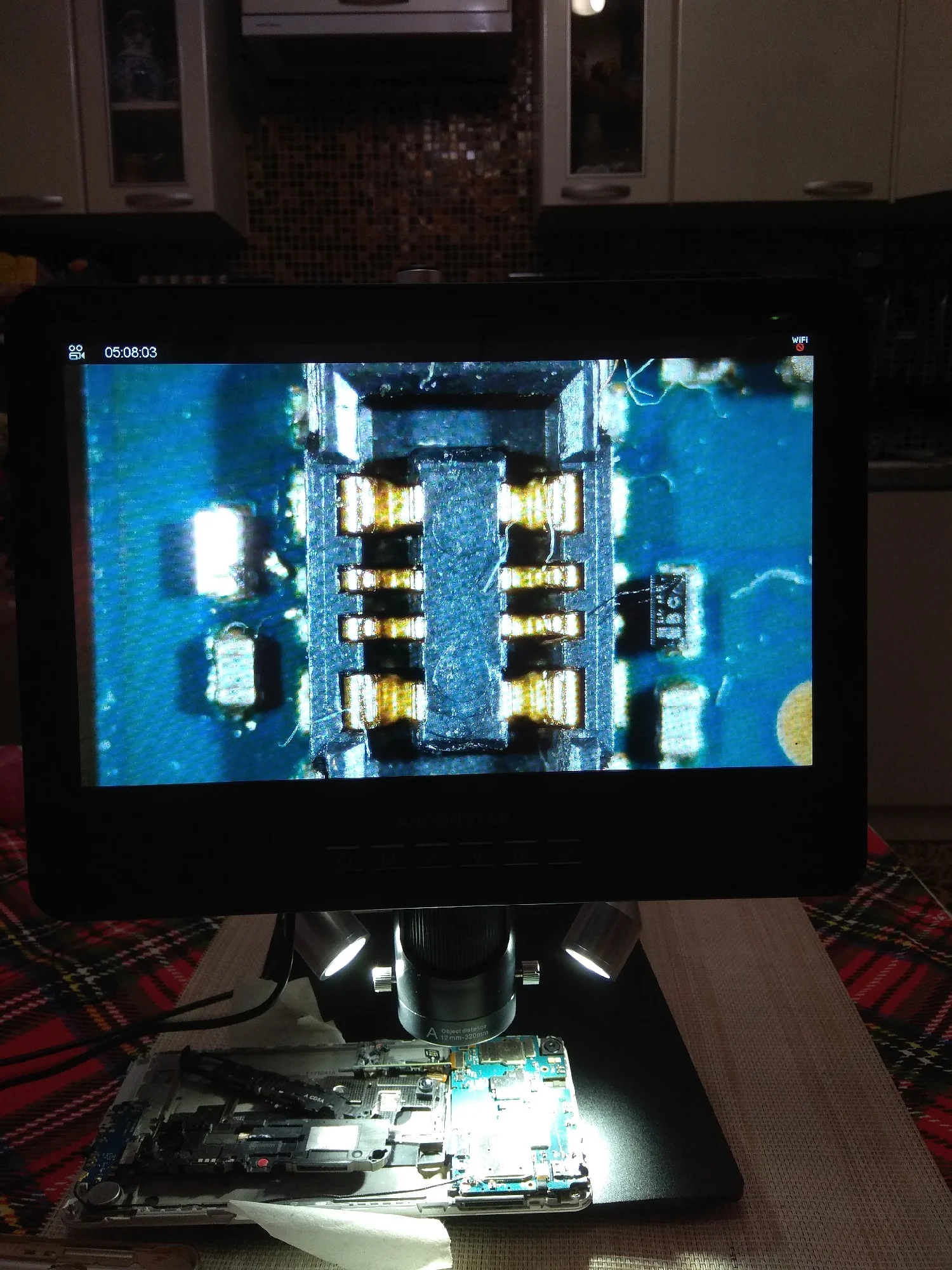 Это мой первый микроскоп,так что мнение будет субъективным. И да ,я впечатлен.Покупал для ремонта электроники,зрение подсаживается,да и детали мельче становятся.Брал специально с 3 линзами,что б и с ребенком можно было посмотреть на мир соседей наших меньших. На фото материнка ноутбука, место под разъем матрицы 40 пин, и разъем телефона. Экран радует, цветопередача как бы реальную картину показывает. Задержка почти не заметна,по крайней мере я не ощущал какого то дискомфорта при работе, привык быстро. Я доволен,работа по ремонту электроники перешла на новый уровень.