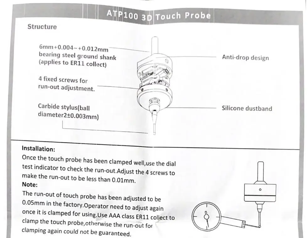 На заводе значение выхода сенсорного датчика было отрегулировано на 0,05 мм. Потребность оператора отрегулировать снова она зажата для использования. Класс ЭР11 пользы ААА собирает токламп зонд касания, в противном случае бегство-вне форклампинг снова не смогло быть гарантировано.