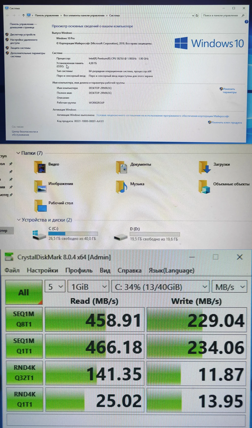Приобрёл конфигурацию Pentium 3805U DDR3L 4Gb RAM 64G SSD. Вентилятора нет, что означает, что компьютер абсолютно бесшумный, включил и не выключал пять дней: корпус нагревается сильно-сильно, компьютер работает нормально. Собираюсь использовать для раздачи интернета в офисе-складе и как файловое хранилище. Изначально установлен Windows 10. Windows запустился быстро, тест скорости встроенного SSD смотрите на картинке. Сейчас Windows удалил и установил FreeBSD, всё установилось и работает отлично. Жду дополнительные диски и также хочу вытащить Wi-Fi модуль и вместо него установить Half Size mSATA SSD на 512Gb(должен заработать, я думаю). Есть пломба на одном из болтов и, как я понимаю, повреждение пломбы лишает гарантии, но как же тогда установить дополнительный жёсткий диск!?(это вопрос к продавцу) Т.к. всё работало и мне всё равно надо попасть внутрь системника, я раскрутил болт. После окончательной установки FreeBSD я включу этот мини-пк и не буду выключать года три!!!oleg u. 18 июля 2022