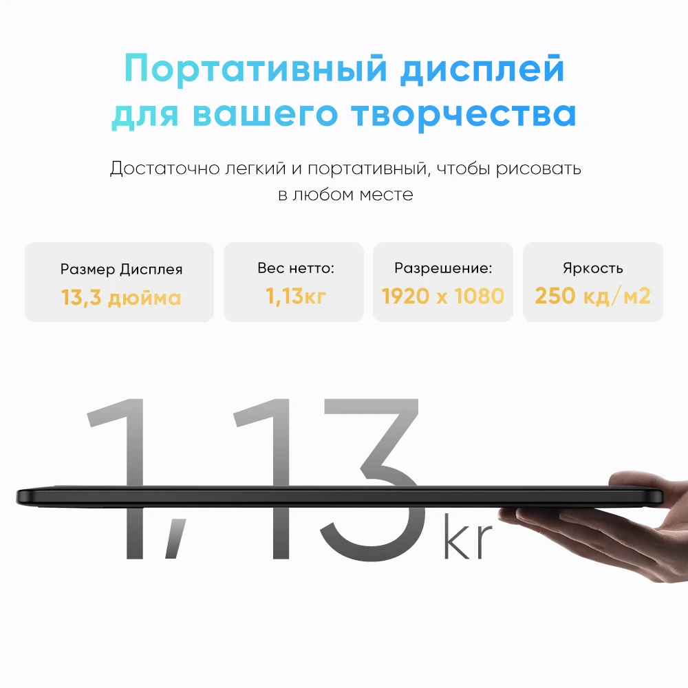 Устройство с диагональю экрана 13,3 дюйма и весом нетто 1,13 кг отличается исключительной мобильностью. Разрешение экрана разработано специально для вас, чтобы обеспечить захватывающий процесс рисования!