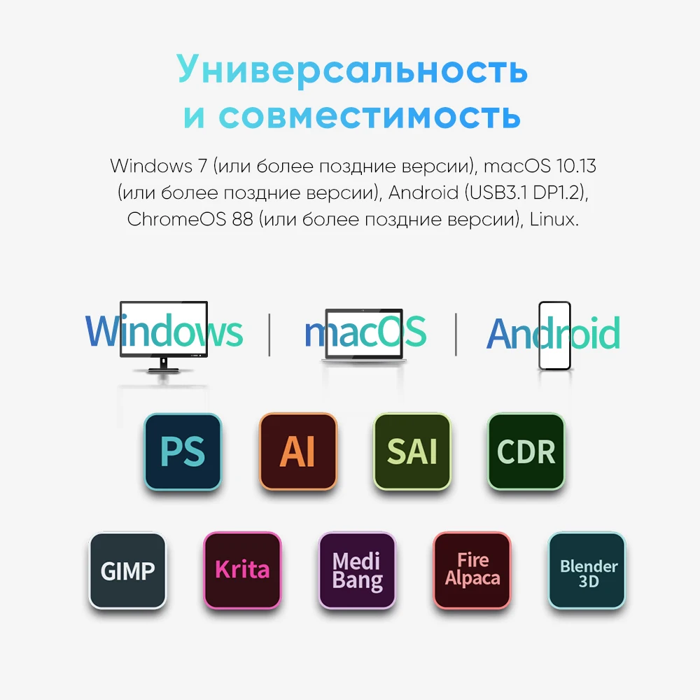 Поддерживает операционные системы Windows 7 (или более поздние версии), Android (USB3.1 DP1.2), ChromeOS 88 (или более поздние версии), Linux и macOS X 10.13 (или более поздние версии). Совместим с популярным программным обеспечением для цифрового искусства, таким как Photoshop, Illustrator, SAI, CDR, GIMP, Krita, Medibang, Fire Alpaca, Blender 3D и другими.