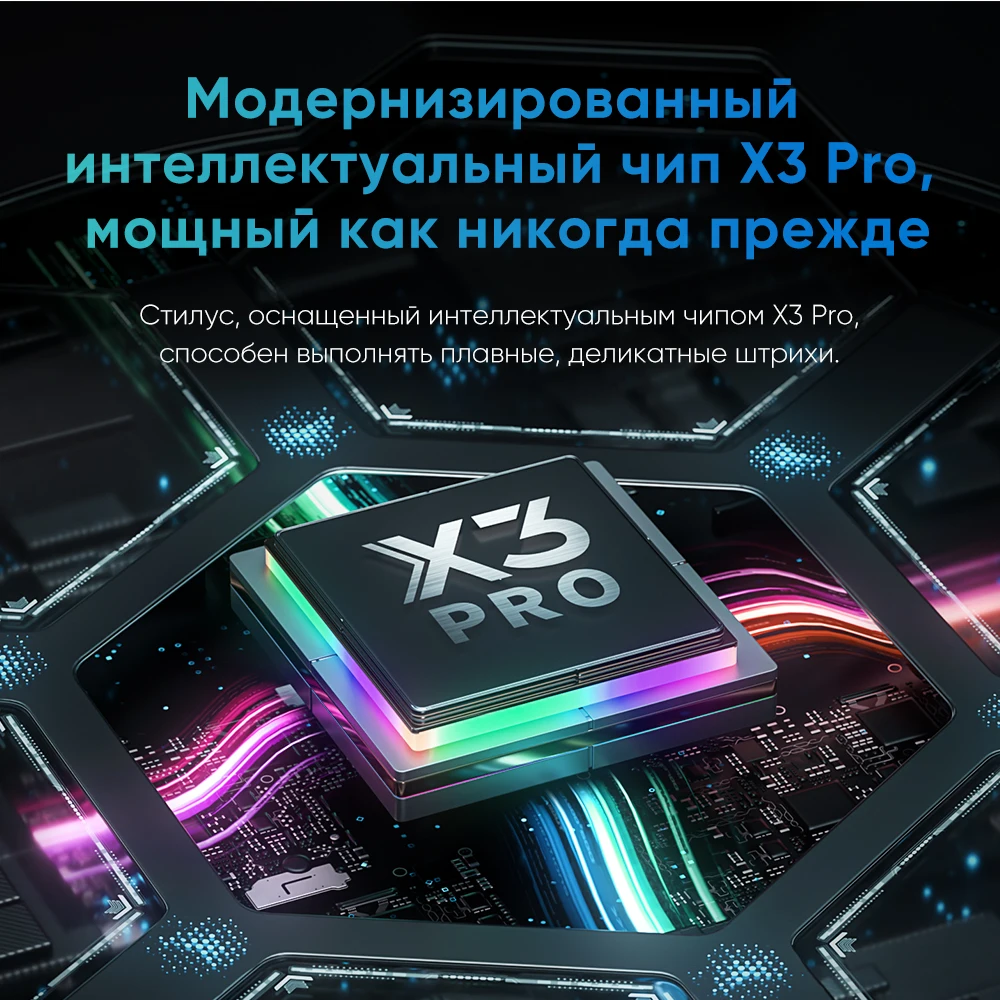 Ваш стилус полностью обновлен. Работающий на базе интеллектуального чипа X3 Pro, стилус с интеллектуальным чипомX3 Pro обеспечивает плавные, точные и нежные штрихи, как никогда прежде. Фетровые наконечники имитируют ощущение ручки на бумаге. Стилус также имеет две клавиши быстрого доступа и цифровой ластик, что делает его более эффективным для рисования и более удобным благодаря силиконовому захвату.