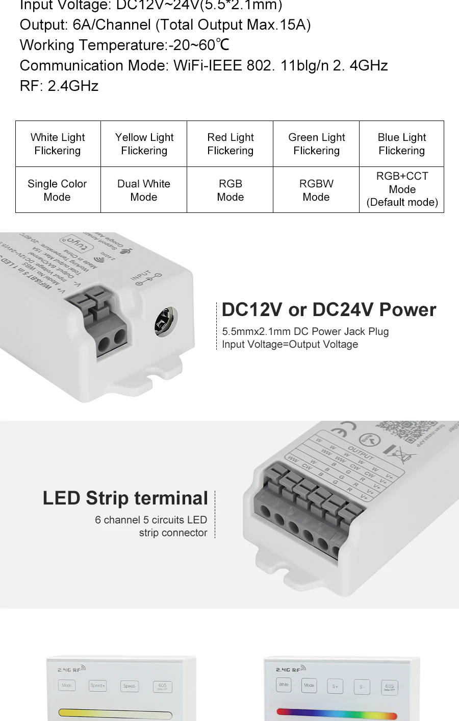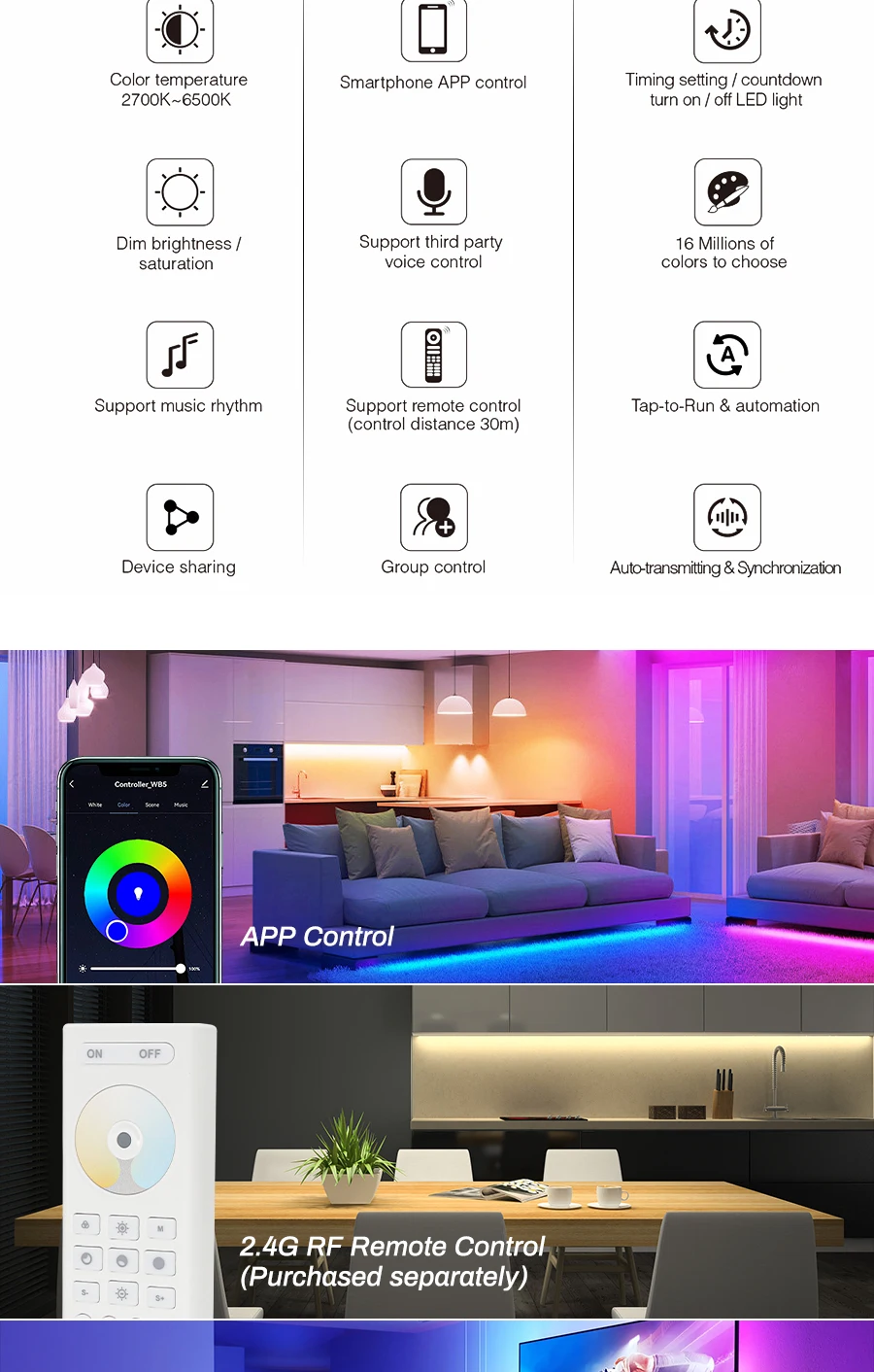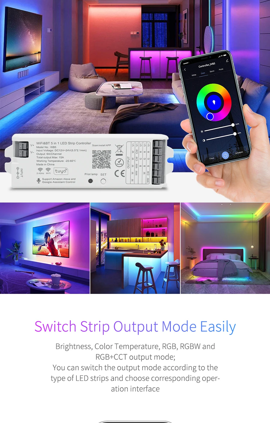 Поддержка типа светодиодной ленты: все светодиодные ленты PWM (одноцветные, CCT, RGB, RGBW, RGBCCT) SMD/ COB