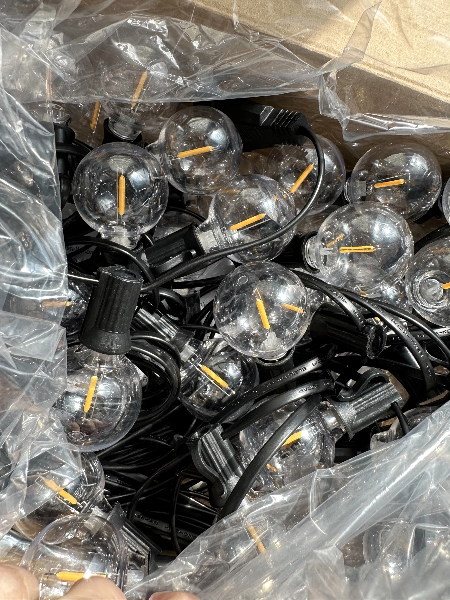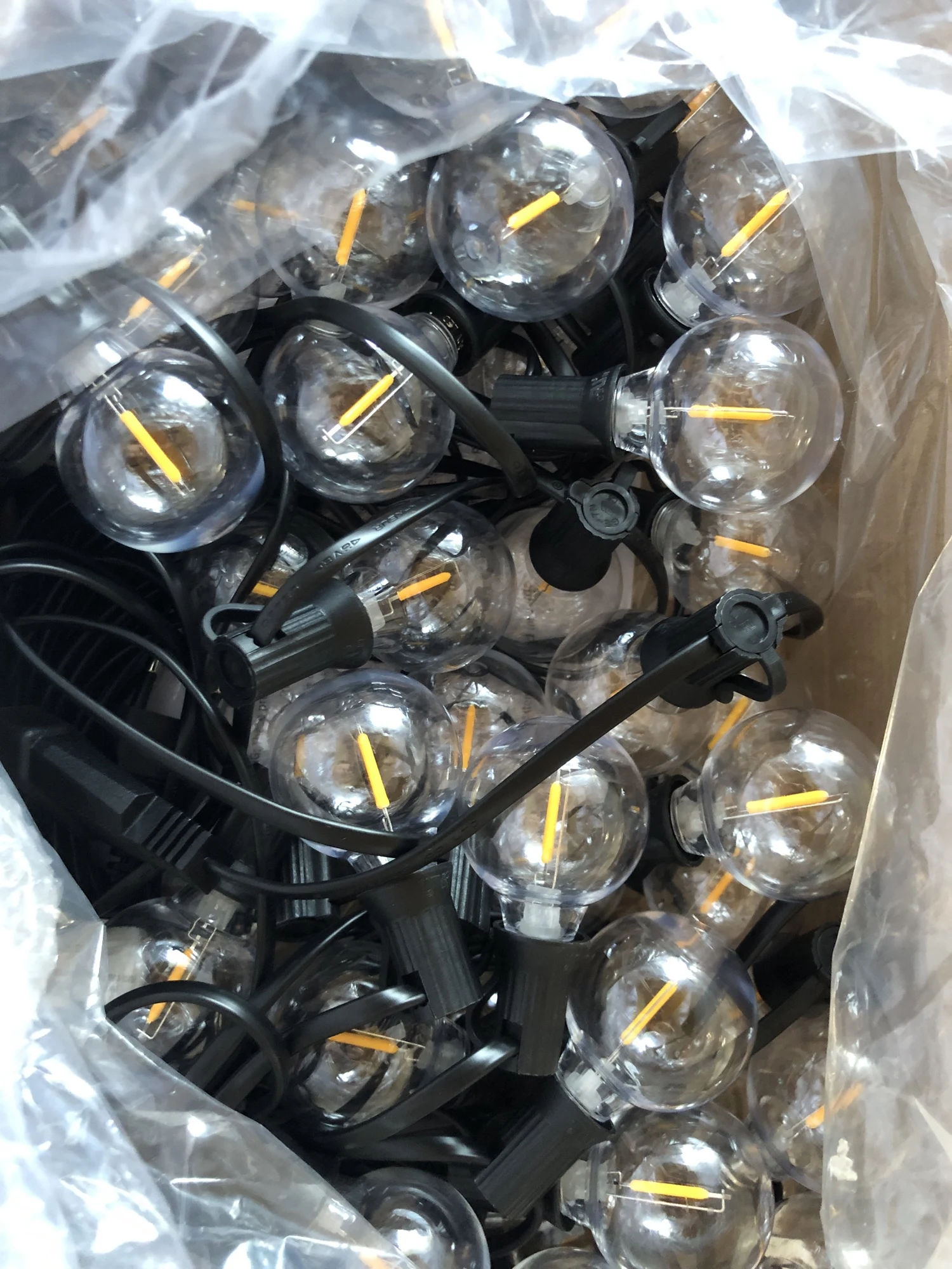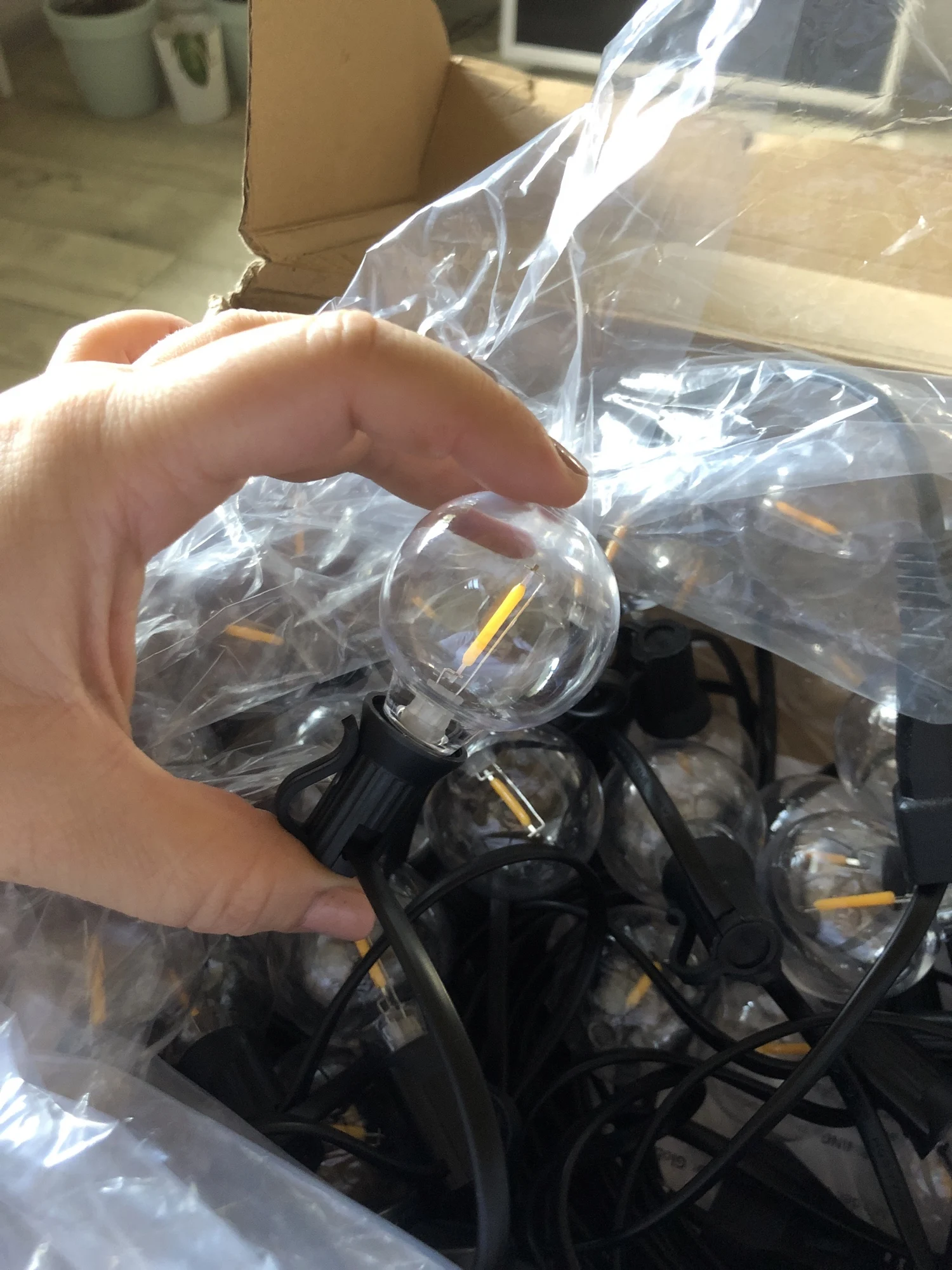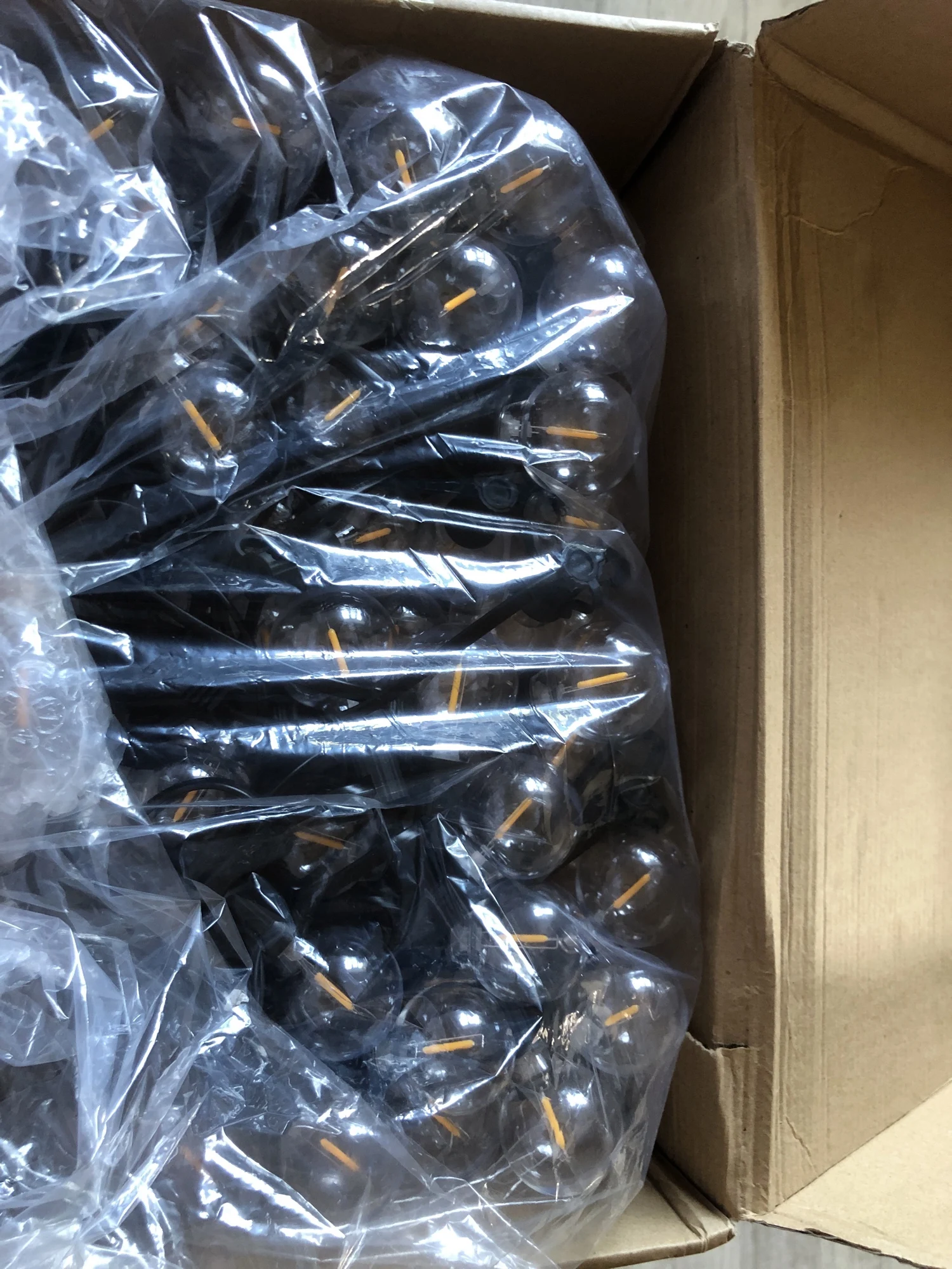 Гирлянда пришла очень быстро. Буквально за 3 дня до Москвы. Лампочки светят теплым белым светом, всего 50 штук + 2 запасные. Пластик. Упакованы в коробку и в пакет, без пенопласта и прочего. Небольшие по размеру. Также в коробку положили инструкцию на английском языке (как в описании) и хомуты для удобства крепления. Я очень довольна, чуть позже вышлю фотографии с оформленного сада, а если не хватит, обязательно закажу еще.