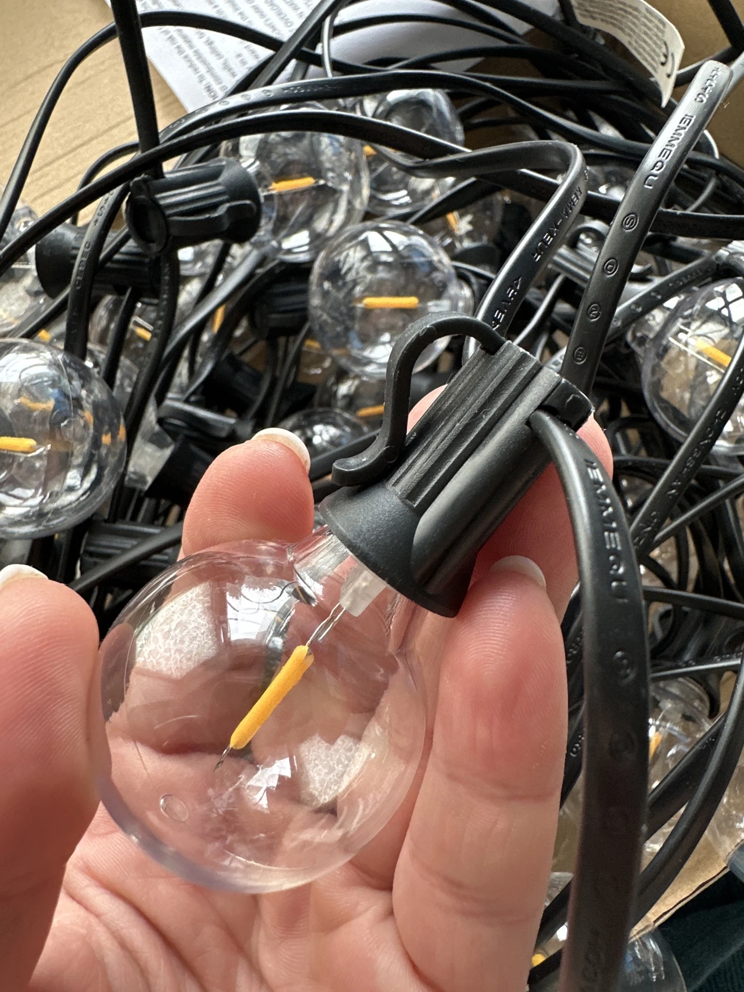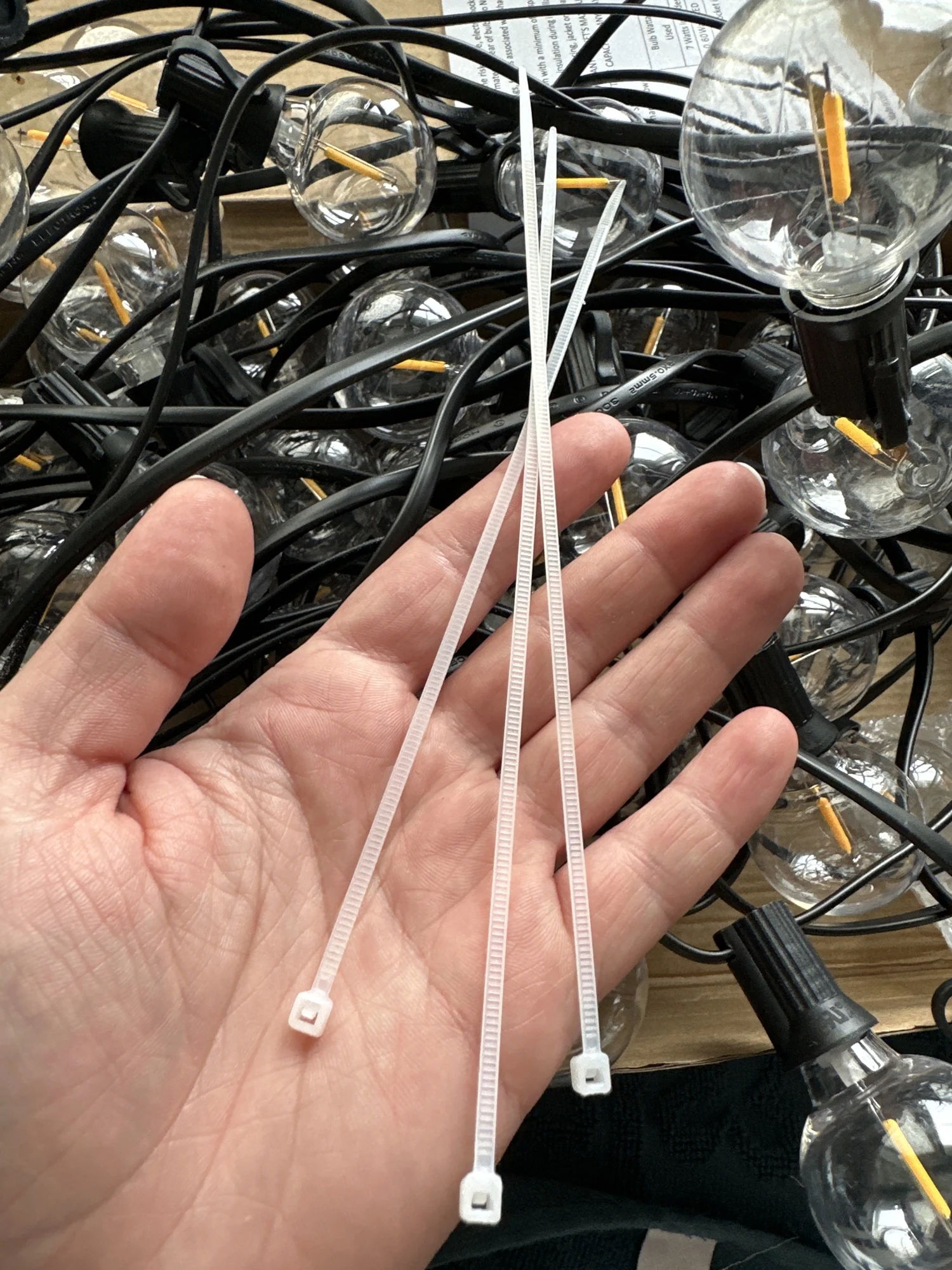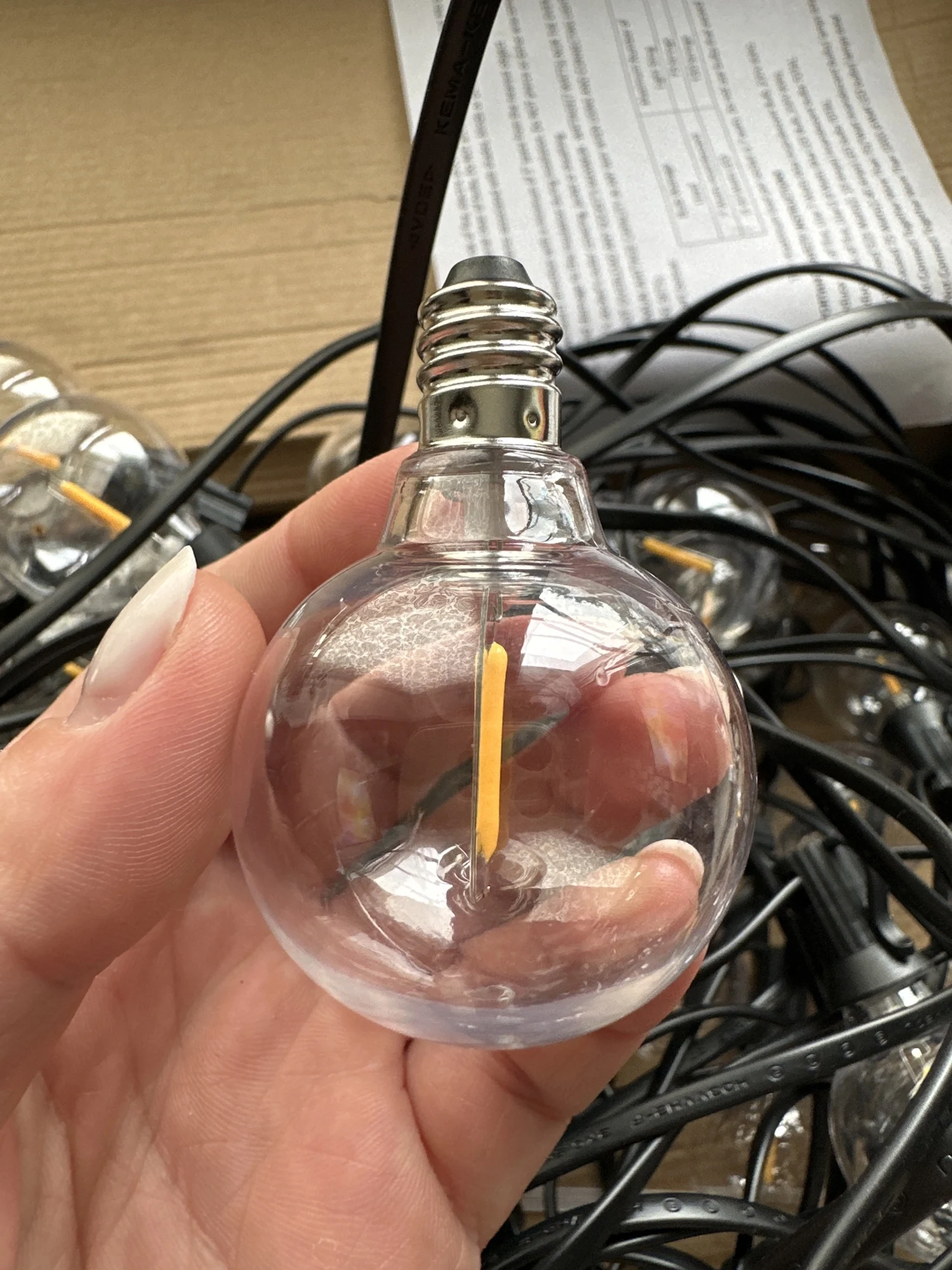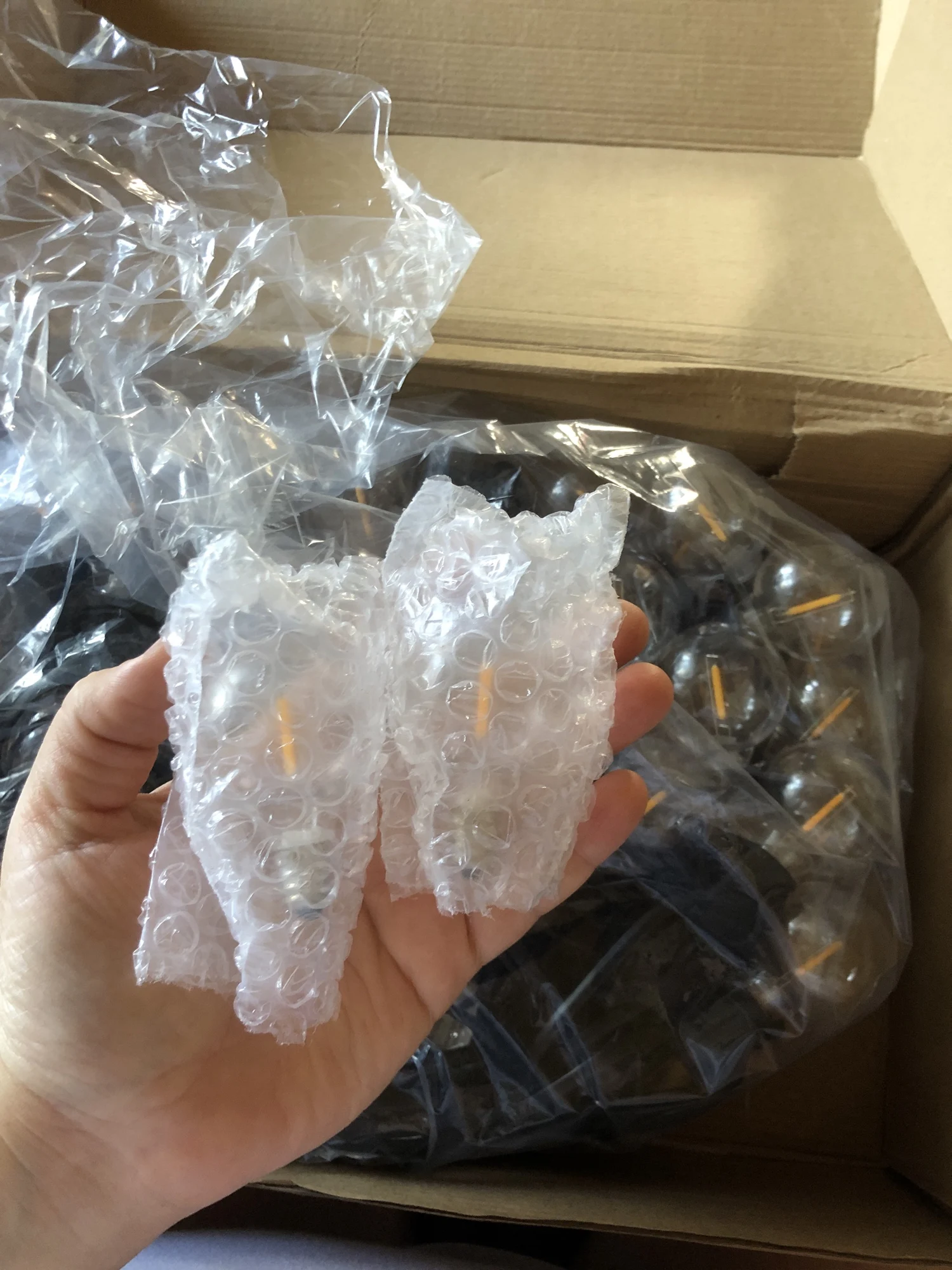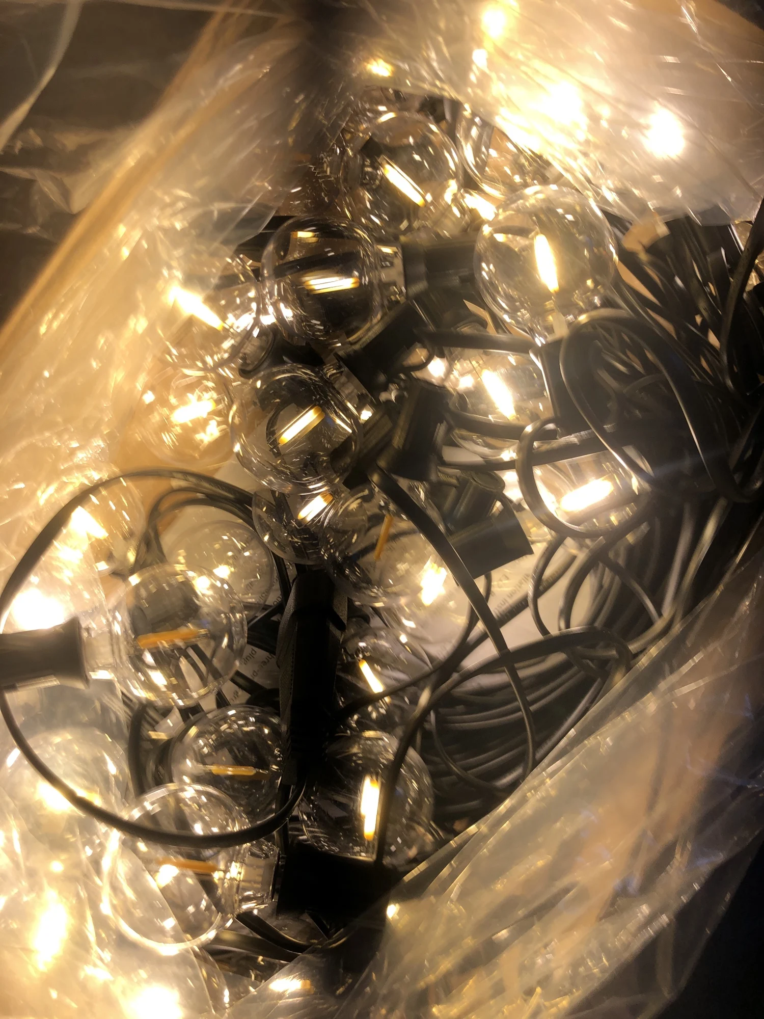Гирлянда пришла очень быстро. Буквально за 3 дня до Москвы. Лампочки светят теплым белым светом, всего 50 штук + 2 запасные. Пластик. Упакованы в коробку и в пакет, без пенопласта и прочего. Небольшие по размеру. Также в коробку положили инструкцию на английском языке (как в описании) и хомуты для удобства крепления. Я очень довольна, чуть позже вышлю фотографии с оформленного сада, а если не хватит, обязательно закажу еще.