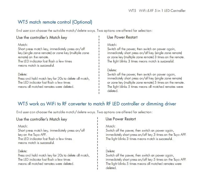 Нажмите и удерживайте кнопку соответствия WT5 в течение 20 секунд. Светодиодный индикатор быстро мигнет несколько раз, что означает, что все согласованные пульты дистанционного управления были удалены.