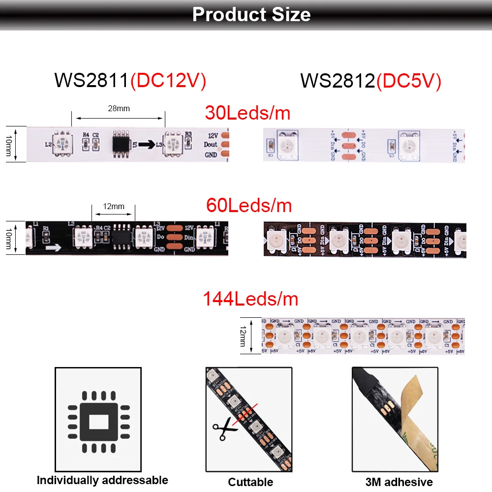 Ширина FPC: 30 светодиодов/M --- 10 мм/60 светодиодов/M --- 10 мм/144 светодиода/M --- 12 мм