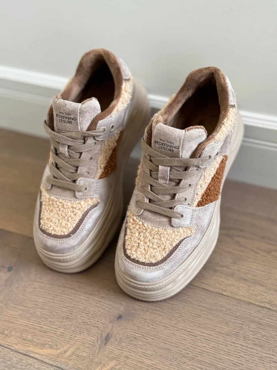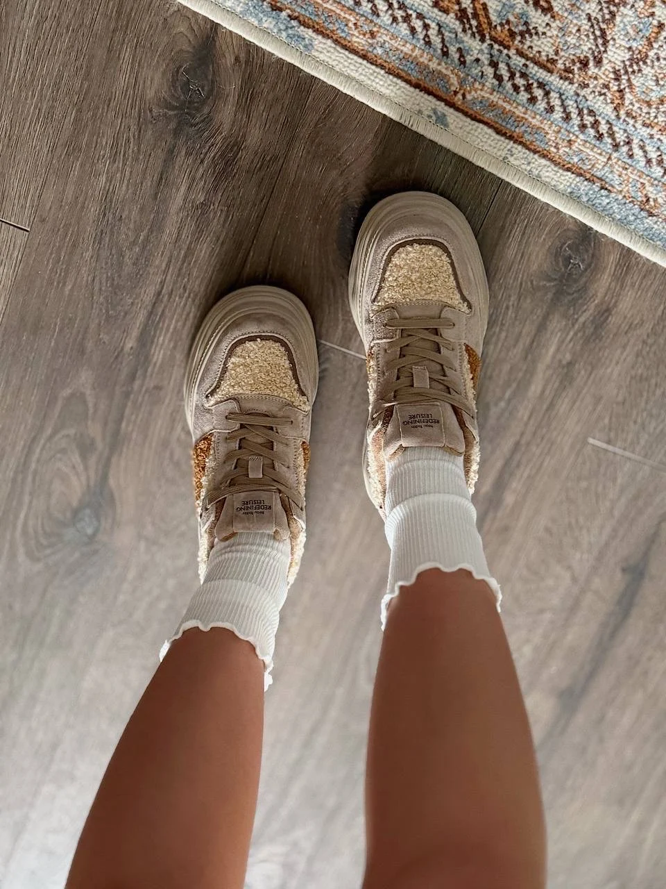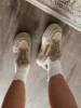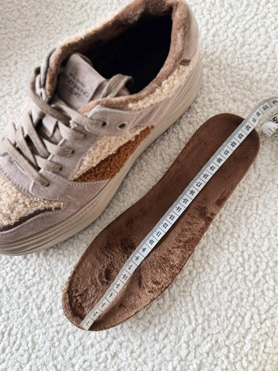 Чудеснве плюшевые кроссовки. Подойдут на холодную осень/теплую зиму. Размер 38 подошел на стопу 24 см, но без запаса. Если хотите носить с теплым носочком, то лучше брать на 0,5 см побольше. Качество прекрасное. Пришли в фирменной коробке и пыльниках.