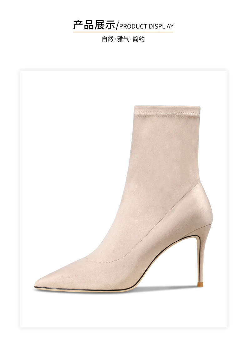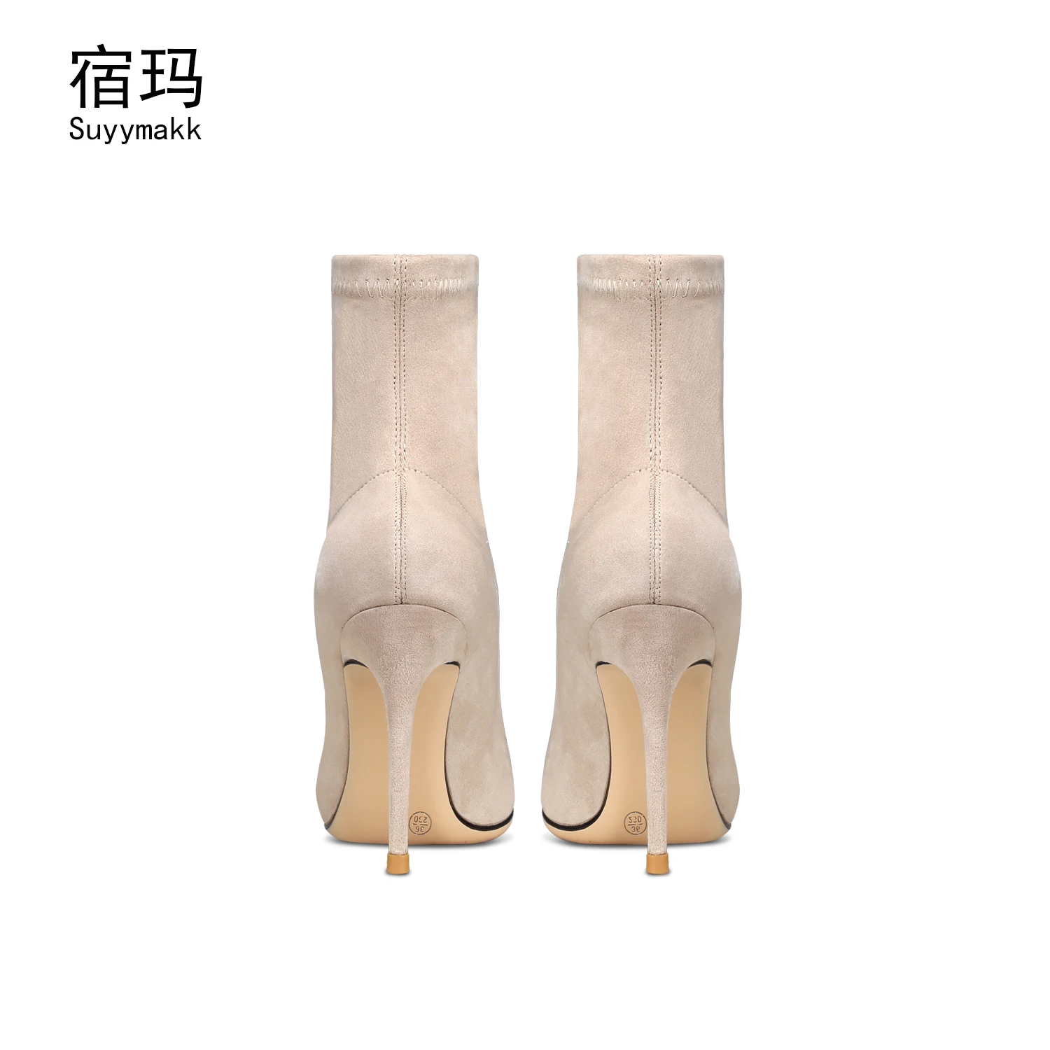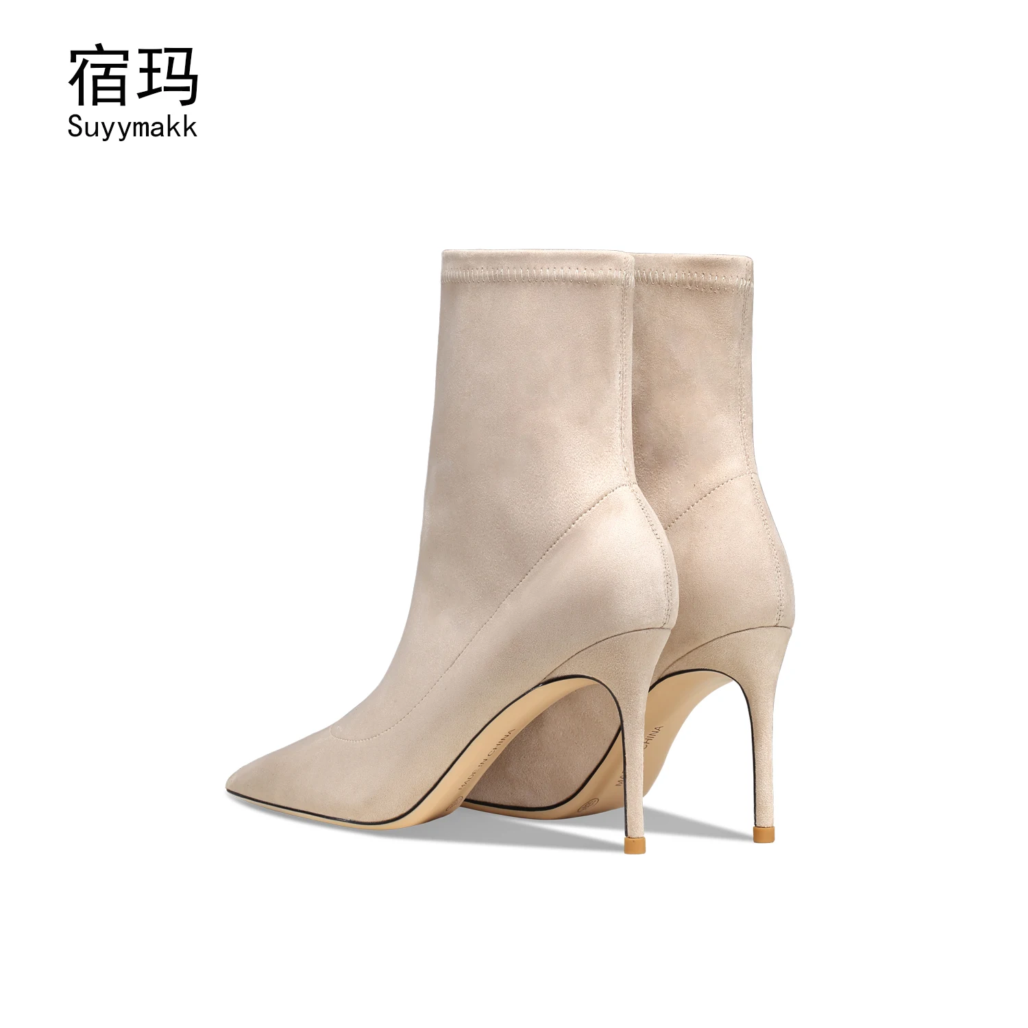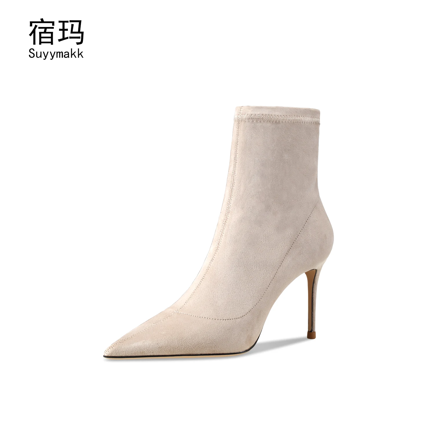 Женские высокие сапоги 2025 Новые осенние теплые эластичные ботинки-носки с острым носком на каблуке Черные замшевые зимние ботильоны на шпильке Сексуальные ботинки