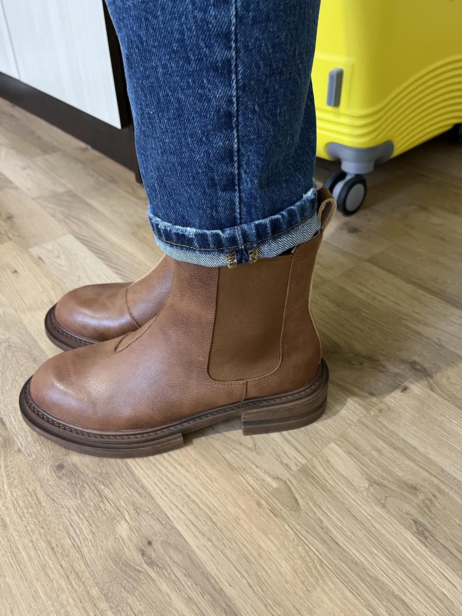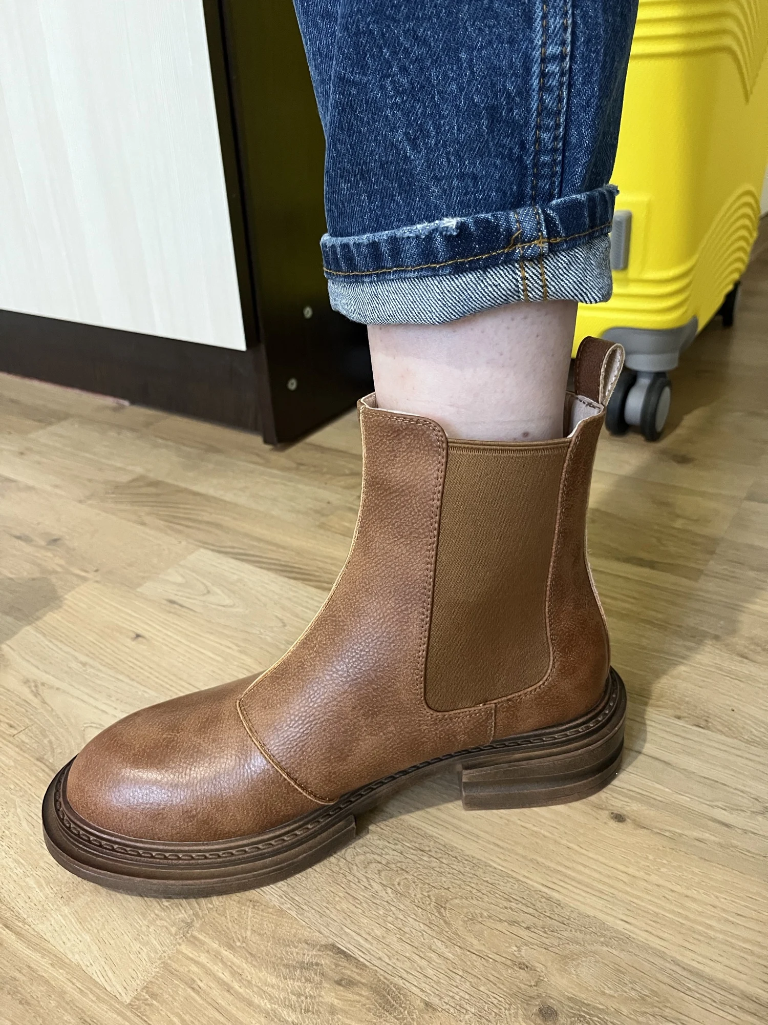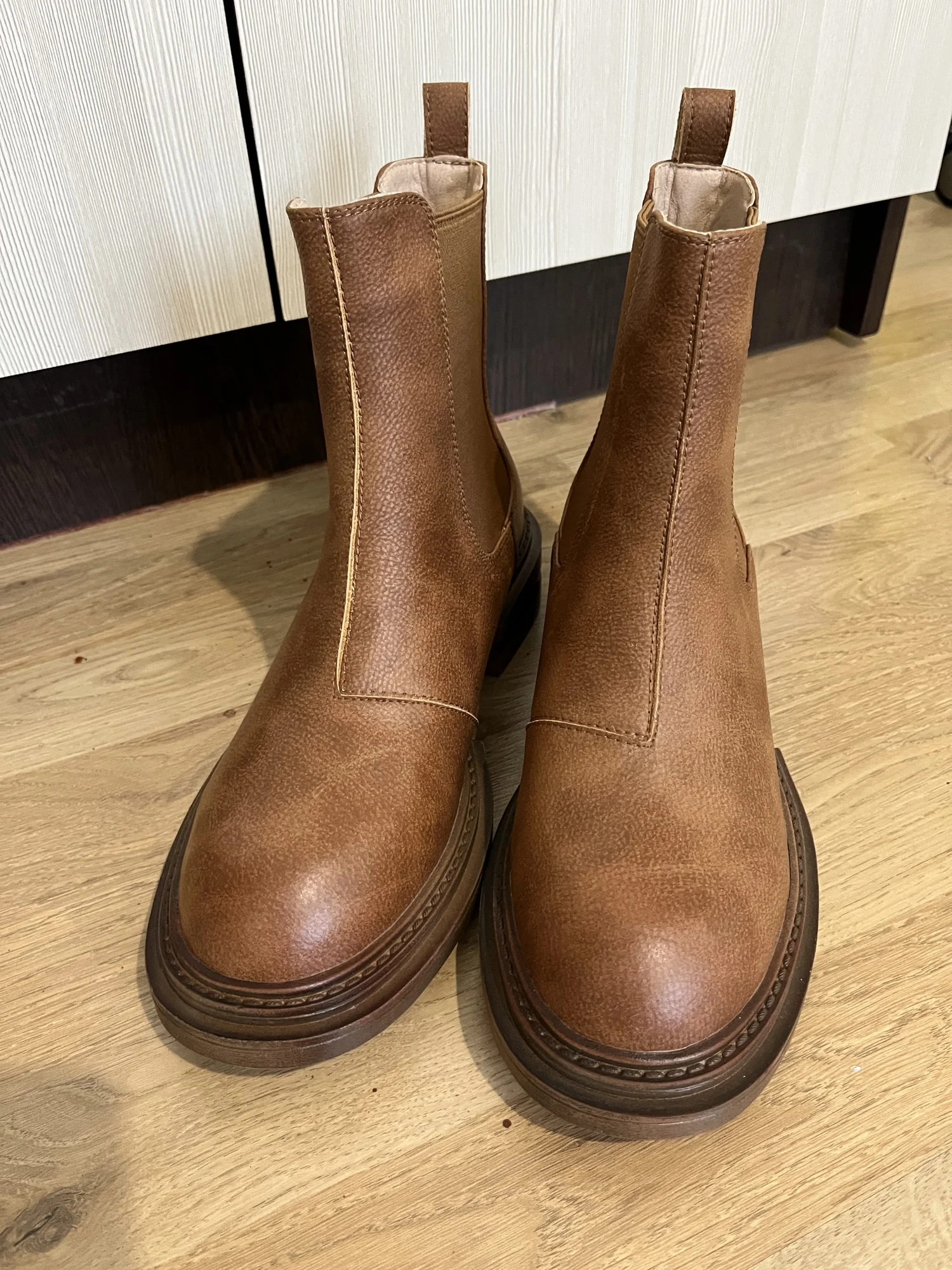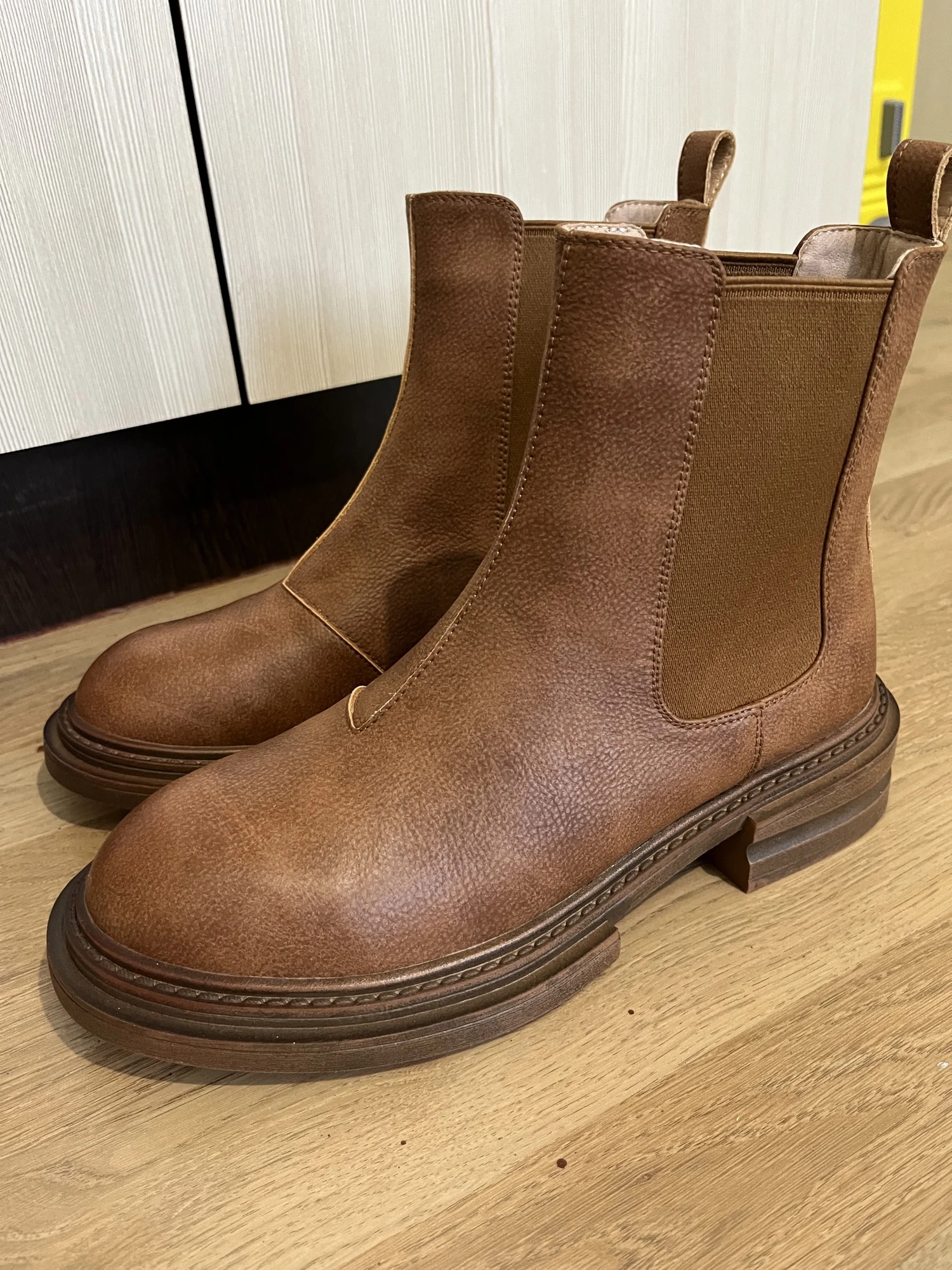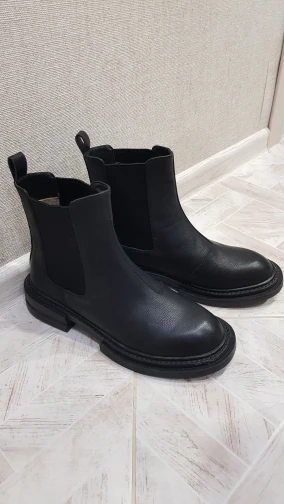 Я в восторге от этих челси! Заказ сделала 12.11., прибыл на почту 27.12, полтора месяца шел, с продавцом не общалась. Продавец упаковал обувь хорошо, чтобы не помялись, имеются пыльники и наполнители внутри. Мои ожидания оправдались. Цвет чуть светлее чем на карточке товара и матовый, но несмотря на это мне очень понравились сапоги. Никаких следов клея и постороннего запаха, только запах новой кожи. Подошва из резины, не жесткая, подкладка тонкий плющ, стельки вообще супер, мягкие, амортизирирующие, ткань стельки тоже что, то похожее на плющ, вобщем искуственная, но внутри неё такой наполнитель, который при ходьбе дает пружинистость и за счет этого так приятно ходить в этой обуви. Носок и пятка картон, потому что один носок при упаковке продавцом немного помялся, я его выпрямила, при носее нужно быть аккуратнее с носком. Обувь сама не тяжелая, на российкий 38й размер 24,5см взяла 39, нигде ни давит, ни жмет, с тонким носком в самый раз, у меня средняя стопа. На весу, осень, а может и на теплую зиму пойдет. Но обязательно обрабатывать водоотталкивающим спреем, такое ощущение, что кожа в дождь быстро пропитается водой. Спасибо продавцу за такой товар, всем рекомендую.Zamira A. 5 января 2023