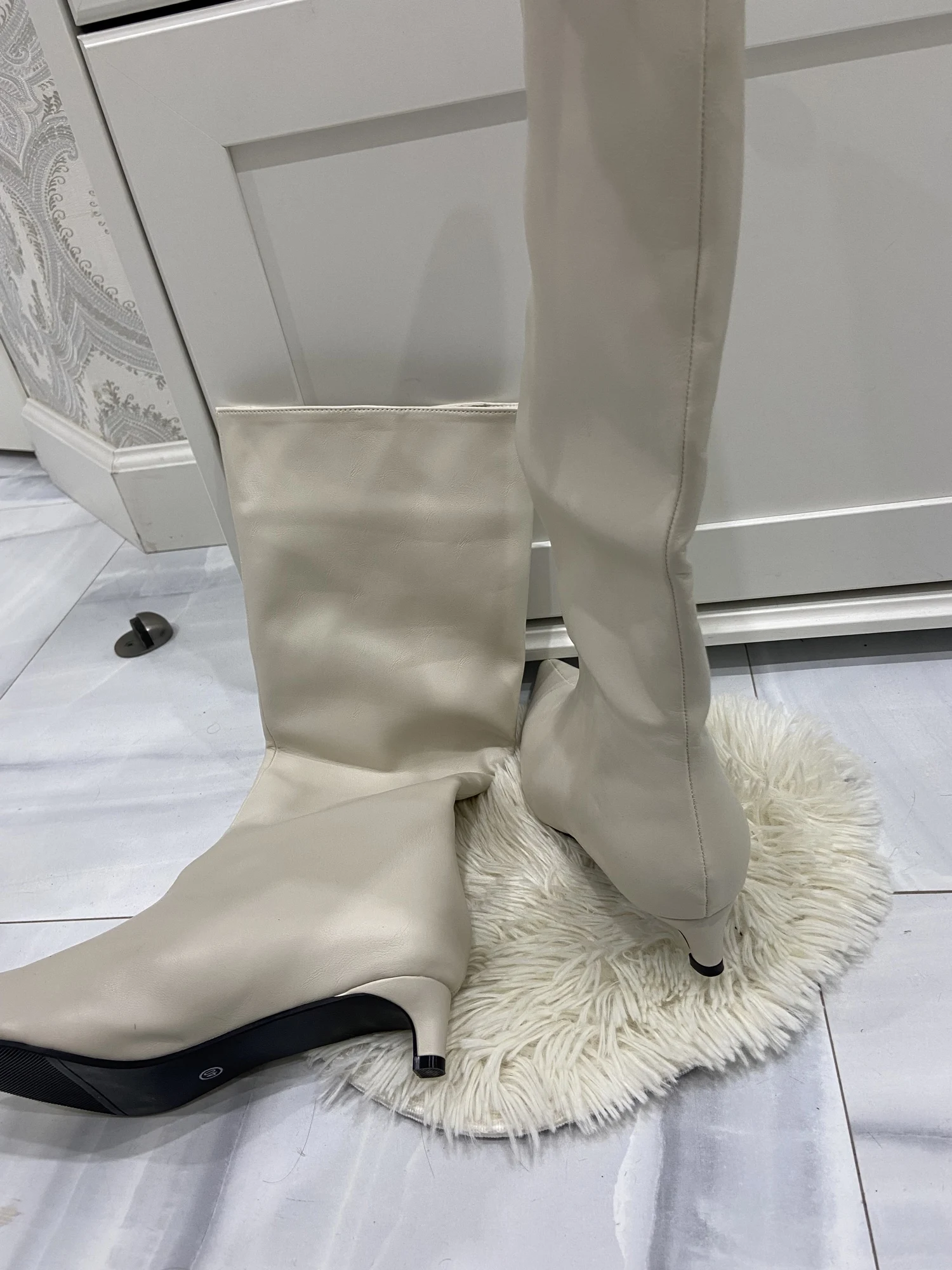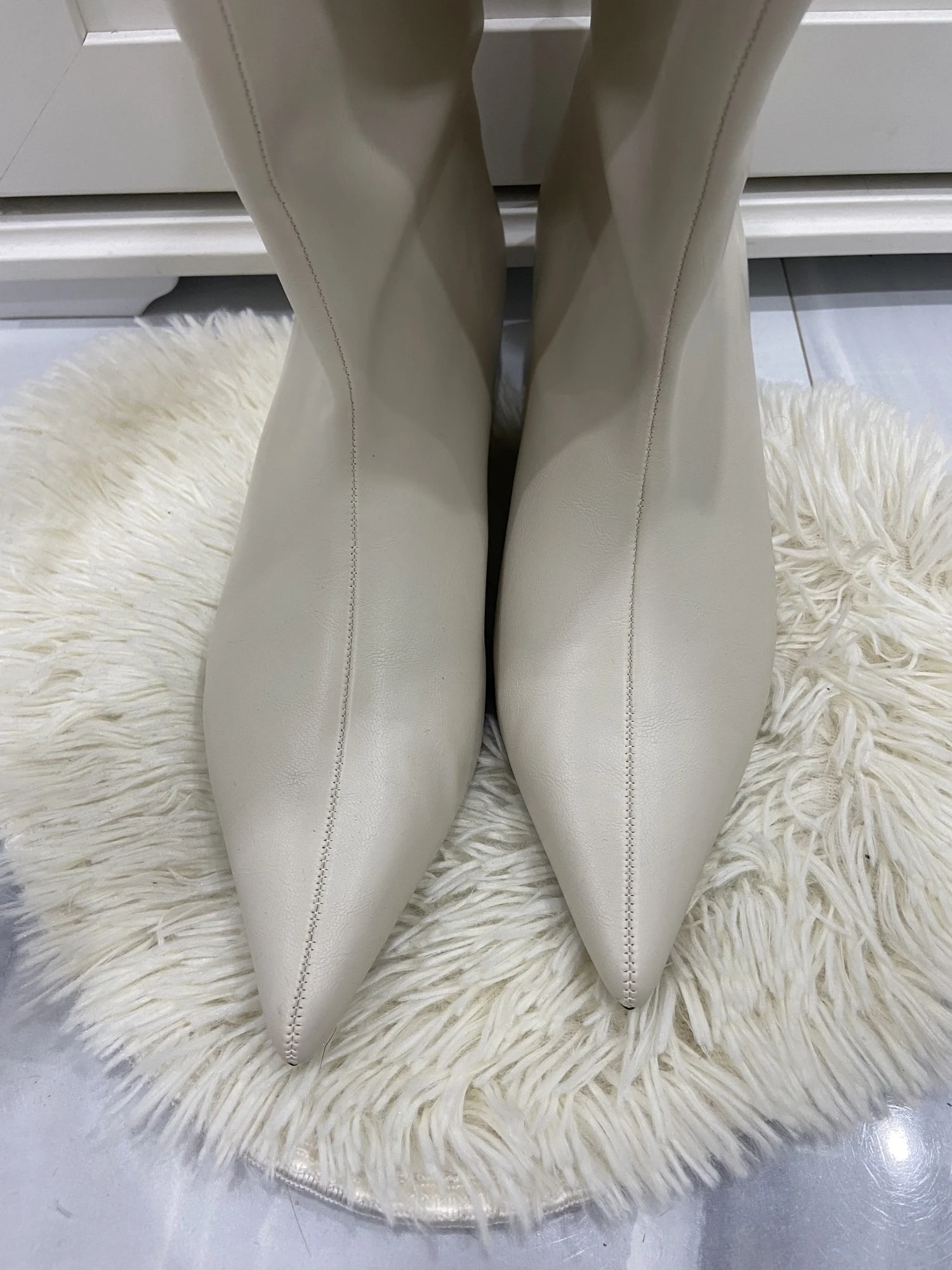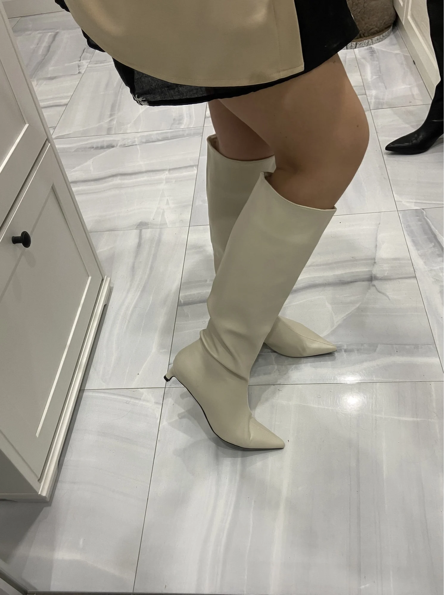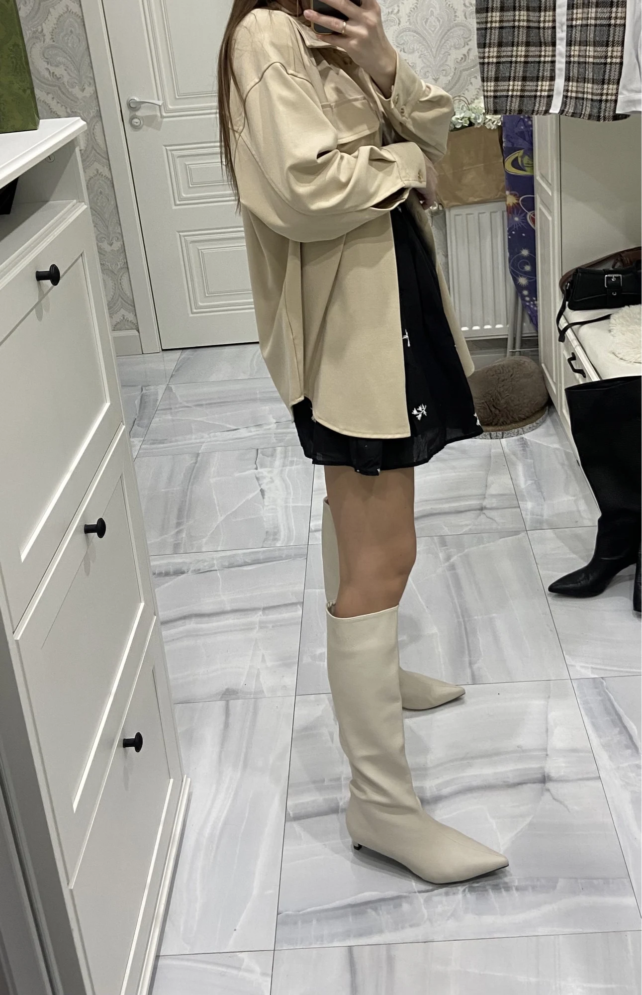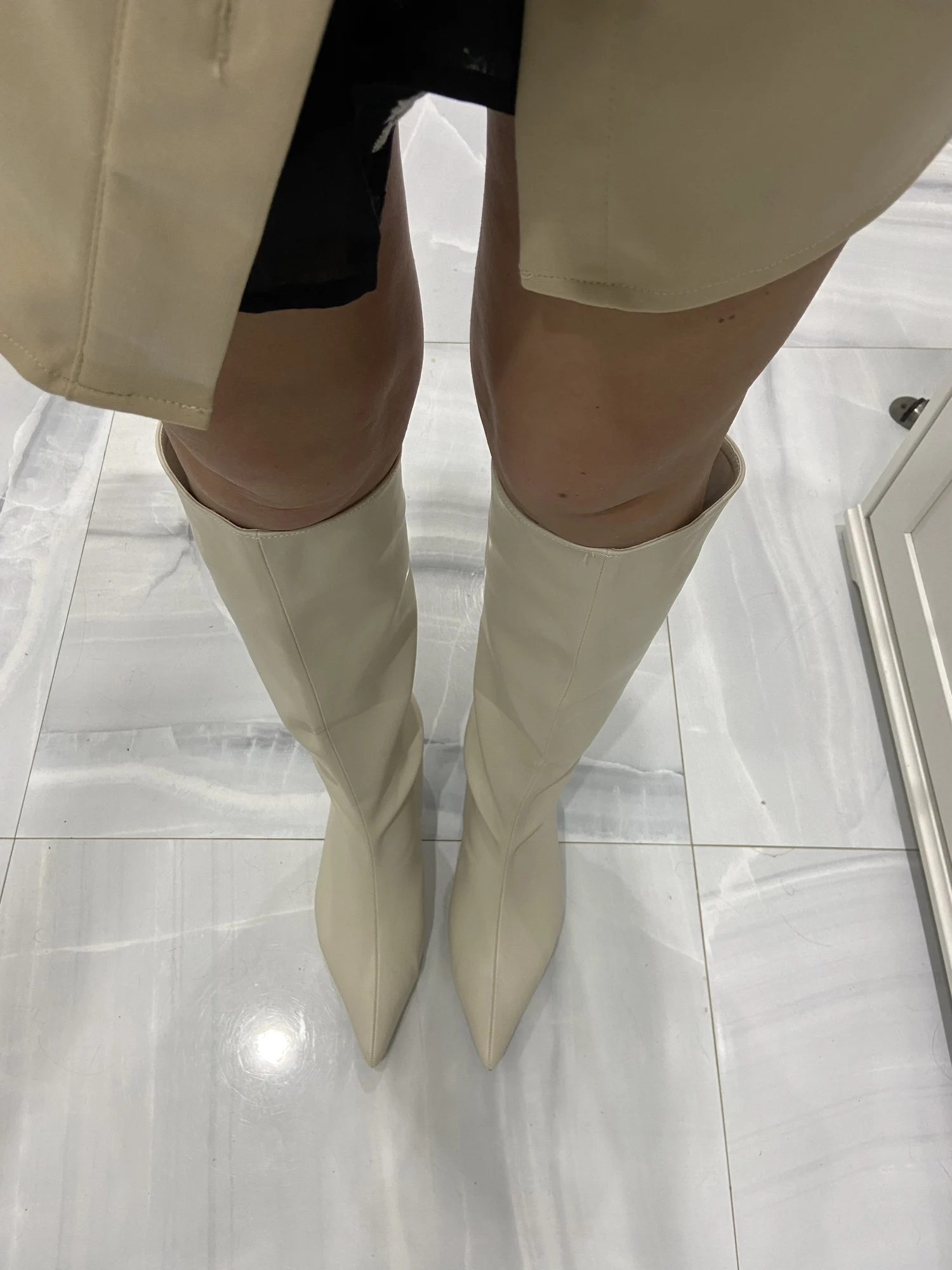 Высокие сапоги в белом цвете Сделаны из искусственной кожи, но выглядят очень достойно. Сшиты качественно, придраться не к чему. Лишь одна просьба - высылайте обувь в воздушных боксах. Уже все магазины отправляют так свой товар. Из-за того, что сапоги были в сложенном виде, у них остался залом Цвет без желтизны, как я и хотела. Ходить в них одно удовольствие , безумно удобные. На длину стопы 22,5 см взяла размер 35, подошел прекрасно В этом магазине обувь всегда идет размер в размер, поэтому не нужно брать больше.
