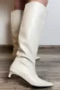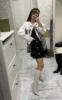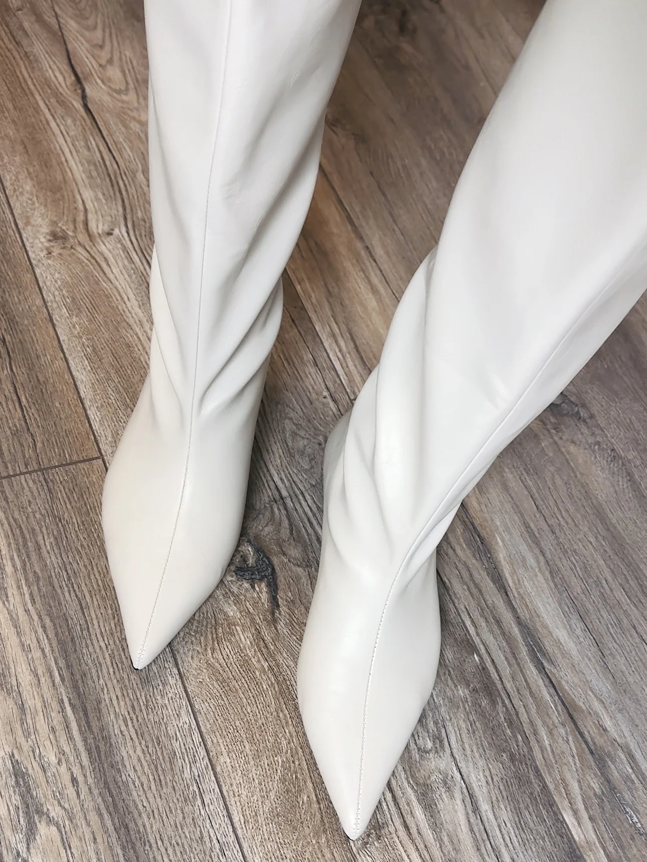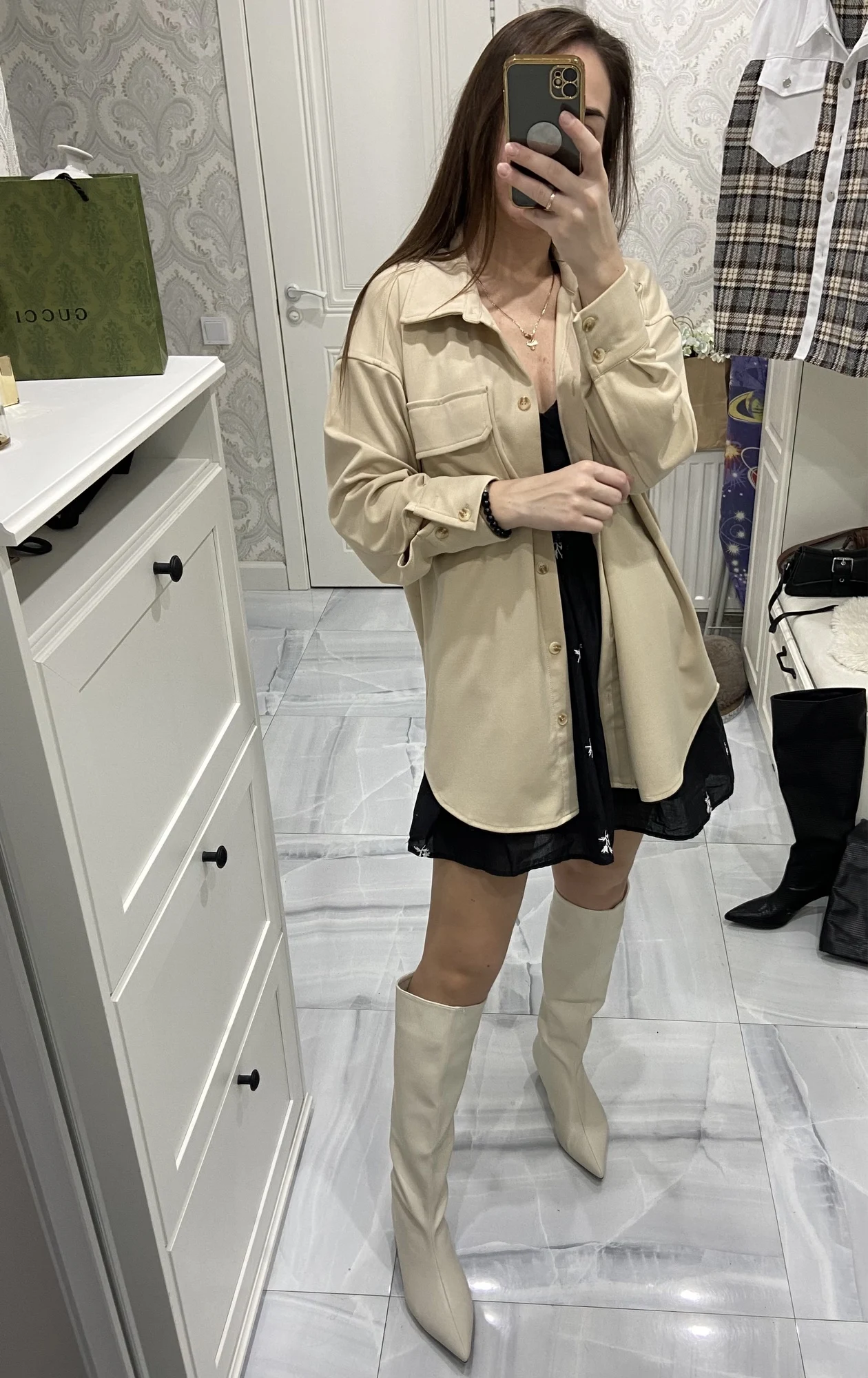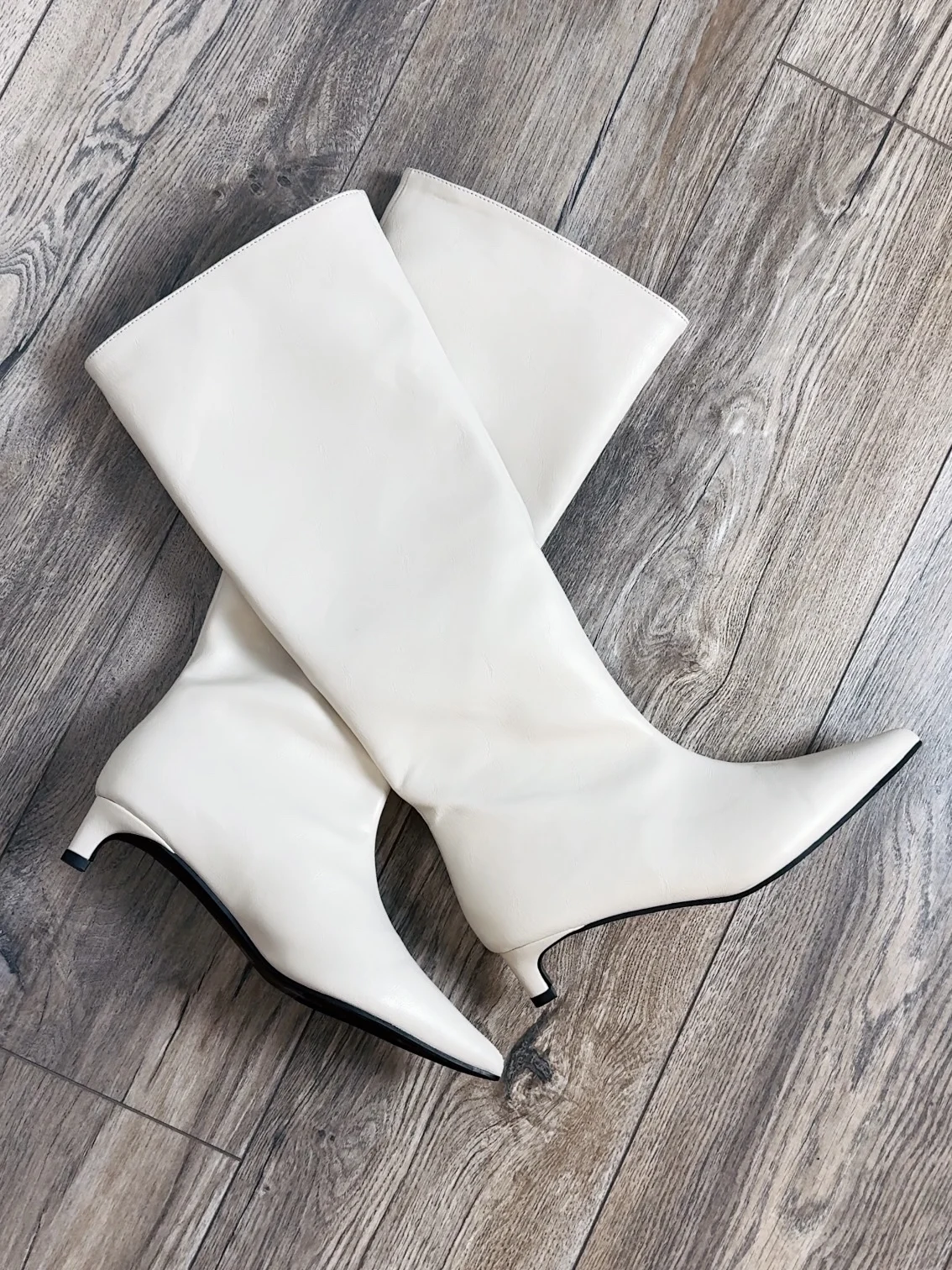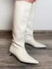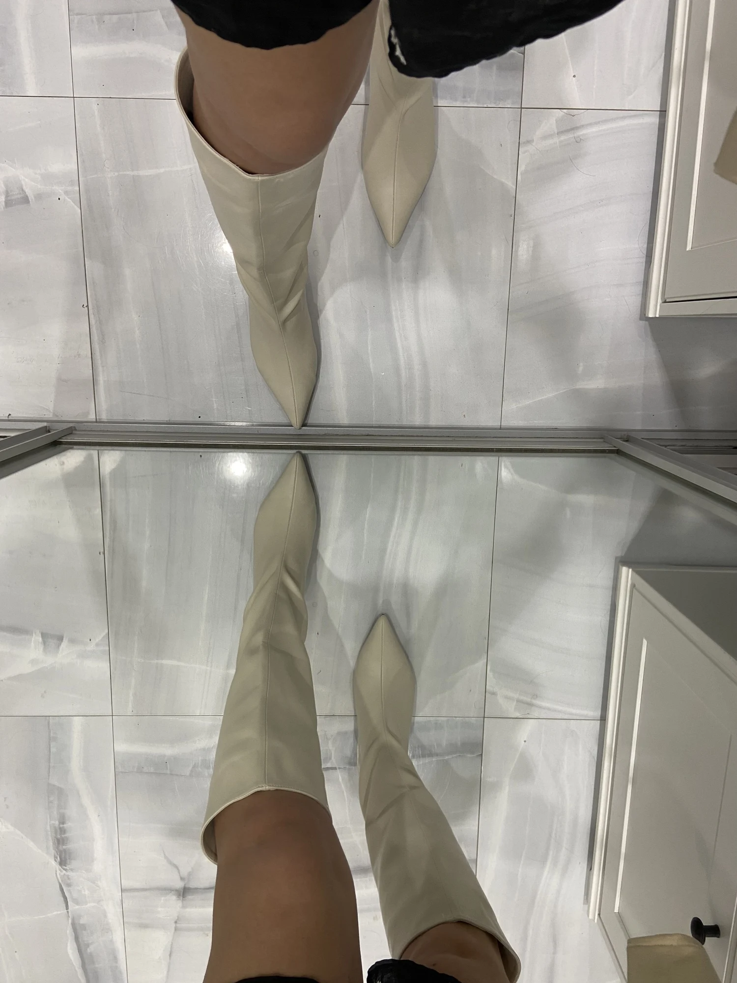 Высокие сапоги в белом цвете Сделаны из искусственной кожи, но выглядят очень достойно. Сшиты качественно, придраться не к чему. Лишь одна просьба - высылайте обувь в воздушных боксах. Уже все магазины отправляют так свой товар. Из-за того, что сапоги были в сложенном виде, у них остался залом Цвет без желтизны, как я и хотела. Ходить в них одно удовольствие , безумно удобные. На длину стопы 22,5 см взяла размер 35, подошел прекрасно В этом магазине обувь всегда идет размер в размер, поэтому не нужно брать больше.