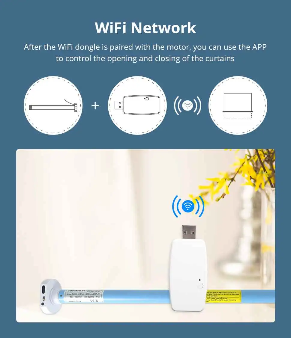 - With WiFi Dongle: Work with WiFi 2.4GHz, just connect the motor with Dongle(No hub required), you can control motor up or down through Voice or APP on your mobile phone.