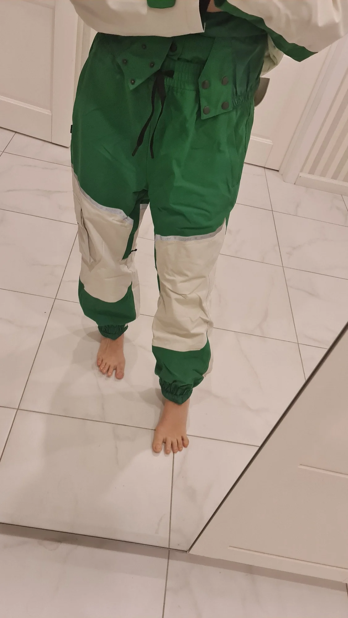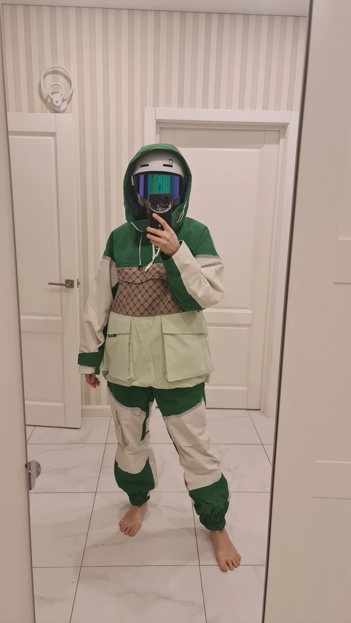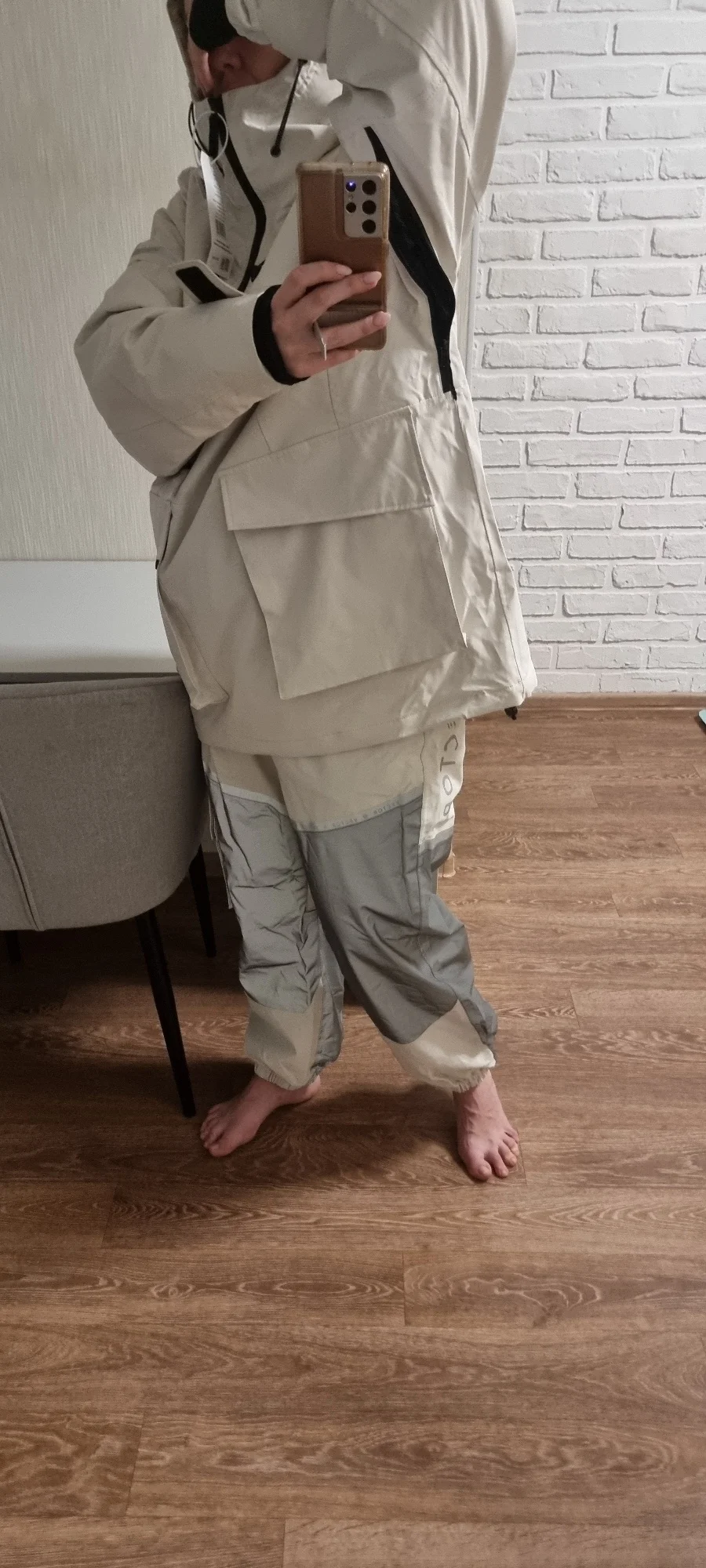 костюм шикарный! Всё детали продуманны. Заказывала специально оверсайз, но кажется переборщила 😅 Куртка удобная, внутри на спине сеточка, снизу резинка с заклёпками чтобы плотнее сидело. Спереди два накладных кармана на липучке и большой карман на груди на молнии. На рукавах липучки, внутри вшивной рукав с дырочкой под большой палец. Подкладка очень приятная на ощупь. Штаны на резинке, без молнии в причинном месте (важно доя мужчин 😳). Есть дополнительный слой защиты от попадания снега на поясницу- на клепках и можно утянуть по себе. так же можно отстегнуть этот слой. снизу на резинке
