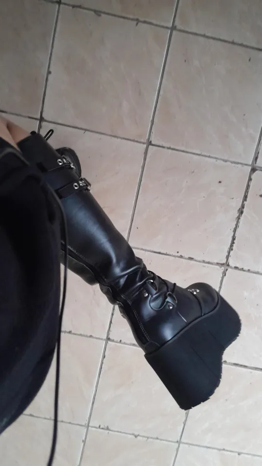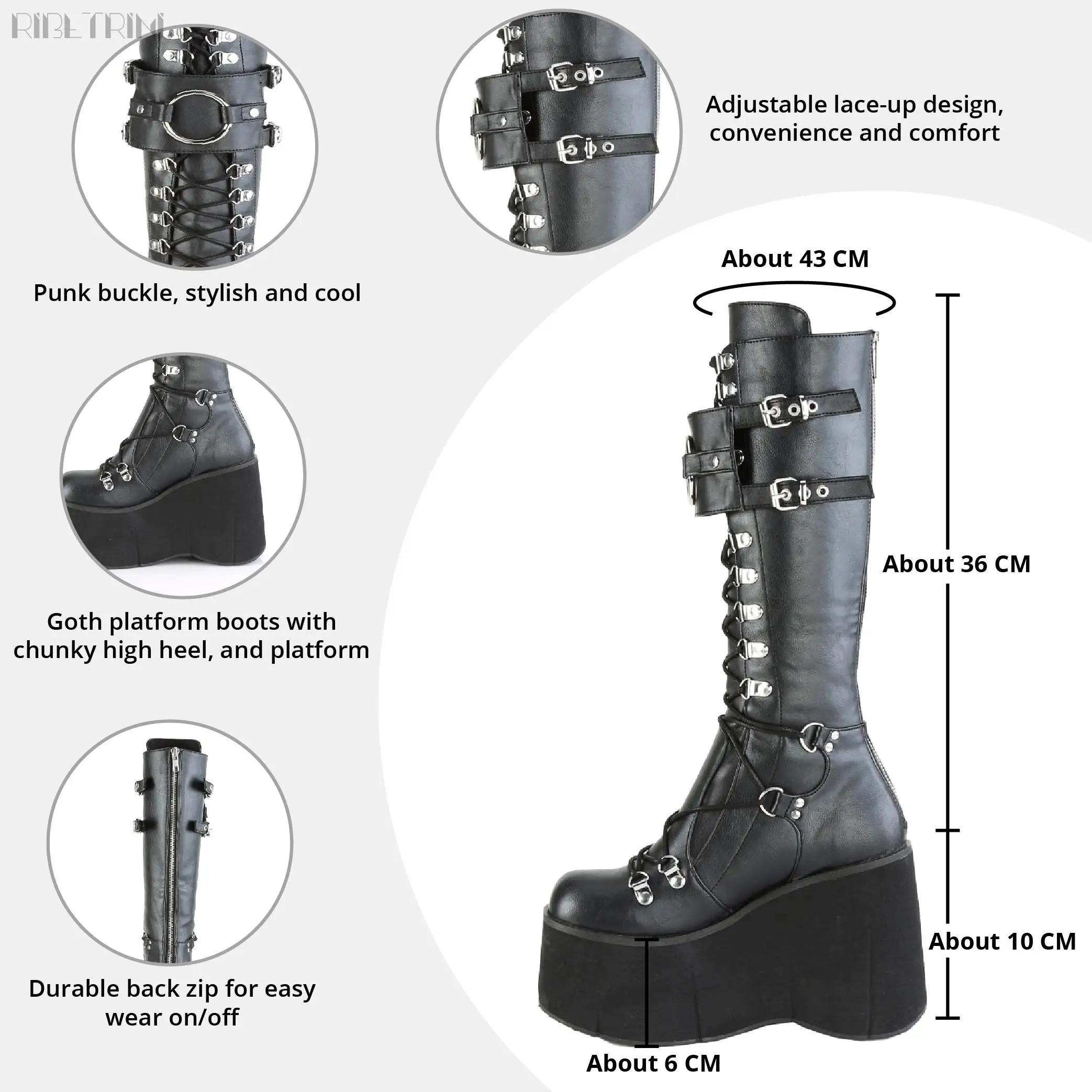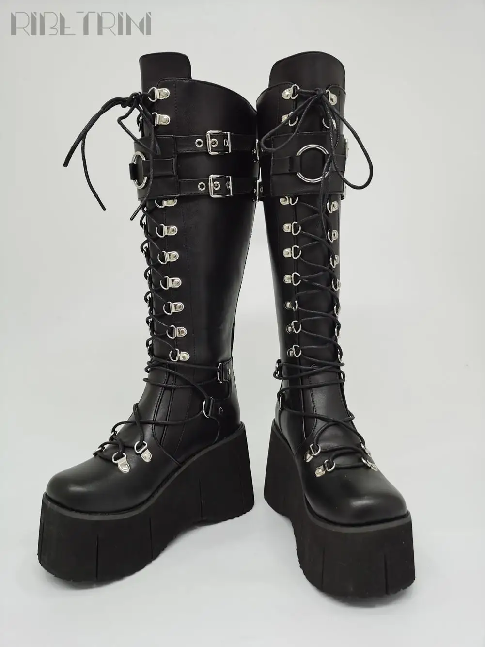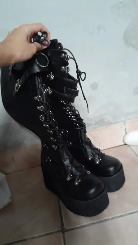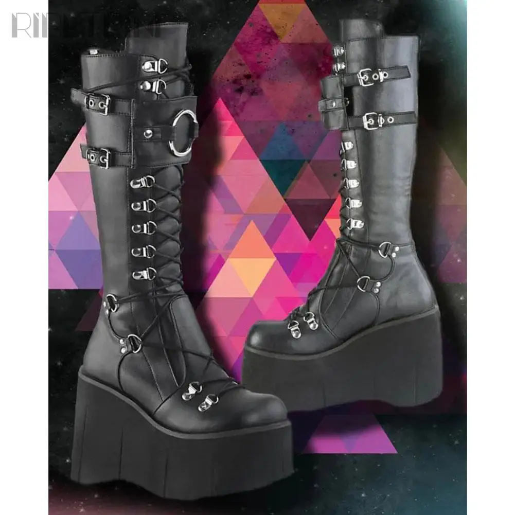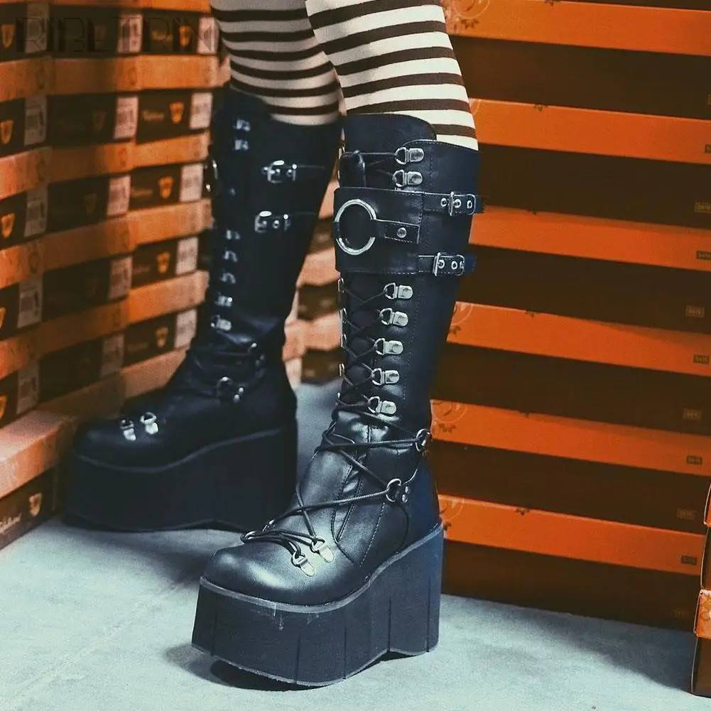 INS Brand New Womens Thigh High Combat Boots Women Lace Up Zip Thick Wedges...