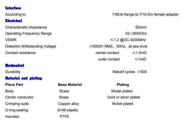 Материал и материал покрытия Покрытие корпус латунь ниизолятор PTFFE-Центральный проводник фосфористая бронза Соединительная гайка латунь силиконовая резина-