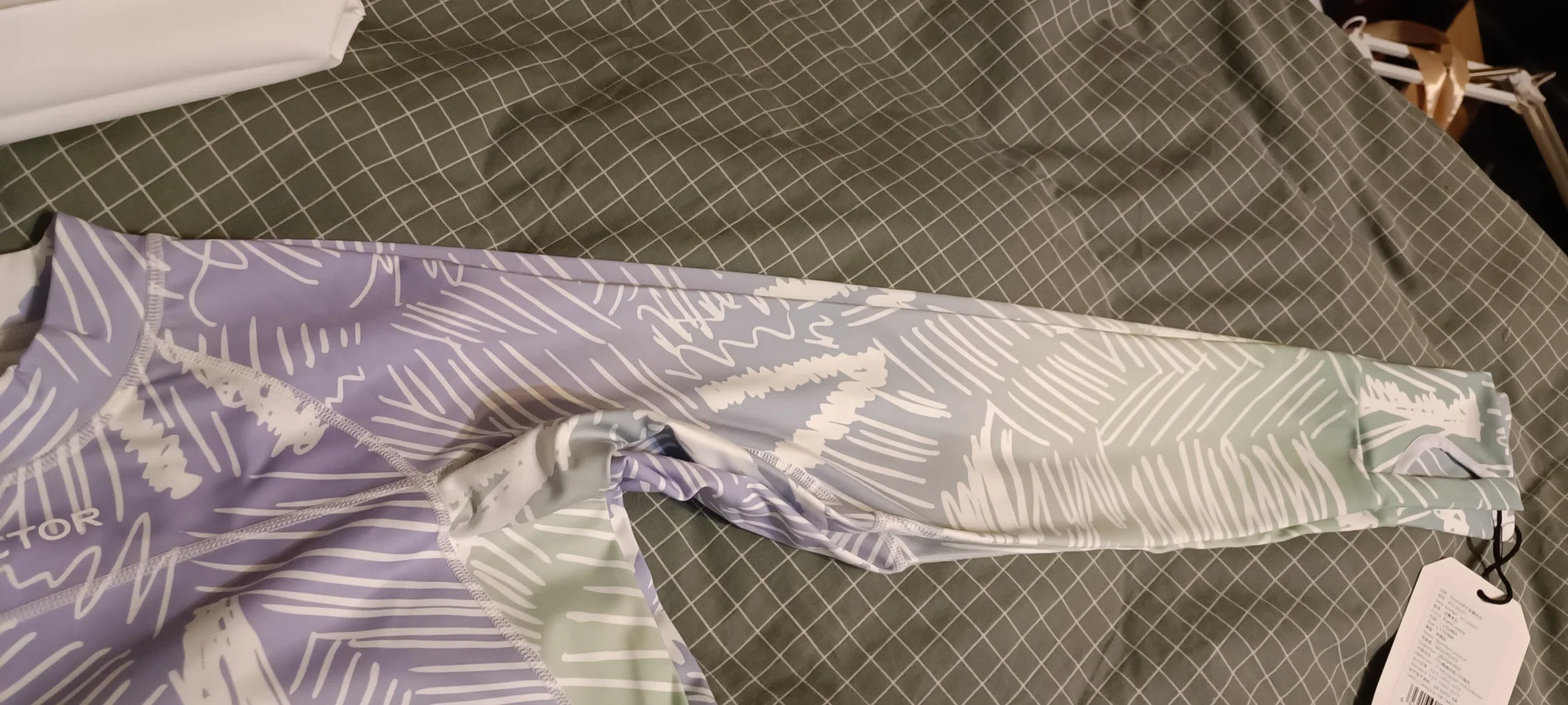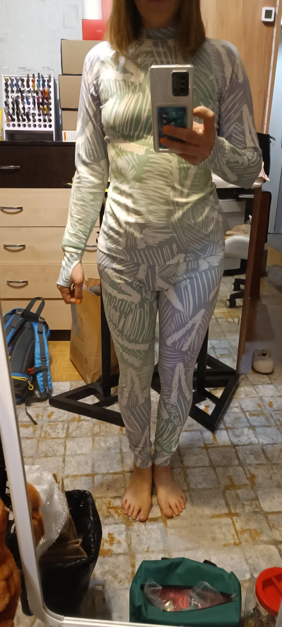 На свои параметры 86/66/89 см, грудь 75С и рост 160 см заказала комплект в размере М. По росту и обьемам талии в лонгсливе и лосинах есть запас и на бОльшие параметры. Хорошая длина рукавов - с запасом. Лосины по длине также с запасом на мой рост - при этом посадка комфортная, меньше бы брать не стала из-за широких плеч и груди. Состав: 77% полиэстер, 23% спандекс. Материал невероятно причтный к телу и очень комфортный. Прекрасная эластичность. Пошив идеальный. На рукавах имеются манжеты с прорезями для пальцев - ничего не врезается и не давит. Резинка на лосинах не давит и не передавливает - сидит на мои параметры свободно. На фото демострирую полную длину верха, а вообще верх заправляется в лосины - так носятся термокомплекты. Расцветка очень красивая, цвета насыщенные, не блеклые. В общем, костюм - просто восторг! Отдельное внимание - это упаковка! Непромокаемый кнйс на молнии - очень удобно хранить термо и эстетика этой упаковки - просто кайф!
