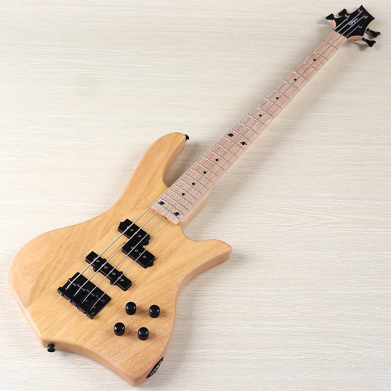Модель 2. Активная электрическая бас-гитара Okoume с 4-струнной отделкой из натурального дерева, матовой текстурой и неправильной формой.