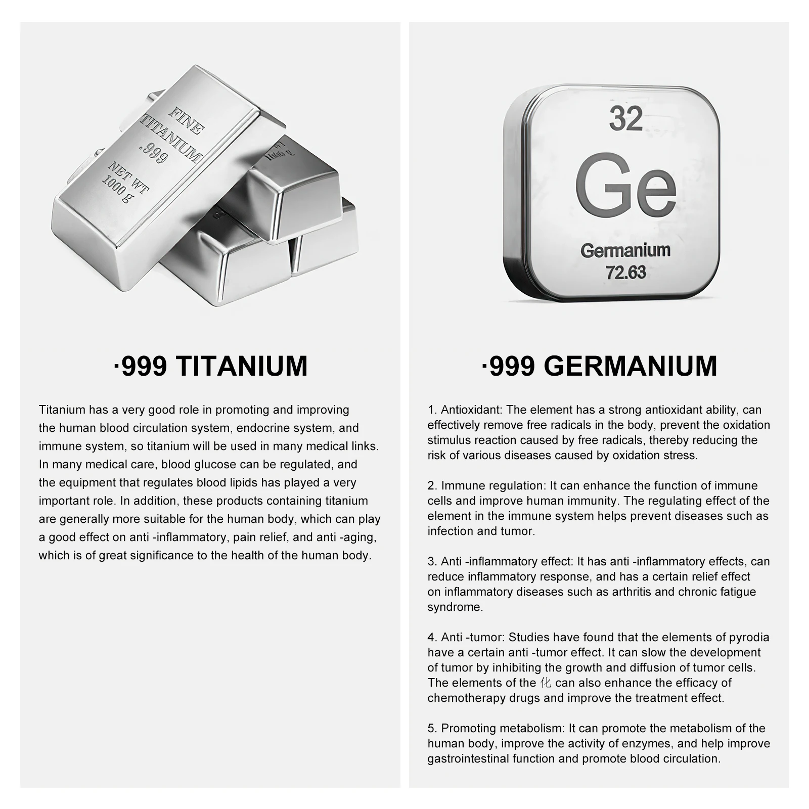 Германий-редкий полупроводниковый элемент, который имеет небольшую запрещенную зазор, что позволяет ему эффективно реагировать на инфракрасное излучение светильник. Две важные характеристики Германия, что касается здоровых функциональных эффектов,-это его естественная способность излучать отрицательные ионы и проникновение дальних инфракрасных лучей в организм человека.