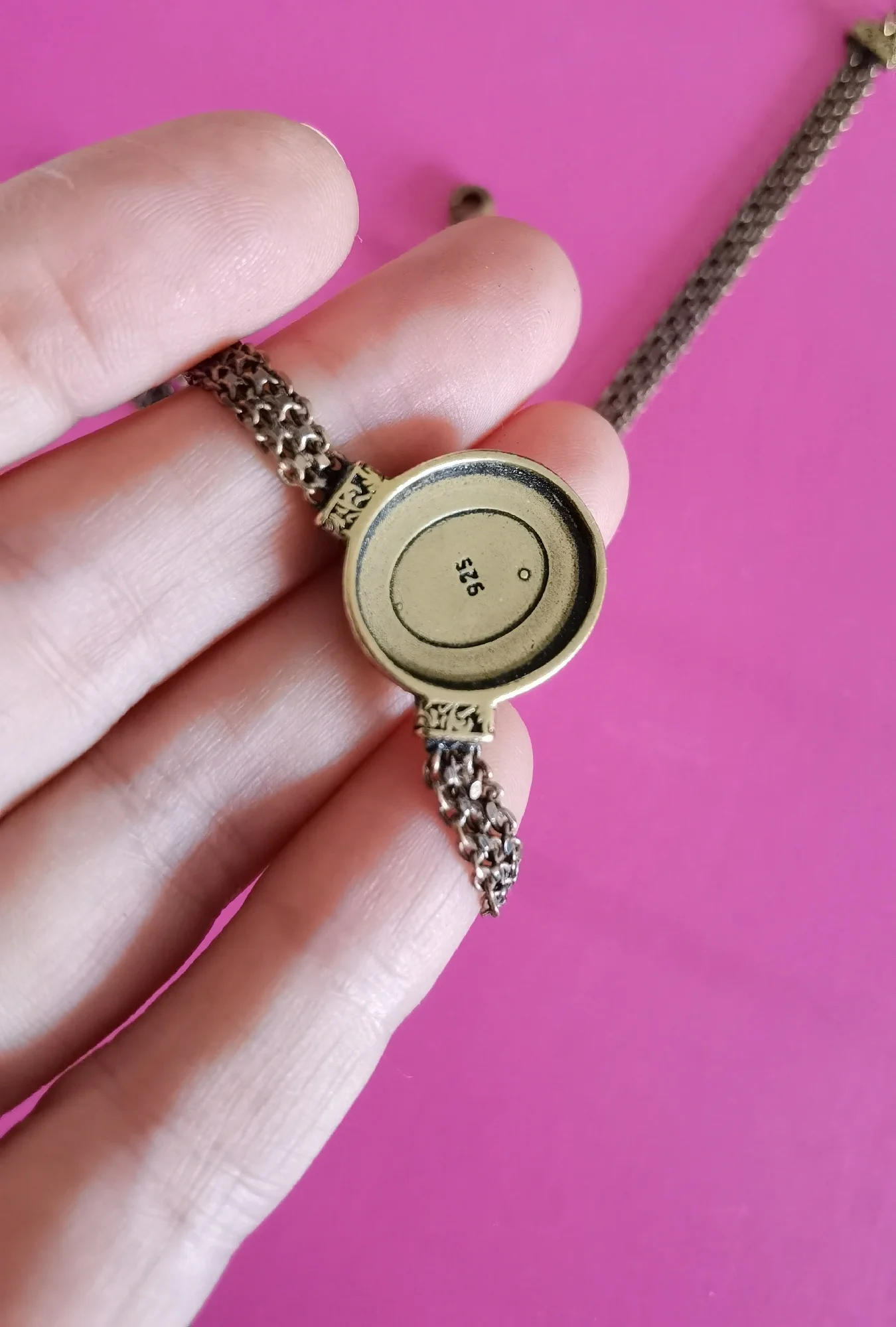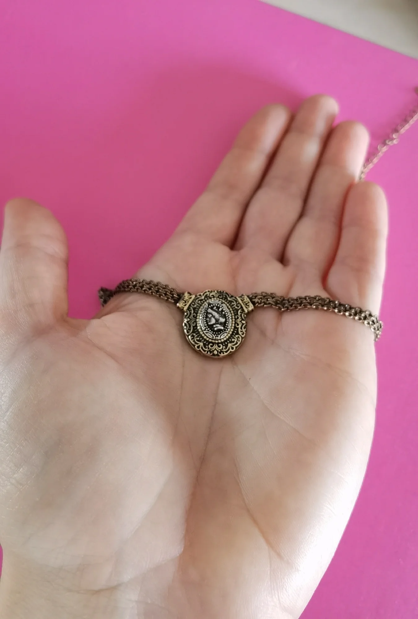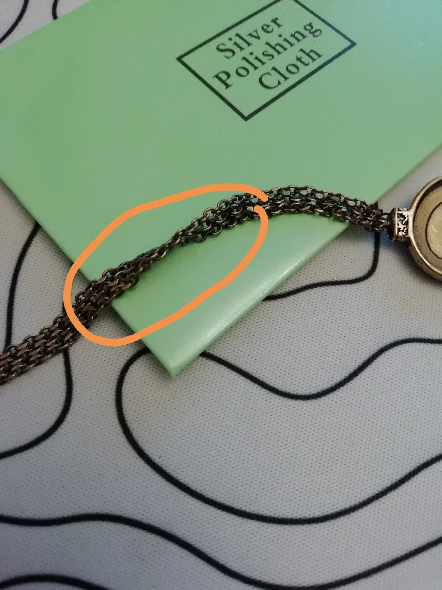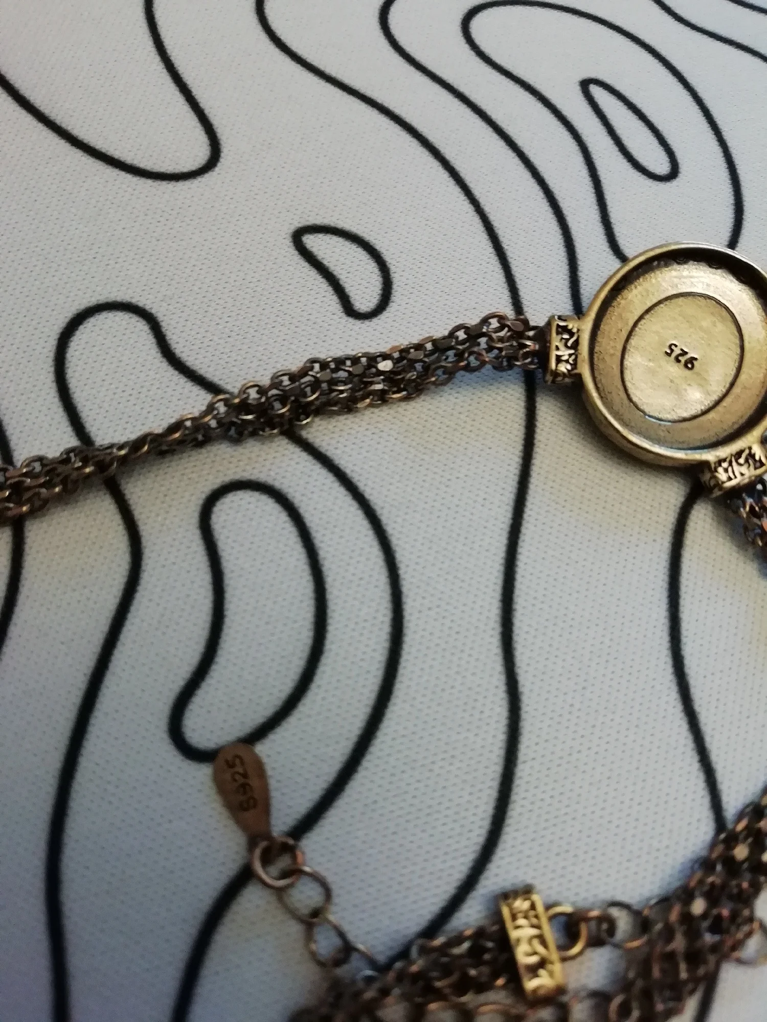 Смотрится очень красиво, винтажное золото с чернением, но основа коротковата, хорошо, что есть удлиняющая цепочка