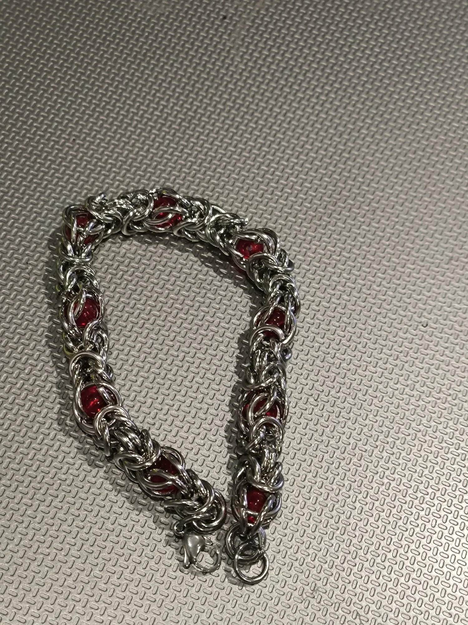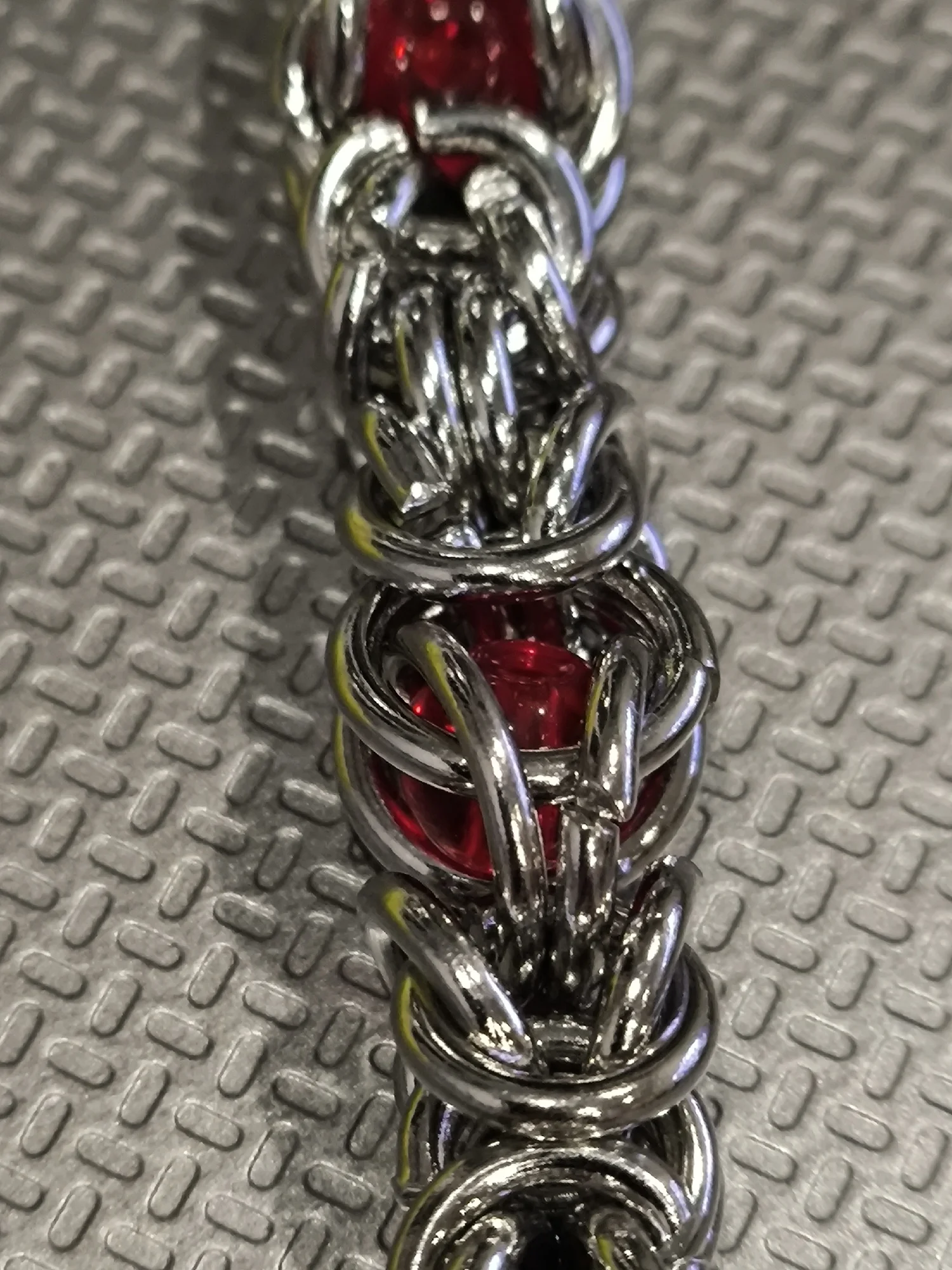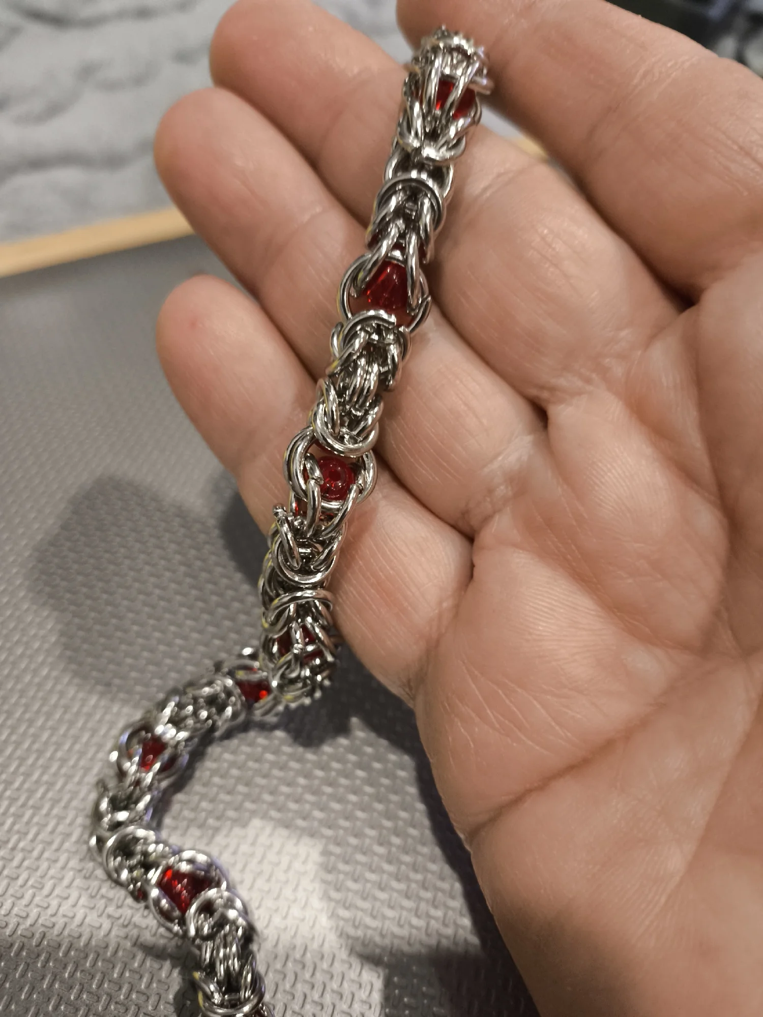 Цепь красивого серебряного цвета.Красные бусины пластик или стекло. Тяжеленький. Сделан качественно, не царапает.