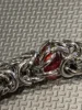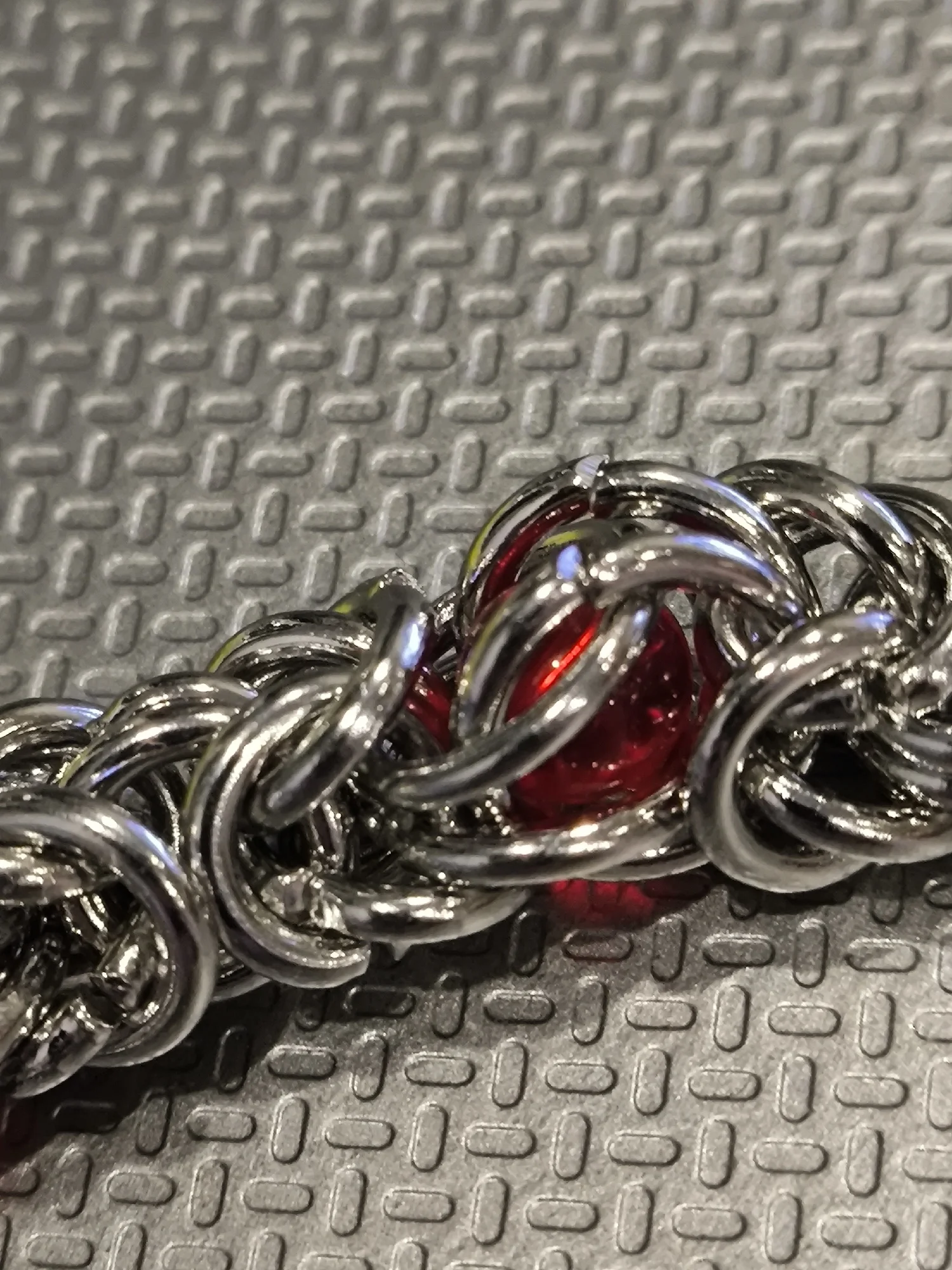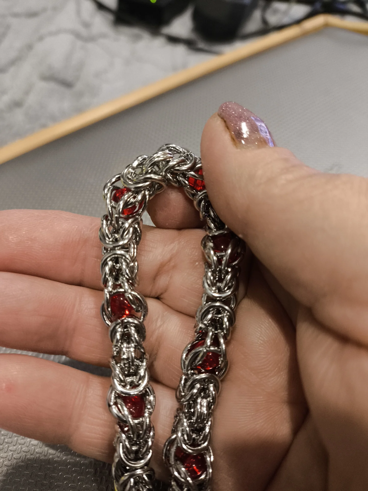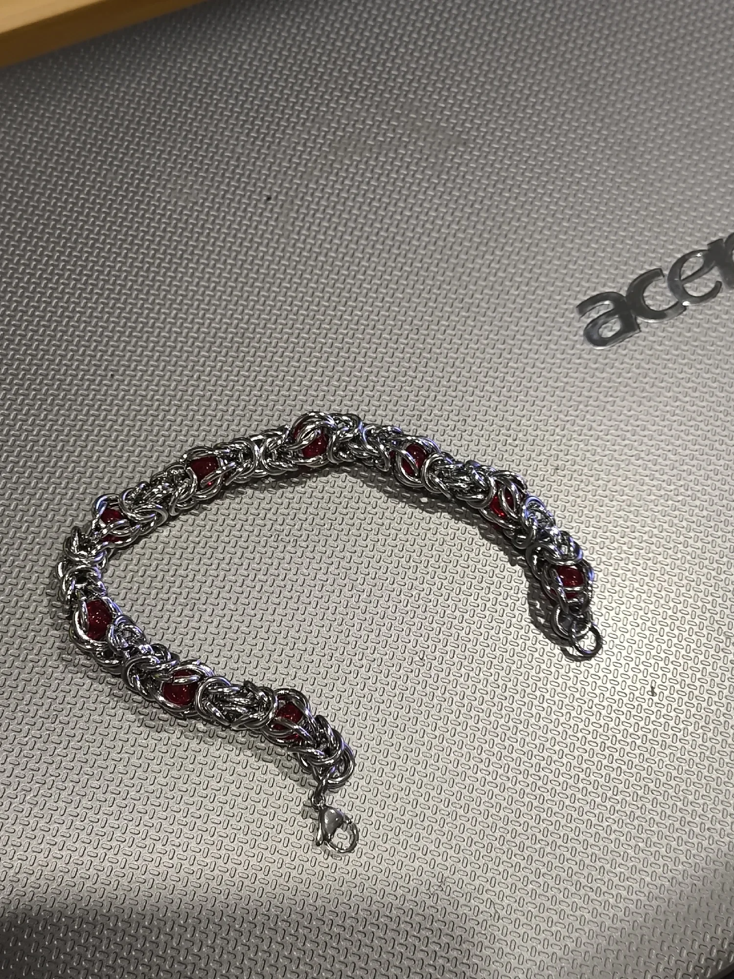 Цепь красивого серебряного цвета.Красные бусины пластик или стекло. Тяжеленький. Сделан качественно, не царапает.