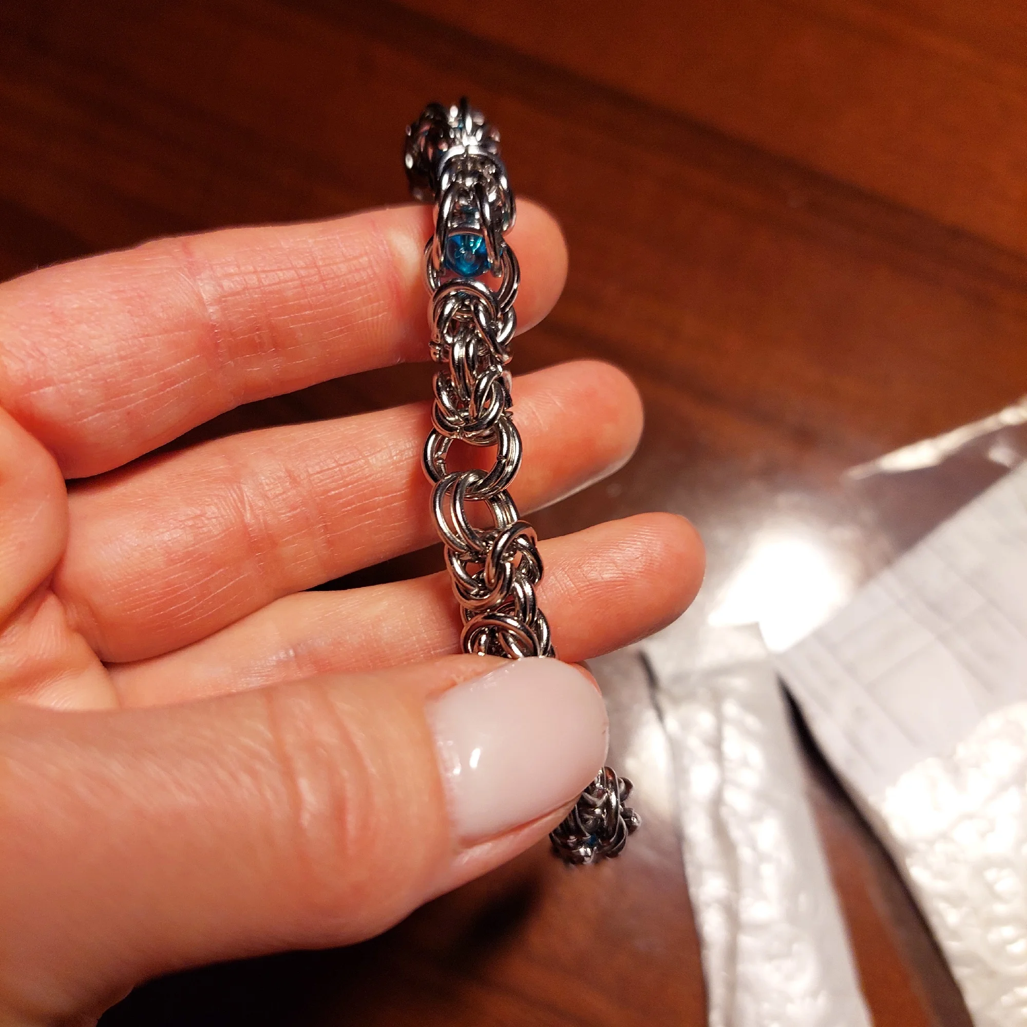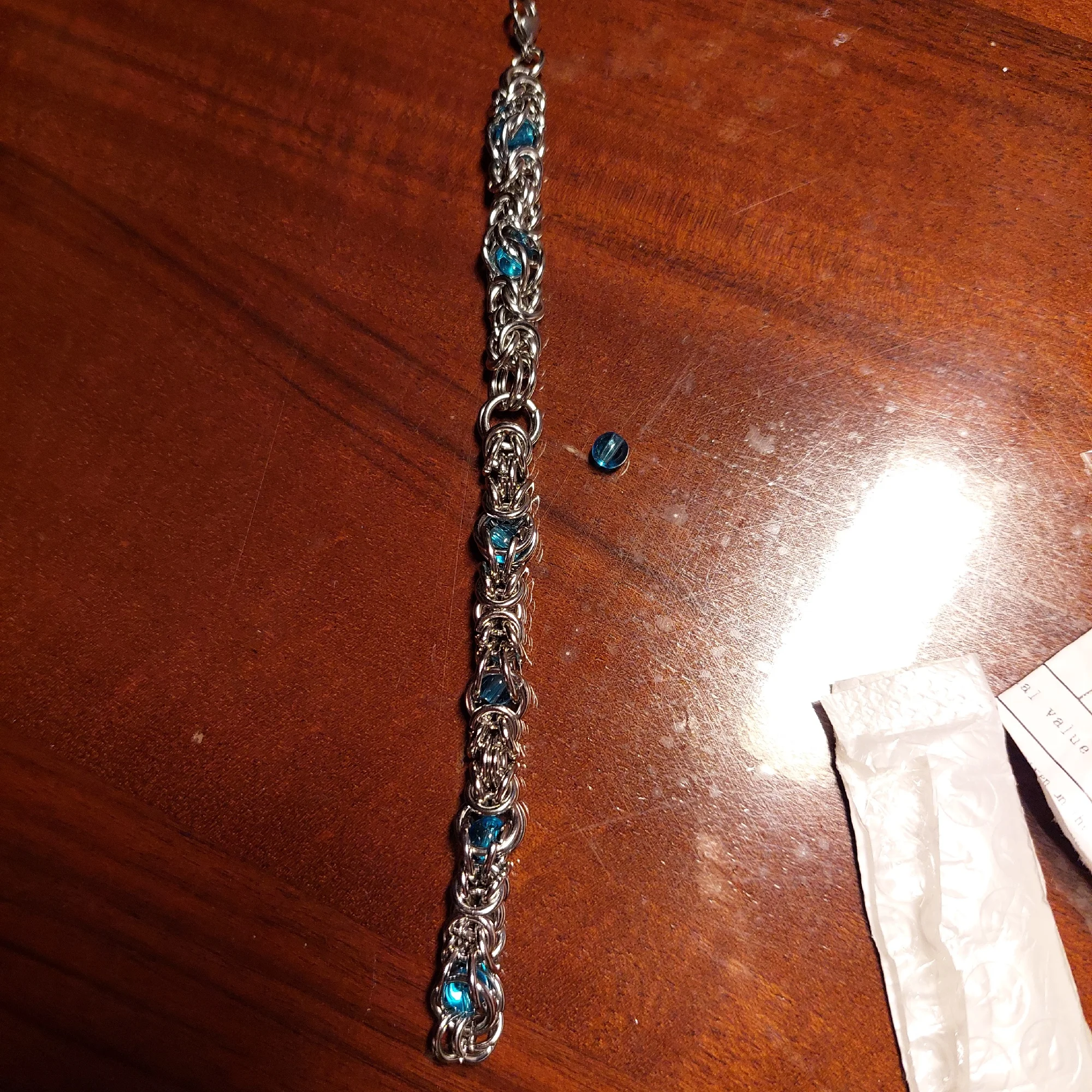 При распаковке в прозрачном пакетике одна бусина была отдельно. Оказалось, что она выпала из звеньев прямо посередине браслета!! Вставить её не удалось, носить браслет невозможно. Не рекомендую данный товар.