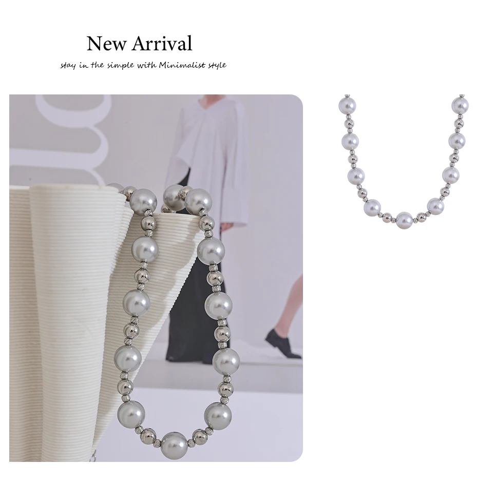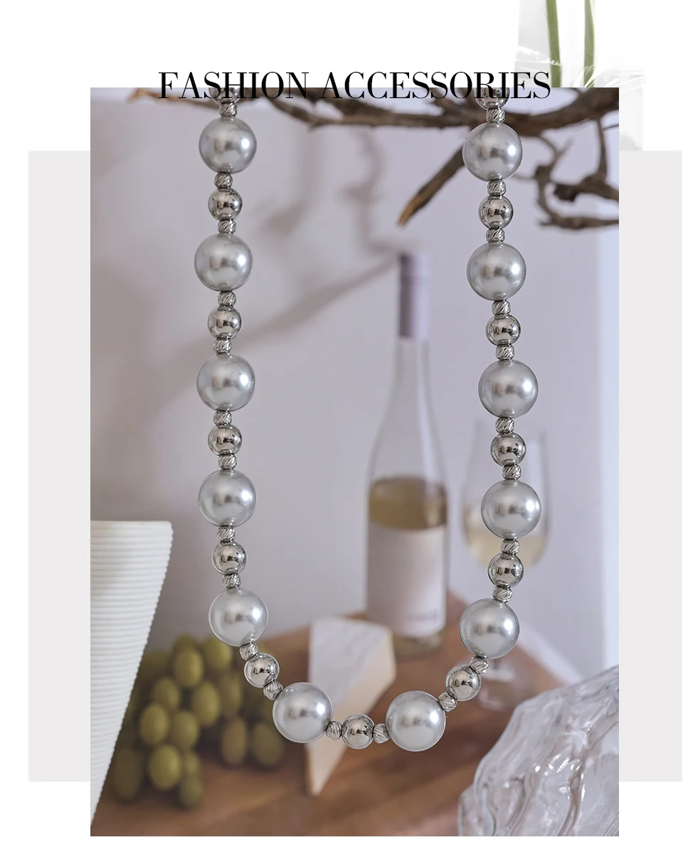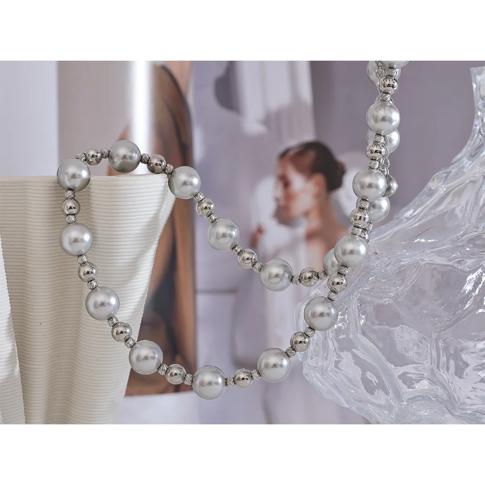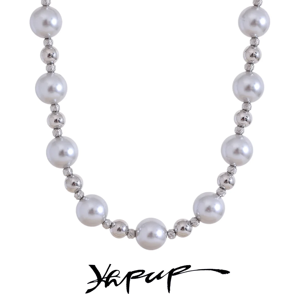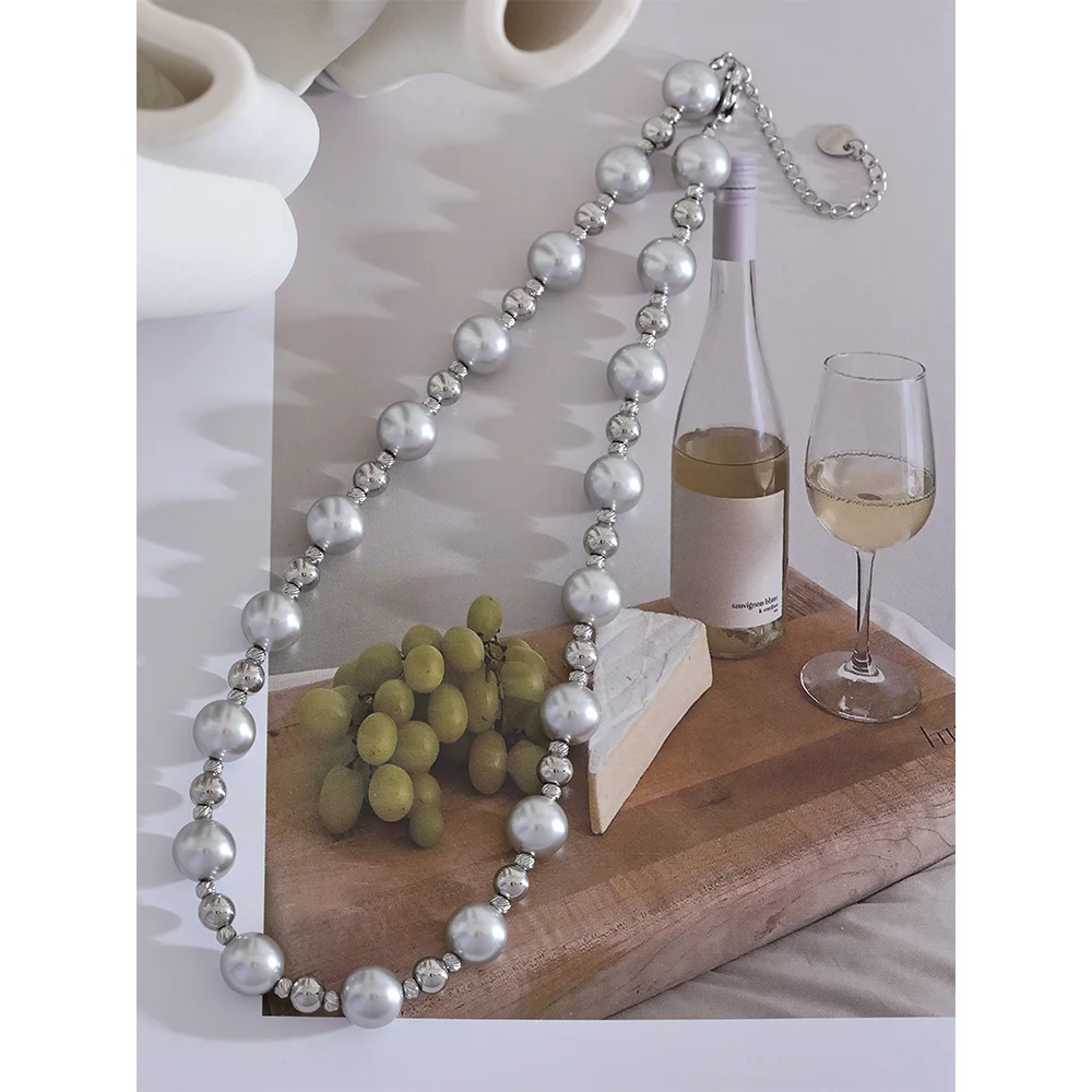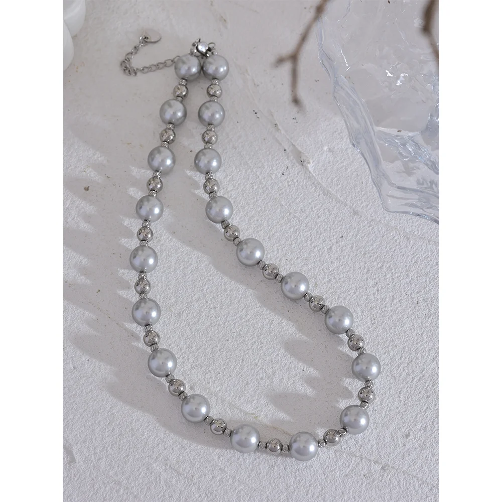 Yhpup Grey Imitation Pearl Beads Handmade Chain Stainless Steel Collar Necklace...
