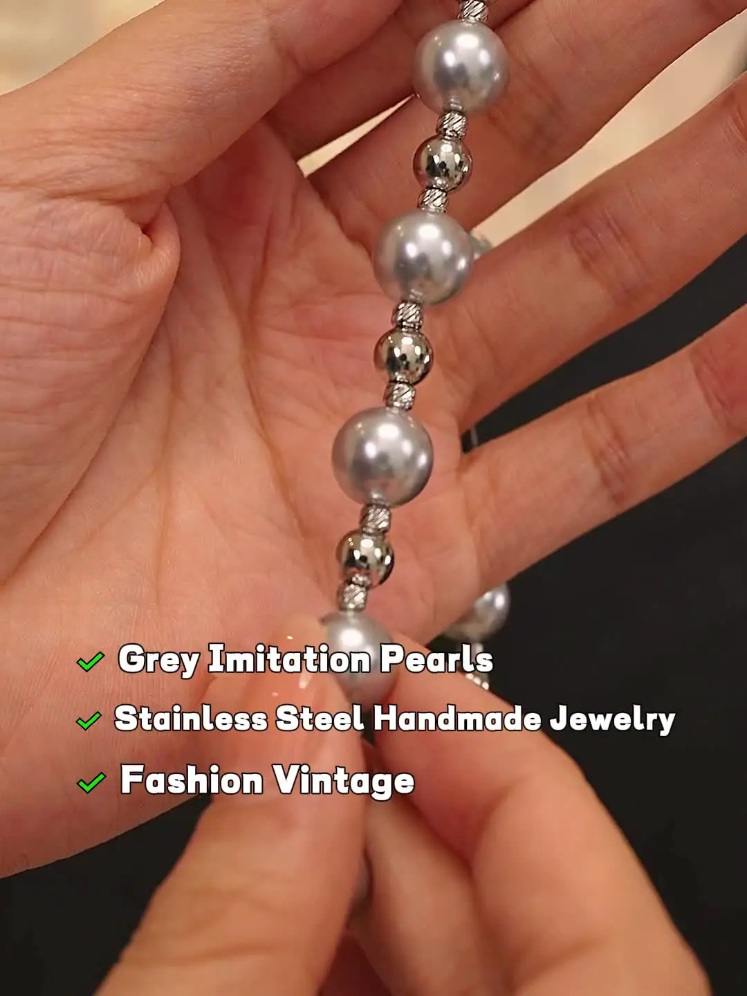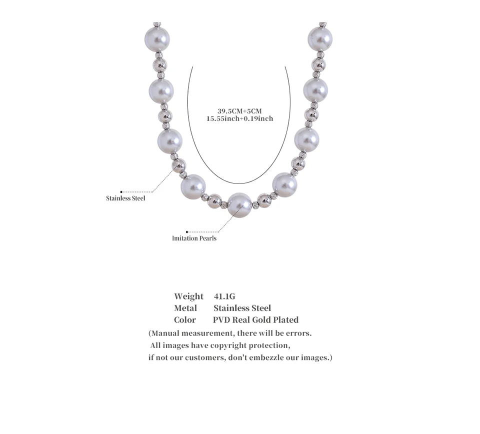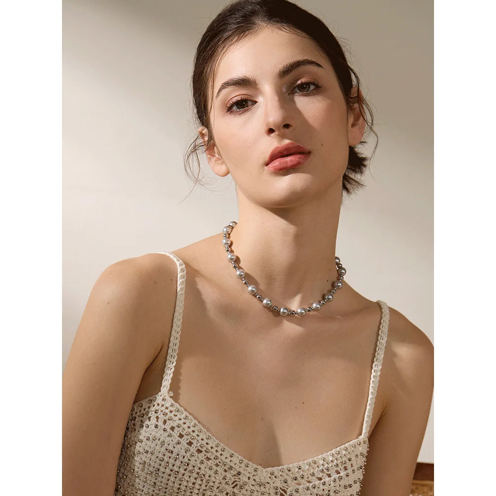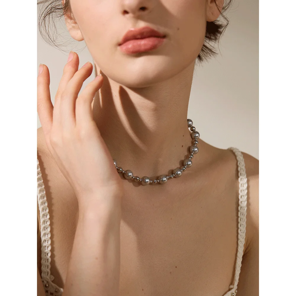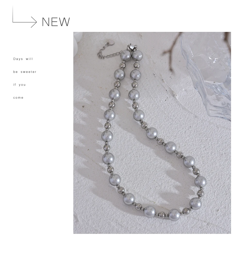 Yhpup Grey Imitation Pearl Beads Handmade Chain Stainless Steel Collar Necklace...