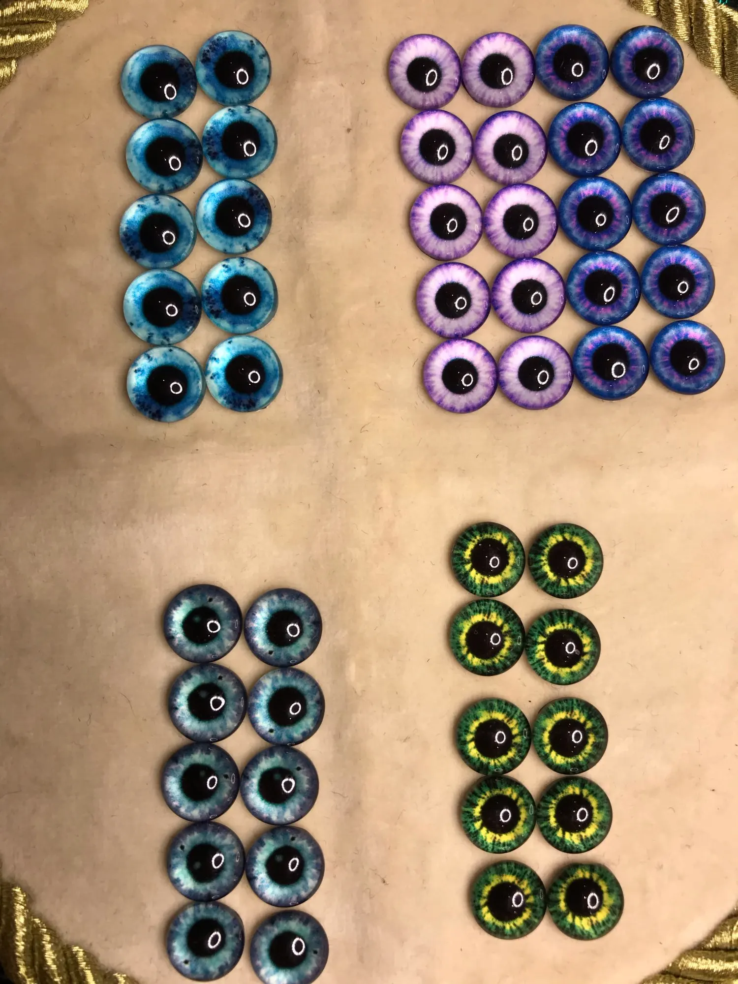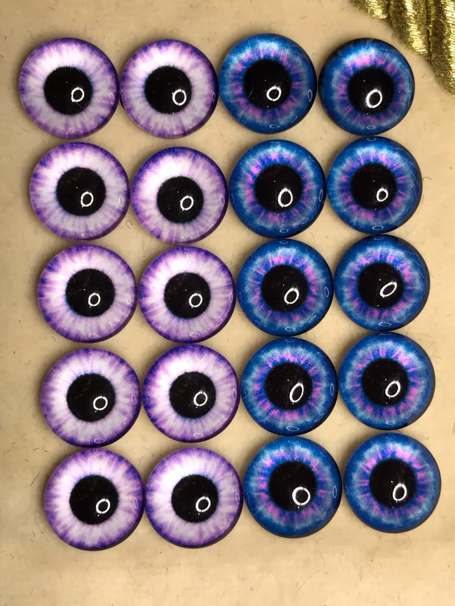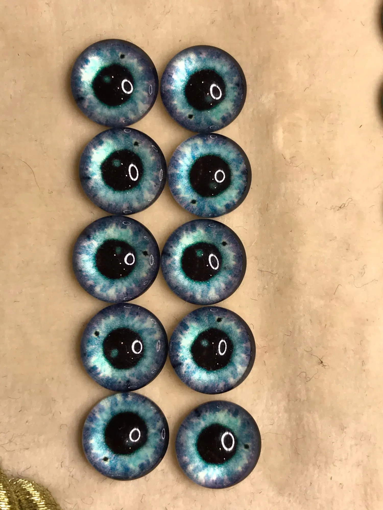 Пришли недели за 3. Стеклянный кабошон с наклеенным с изнанки зрачком. Ровно 50. Один кабошон со сколом сбоку, один со значком не по центру. Но! Они все не 10 мм, а 9! Это плохо. Само качество печати нормальное.
