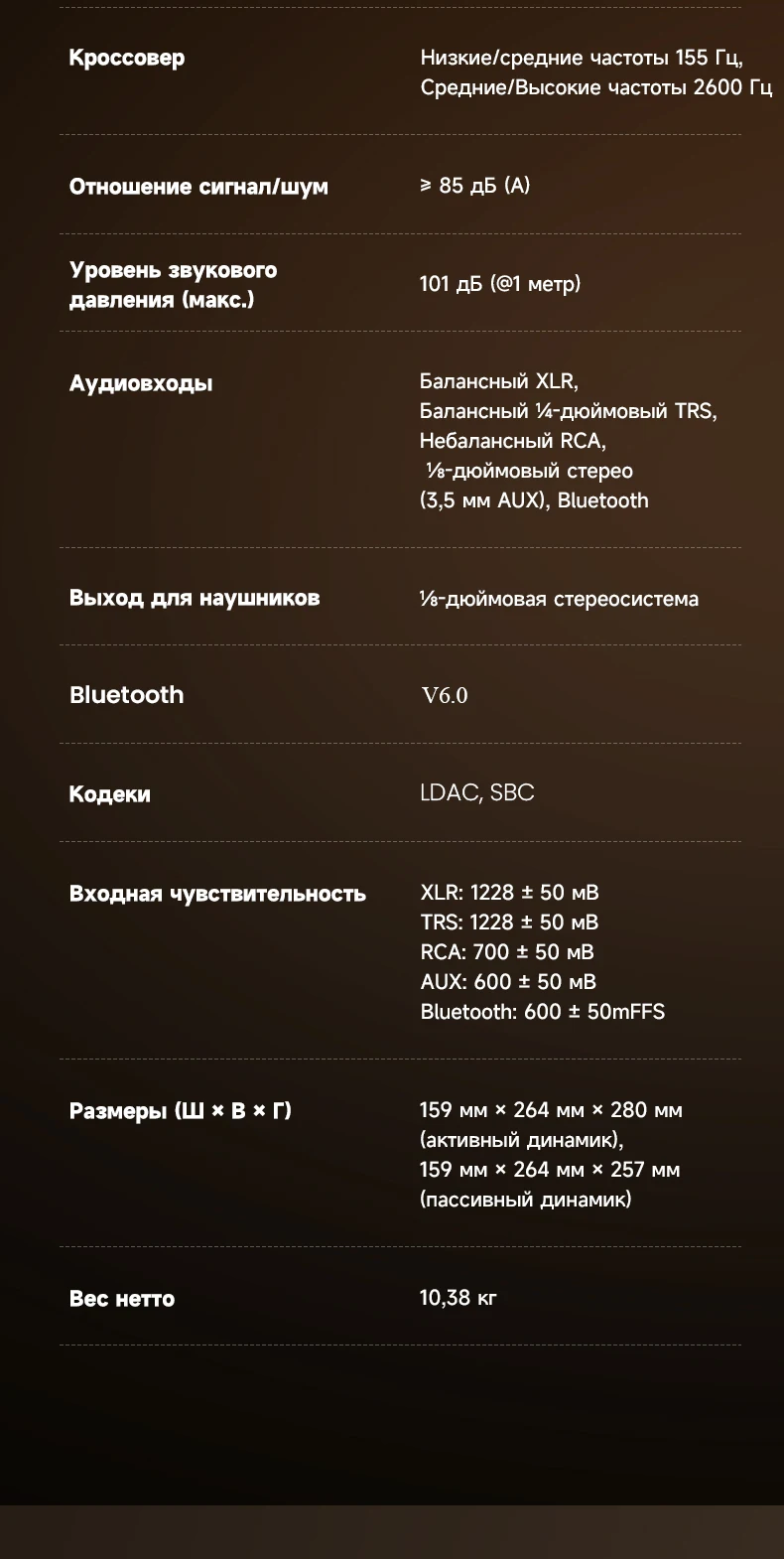 - Подключение:AUX, Bluetooth, RCA, XLR