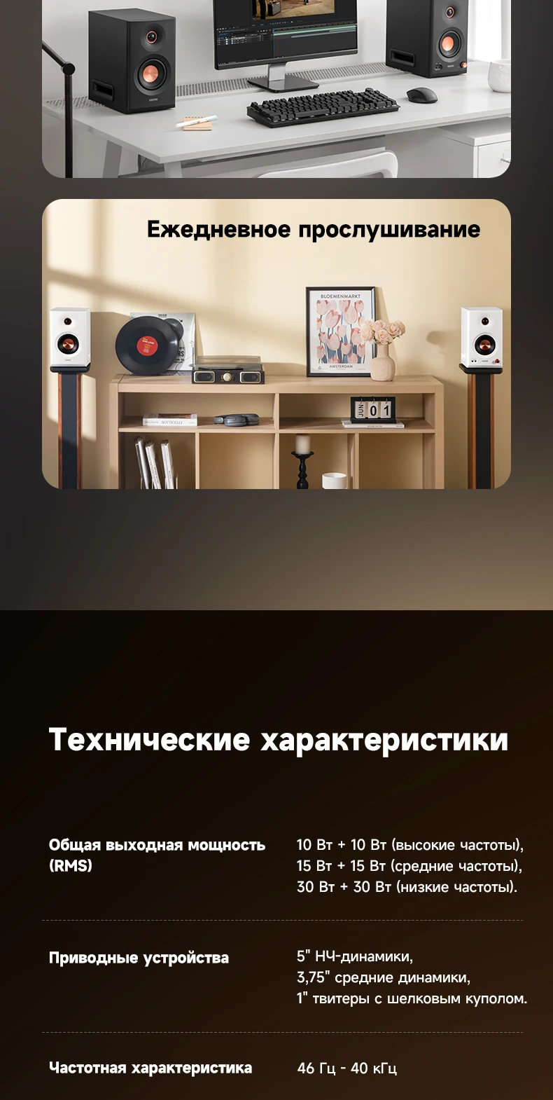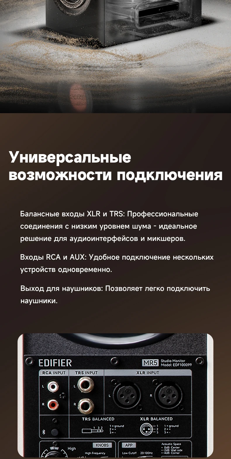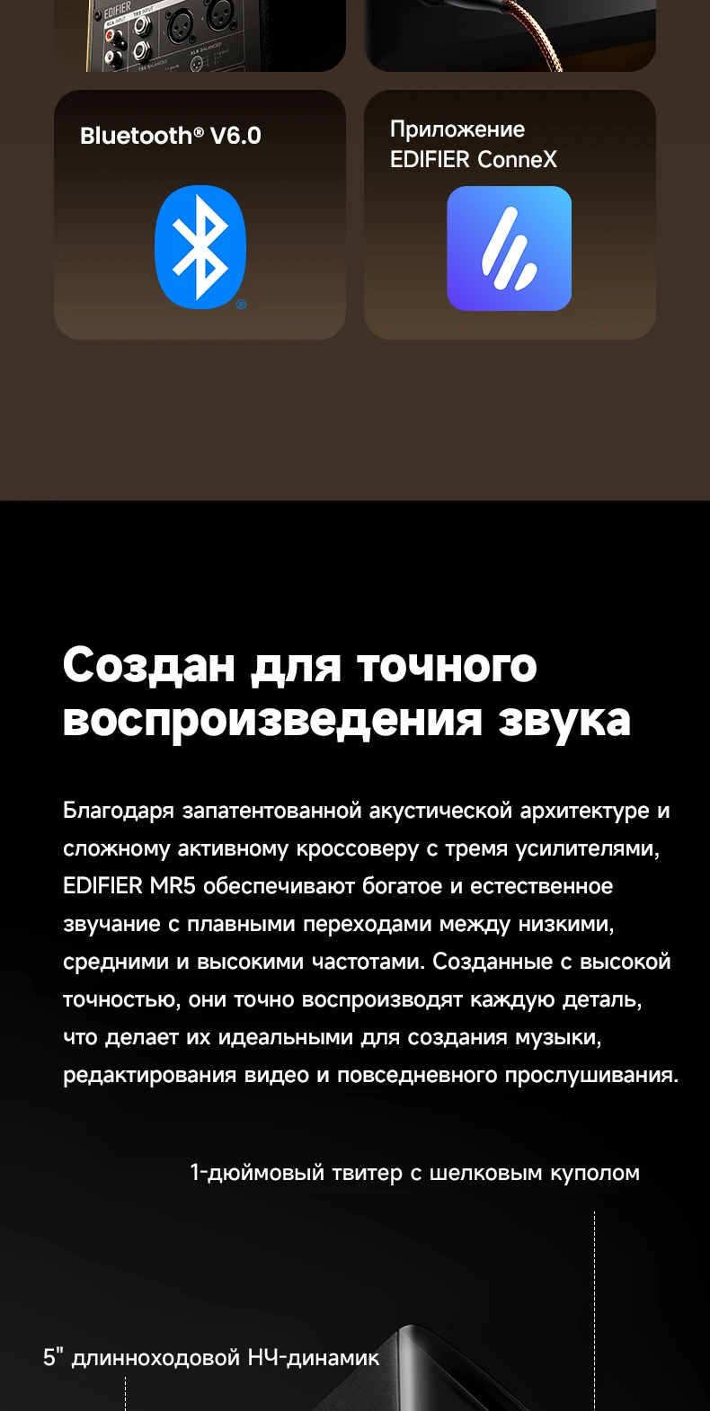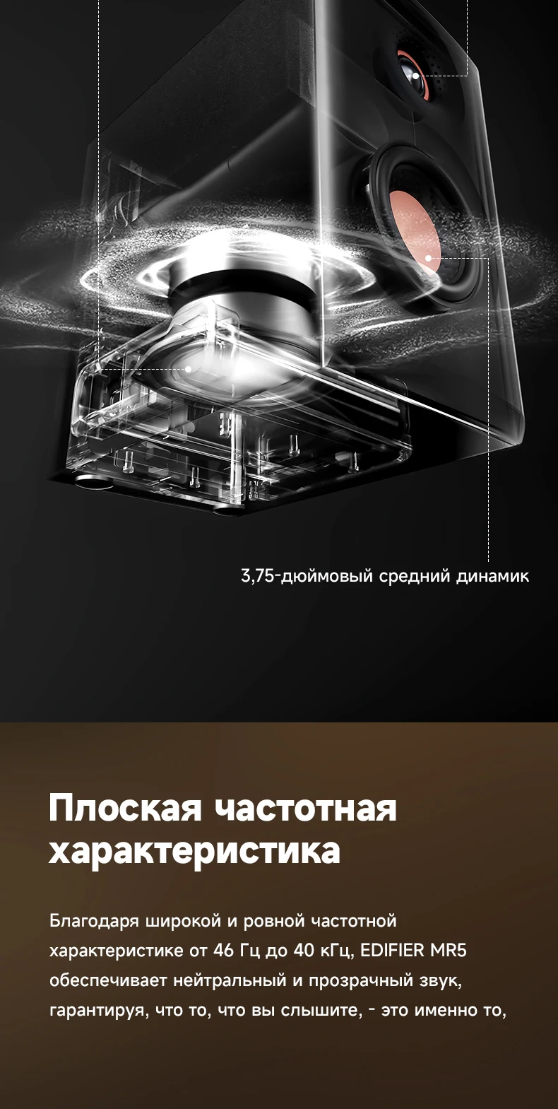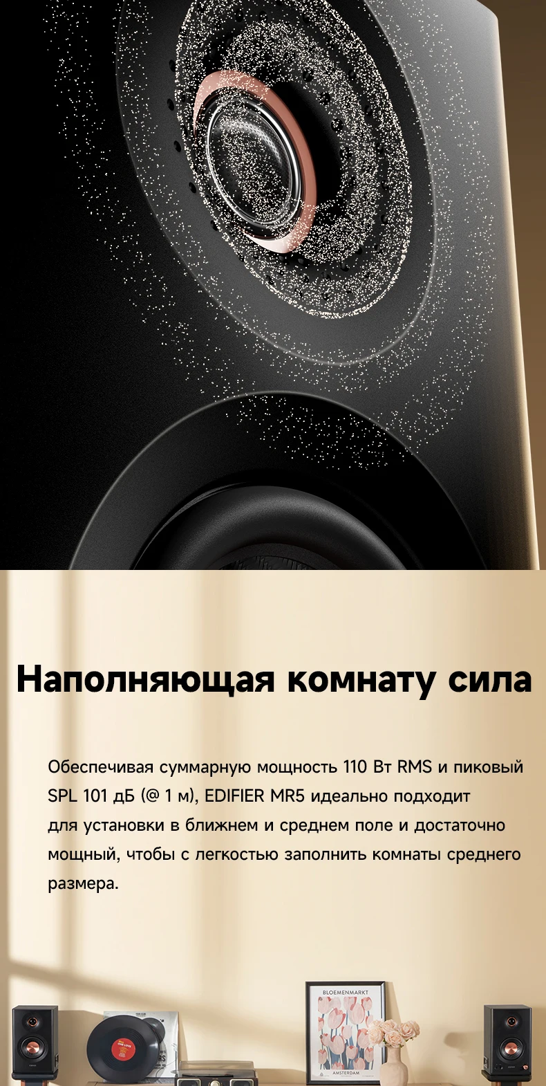 Редкий случай, когда получаешь именно то, что хочешь! Колонки очень понравились, до этого были Edifier S330D, система 2.1. Очень неплохие на свое время колоночки, но хотелось уже чего-то помощнее и посовременнее. Выбор пал на MR5. Почитав и посмотрев обзоры - решил для себя что это самое то. Во первых - это цена, она очень демократичная за такой то звук, во вторых - освободилось место под столом, т.к. нет сабвуфера, теперь он в каждой колонке, хоть и меньшего диаметра, чем у меня был на предыдущей системе. Слушаю уже второй день на момент написания отзыва, до сих пор ловлю себя на мысли что давно не был так рад покупке, старые треки из коллекции звучат по другому, в некоторых даже стал слышать звуки, которых раньше не было слышно на старых колонках (колокольный звон далеко в фоне, пение птиц, шепот разговора и другие эффекты, которые любят прятать создатели треков). Через приложение настроил положение колонок в комнате, чуть убавил басс, он тут можно сказать даже избыточен на мой вкус, чуть прибавил высоких частот, совсем капельку. Звук стал именно такой, какой я хотел. Низкие частоты напористые, напор сохраняется даже на минимальной громкости. Слушаю все это через пк с дискретной аудиокарты Sound Blaster AE7, режим Direct sound. Из недостатков лично для меня - думал будут немного меньше, но с этим я смирился. А вот что раздражает, так это то, что нельзя отключить Bluetooth на них, даже когда ты вроде бы отключаешь его через приложение, колонки все равно обнаруживаются. Но тут прикол даже не в этом, а в том, что к ним могут подключить совершенно левые люди, т.к. сопряжение происходит без подтверждения на спаривание через bt. Это очень серьезный косяк, надеюсь как-то поправят прошивкой. Так же доставка могла быть быстрее, от меня до центрального склада, откуда ехала колонка порядка 120км, но она сделала круг в соседнюю область, проехала мимо моего города а потом спустя еще пару сотен километров вернулась ко мне. Это очень нелогичная логистика. Хоть курьер был хороший, позвонил, договорился о выдаче и привёз посылку до дома. Коробка была немного в гармошку, даже внутренняя помчалась, но содержимое было целым и полностью рабочим. В общем эти колонки для тех, кто хотел чистый мощный звук сидя за своим пк или просматривая тв. Для дискотек они не подойдут, да и не для этого они предназначены)
