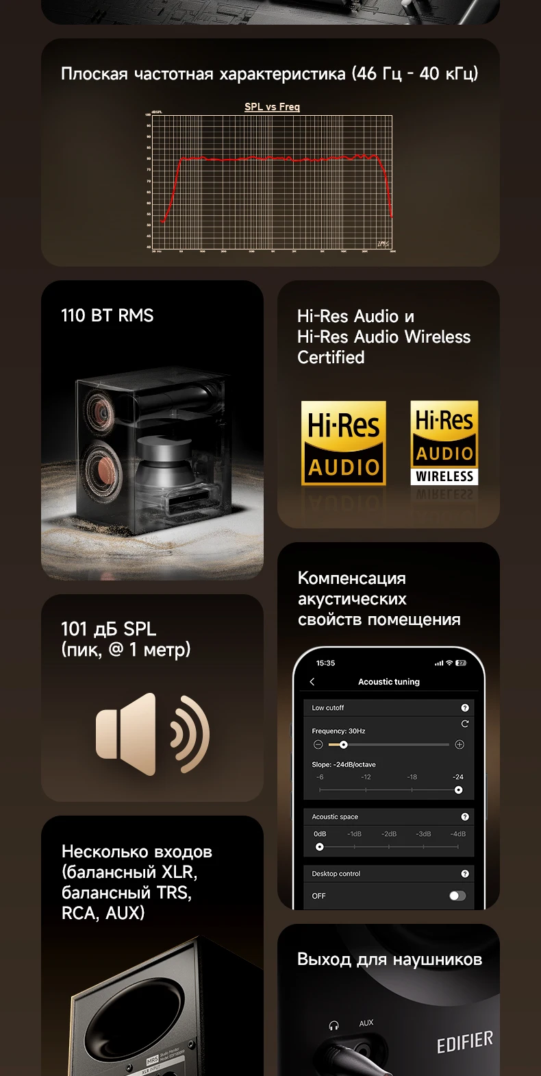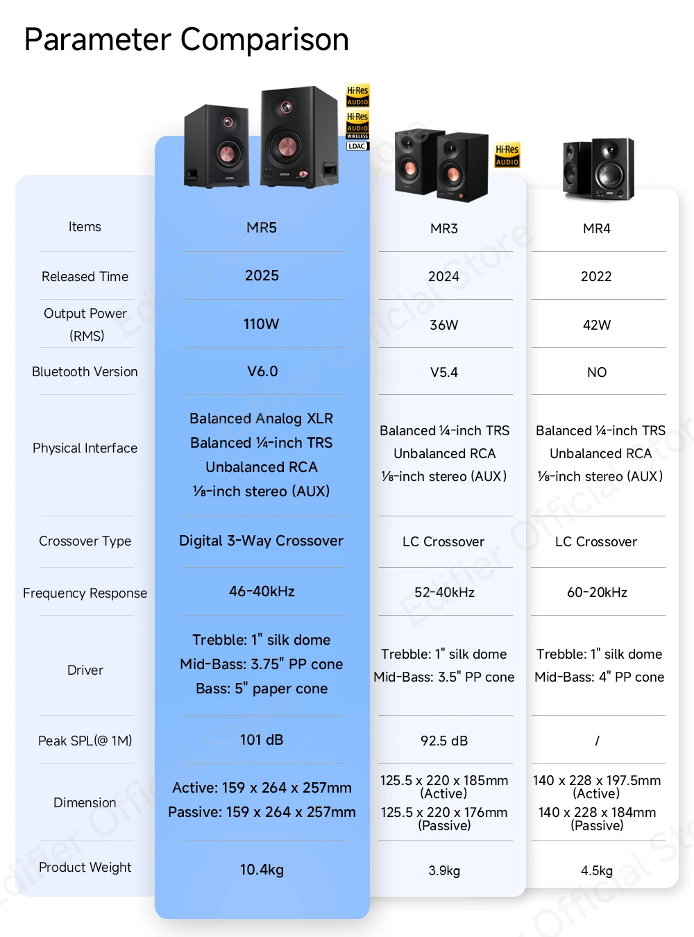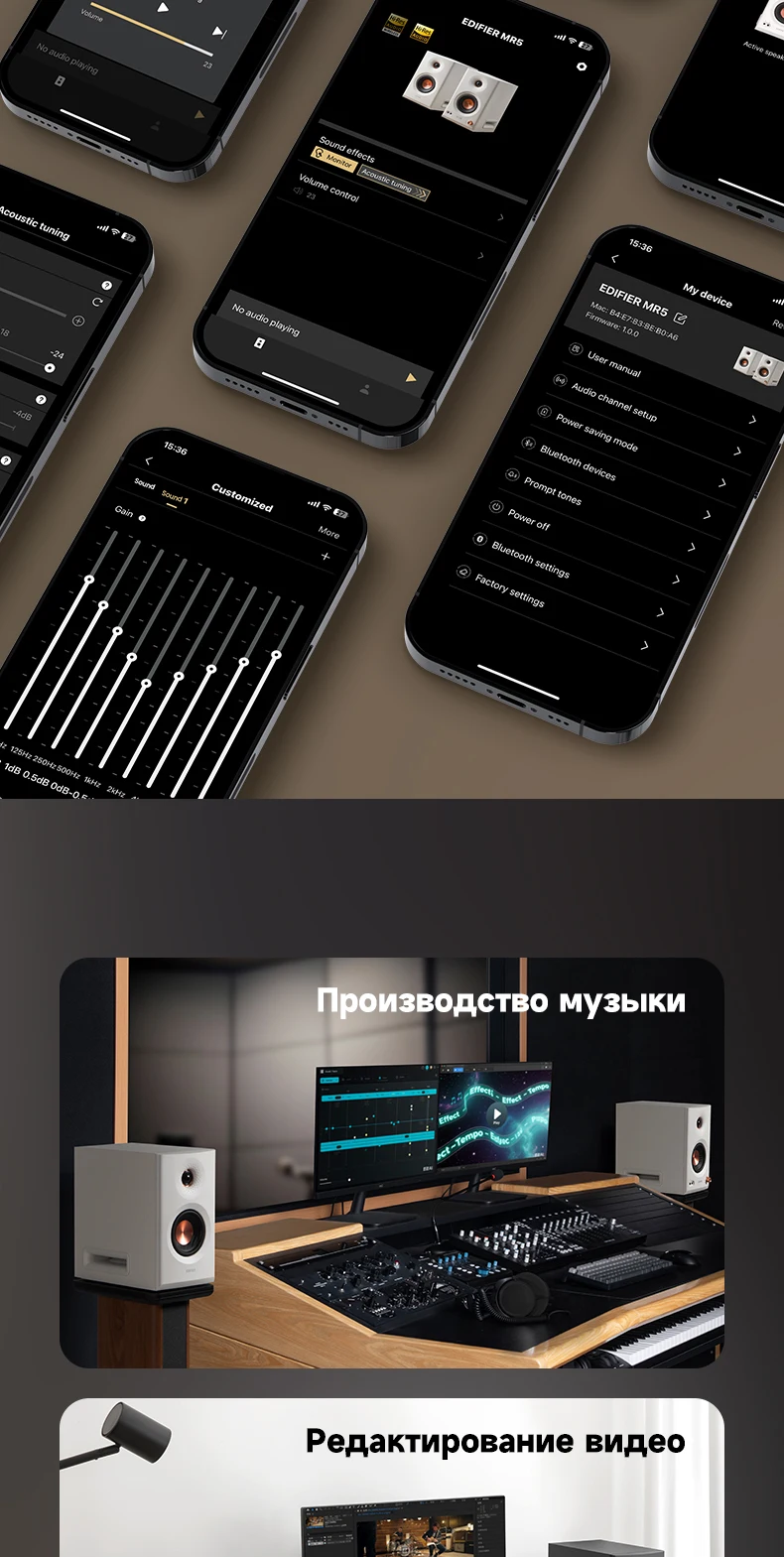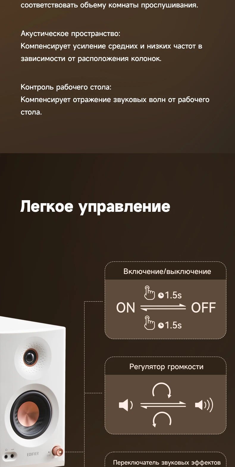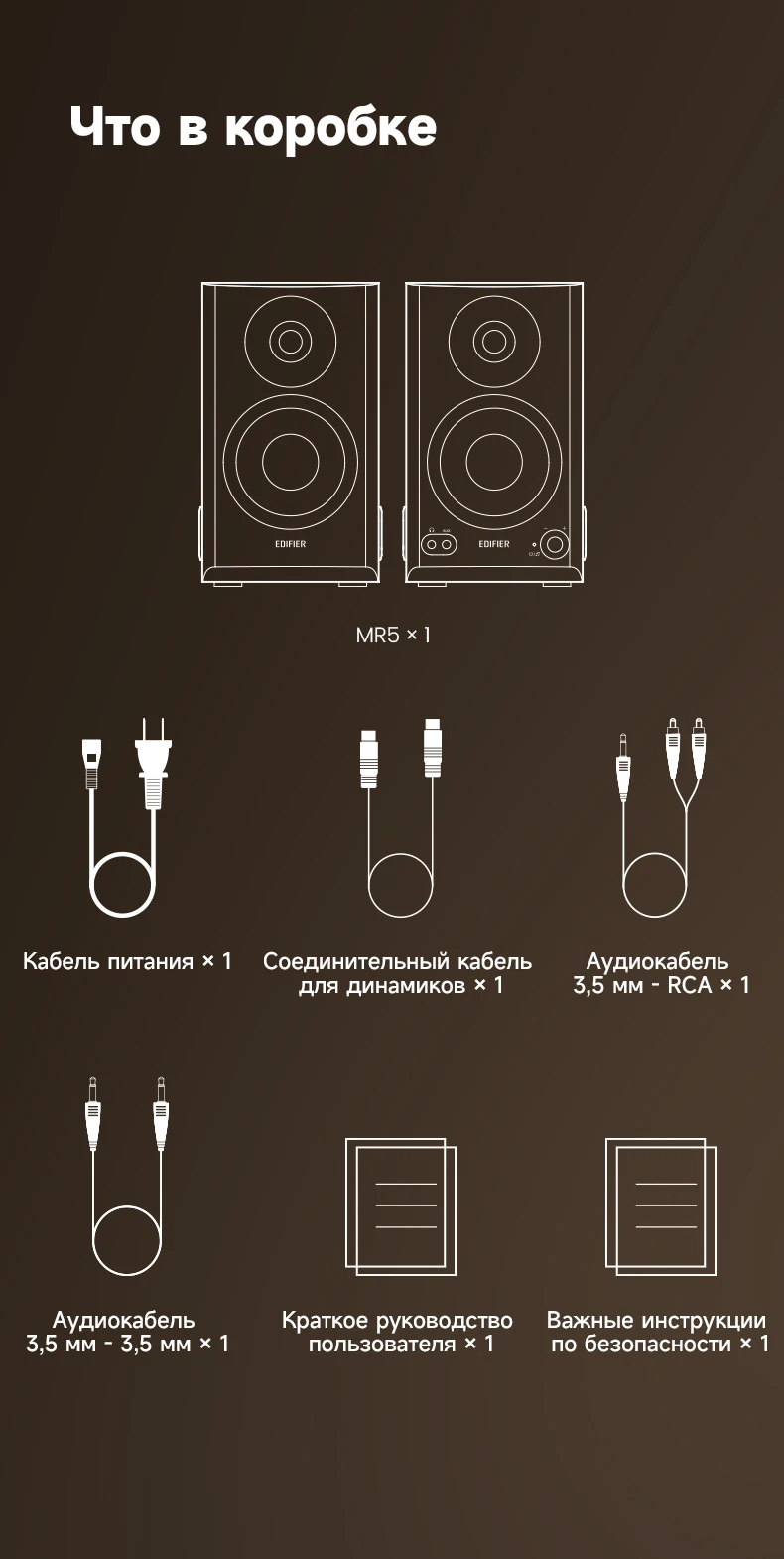 Редкий случай, когда получаешь именно то, что хочешь! Колонки очень понравились, до этого были Edifier S330D, система 2.1. Очень неплохие на свое время колоночки, но хотелось уже чего-то помощнее и посовременнее. Выбор пал на MR5. Почитав и посмотрев обзоры - решил для себя что это самое то. Во первых - это цена, она очень демократичная за такой то звук, во вторых - освободилось место под столом, т.к. нет сабвуфера, теперь он в каждой колонке, хоть и меньшего диаметра, чем у меня был на предыдущей системе. Слушаю уже второй день на момент написания отзыва, до сих пор ловлю себя на мысли что давно не был так рад покупке, старые треки из коллекции звучат по другому, в некоторых даже стал слышать звуки, которых раньше не было слышно на старых колонках (колокольный звон далеко в фоне, пение птиц, шепот разговора и другие эффекты, которые любят прятать создатели треков). Через приложение настроил положение колонок в комнате, чуть убавил басс, он тут можно сказать даже избыточен на мой вкус, чуть прибавил высоких частот, совсем капельку. Звук стал именно такой, какой я хотел. Низкие частоты напористые, напор сохраняется даже на минимальной громкости. Слушаю все это через пк с дискретной аудиокарты Sound Blaster AE7, режим Direct sound. Из недостатков лично для меня - думал будут немного меньше, но с этим я смирился. А вот что раздражает, так это то, что нельзя отключить Bluetooth на них, даже когда ты вроде бы отключаешь его через приложение, колонки все равно обнаруживаются. Но тут прикол даже не в этом, а в том, что к ним могут подключить совершенно левые люди, т.к. сопряжение происходит без подтверждения на спаривание через bt. Это очень серьезный косяк, надеюсь как-то поправят прошивкой. Так же доставка могла быть быстрее, от меня до центрального склада, откуда ехала колонка порядка 120км, но она сделала круг в соседнюю область, проехала мимо моего города а потом спустя еще пару сотен километров вернулась ко мне. Это очень нелогичная логистика. Хоть курьер был хороший, позвонил, договорился о выдаче и привёз посылку до дома. Коробка была немного в гармошку, даже внутренняя помчалась, но содержимое было целым и полностью рабочим. В общем эти колонки для тех, кто хотел чистый мощный звук сидя за своим пк или просматривая тв. Для дискотек они не подойдут, да и не для этого они предназначены)