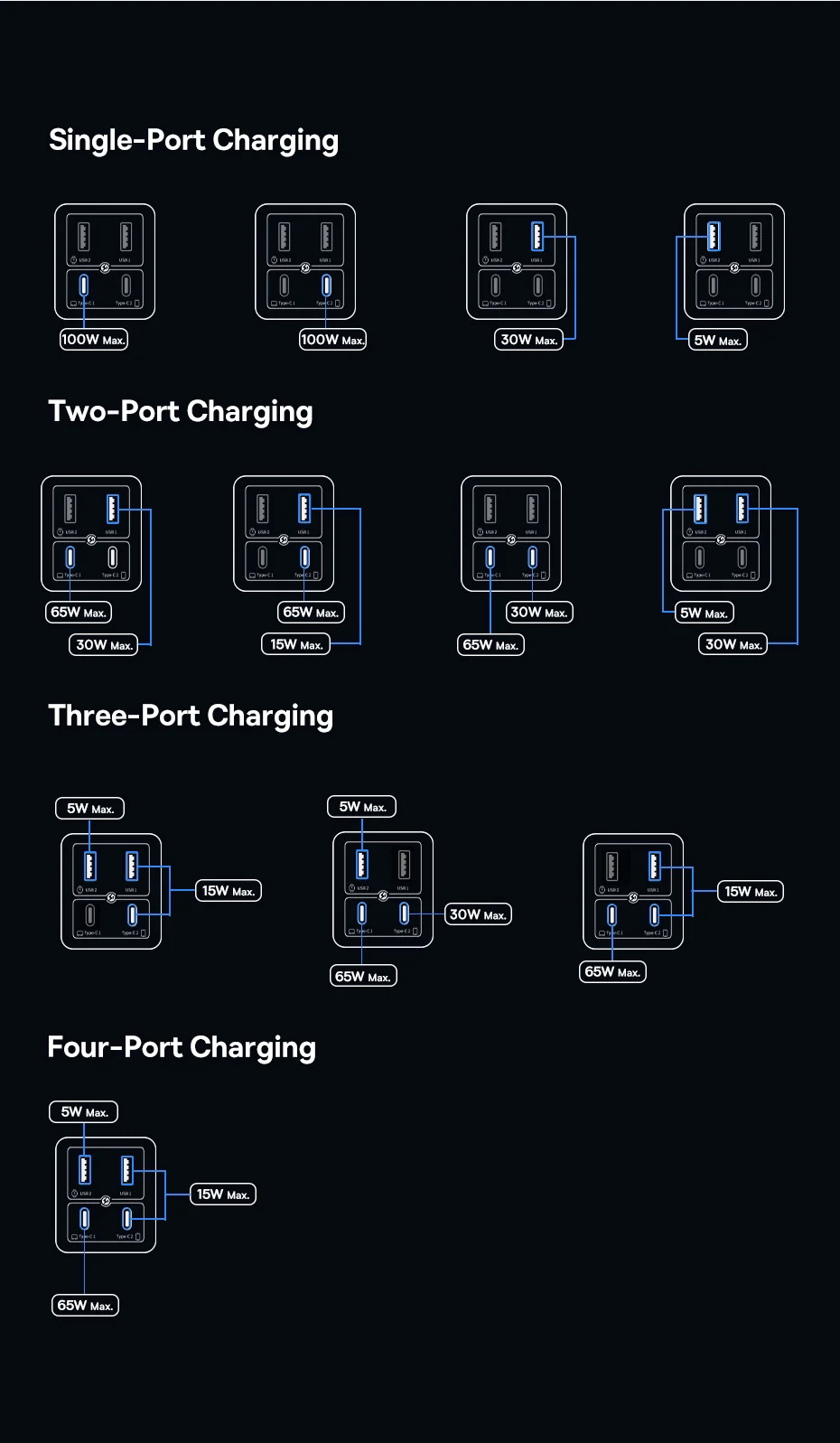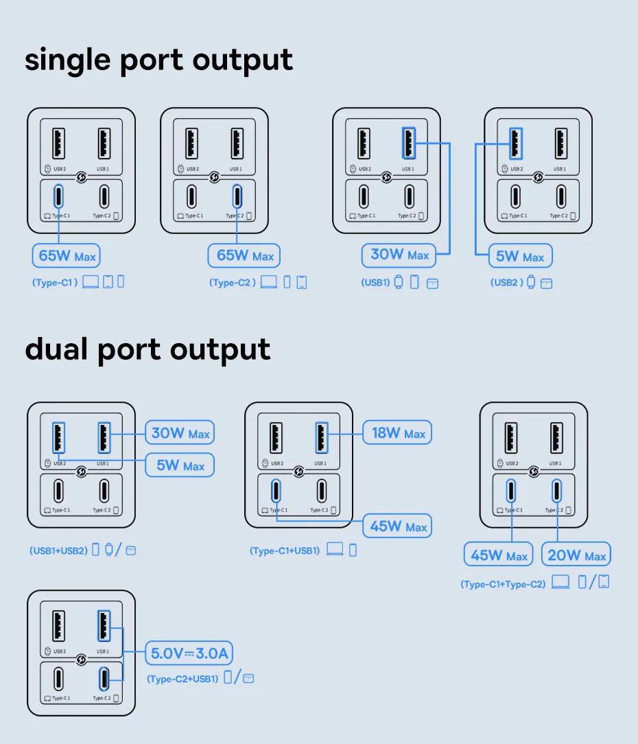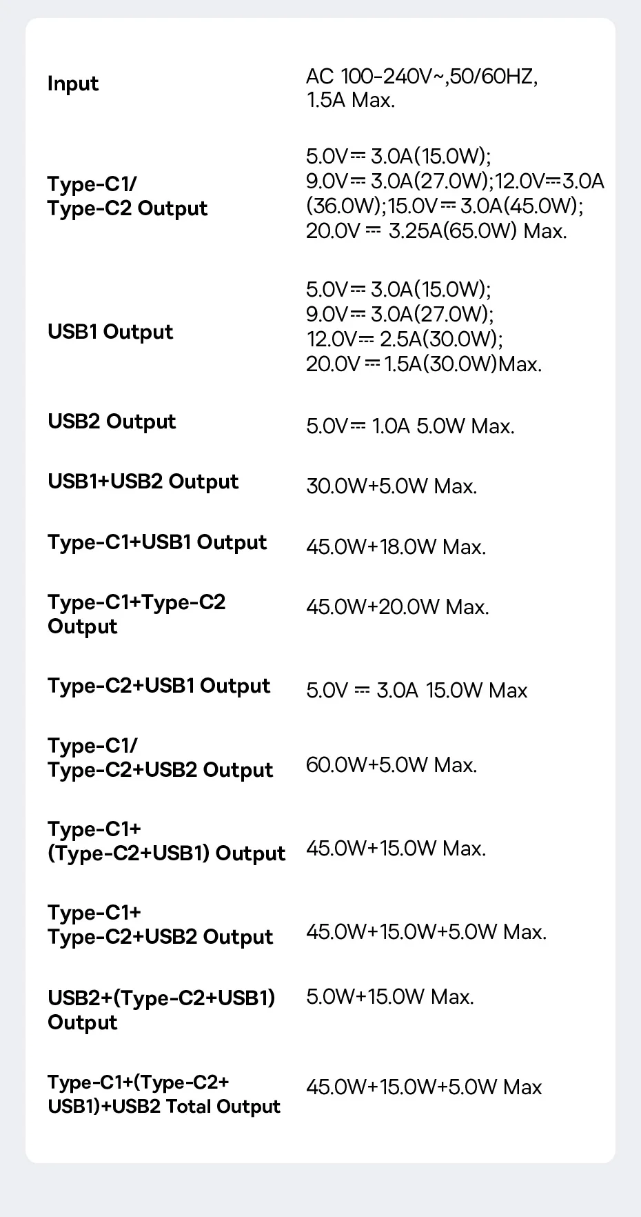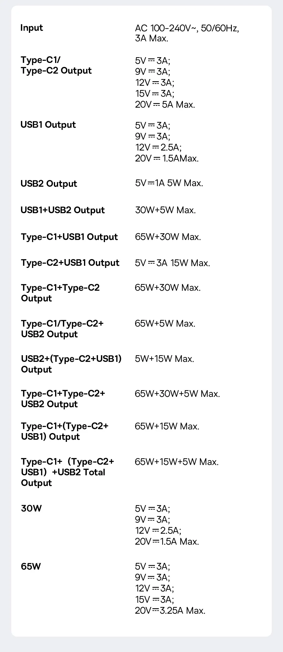 - Type-C 1/2 65W Output::5V/3A,9V/3A,12V/3A,15V/3A,20V/3.25A 65W Max