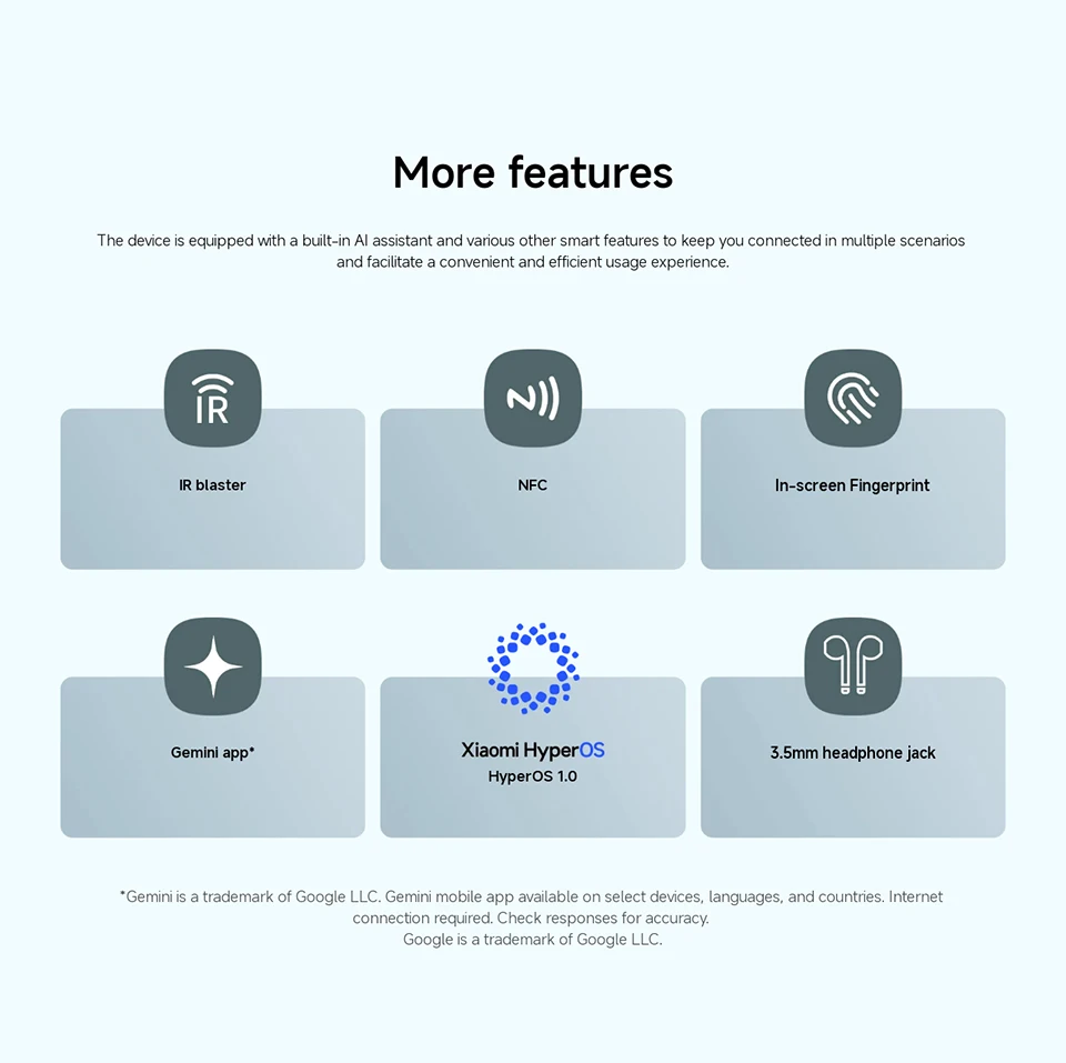 ОС------------- Работает от Xiaomi HyperOS 1,0, поддерживает несколько языков и Google Play, встроенный датчик отпечатков пальцев, разблокировка лица, ИК-бластер, приложение Google Gemini, защита от пыли и воды IP64, Dolby Atmos два динамика