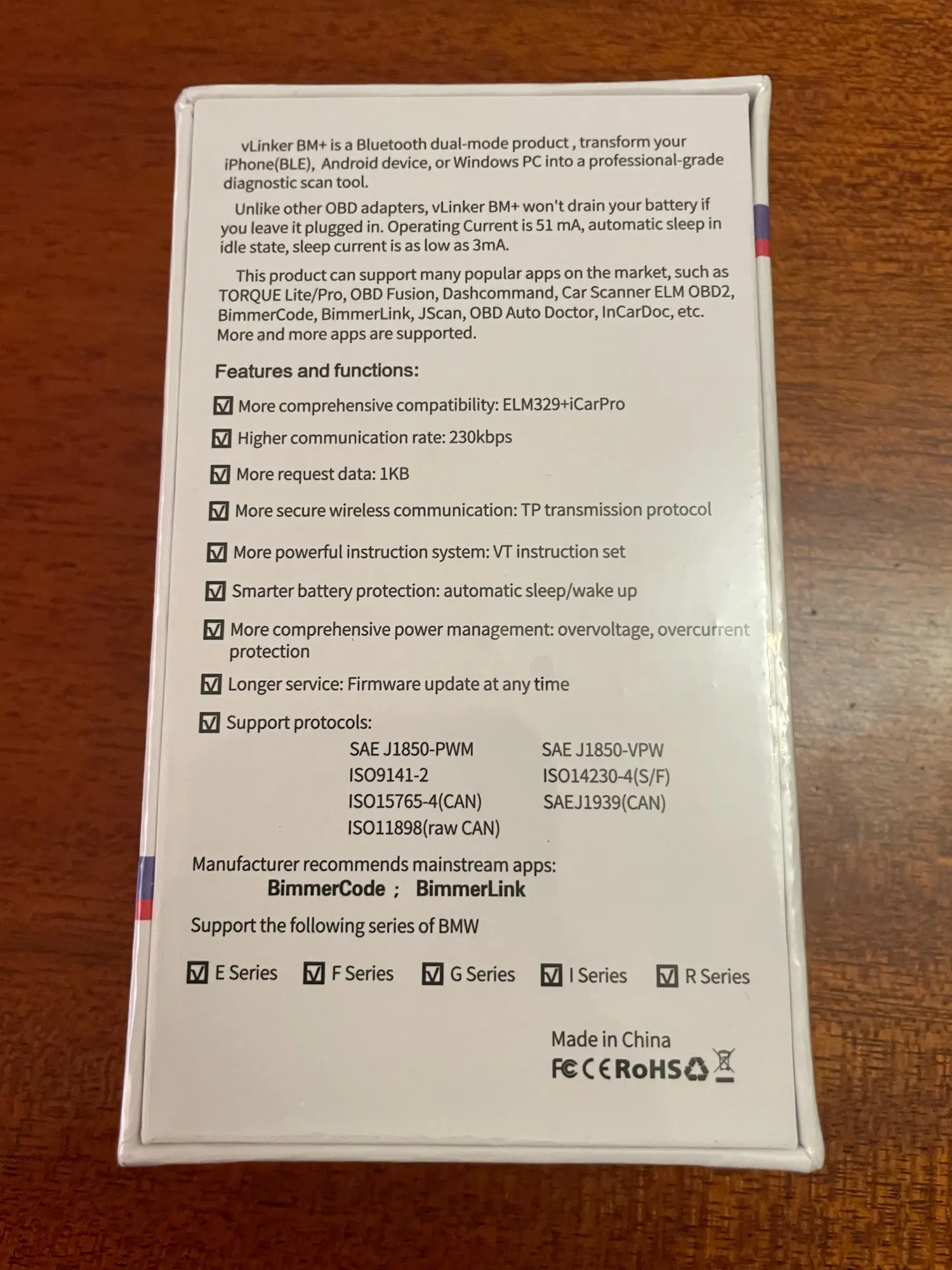 Совместим с BimmerCode, BimmerLink, TORQUE Lite/ Pro, OBD Fusion, DashCommand, автомобильным сканером ELM OBD2, Carista OBD2, JScan, OBD Auto Docoe, LeafSpy, Dr. Prius, Track Addict, таймером Harry's Lap, inCar Doc и т. д.