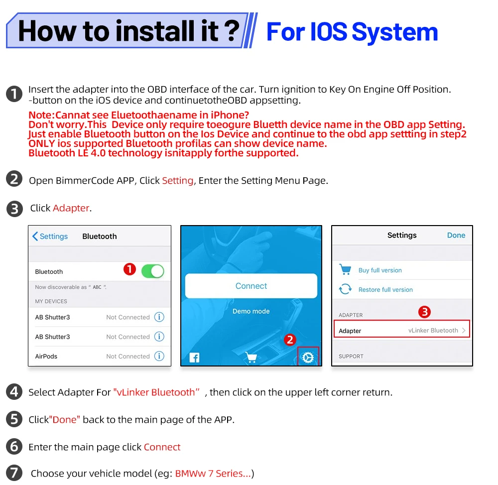 --Не волнуйтесь.его устройство требует только ввода имени устройства Bluetooth в настройках приложения OBD.Нажмите кнопку Bluetooth на устройстве и приступайте к настройке приложения obd. Только профили Bluetooth, поддерживаемые iOS, будут отображать имя устройства на шаге 2.
