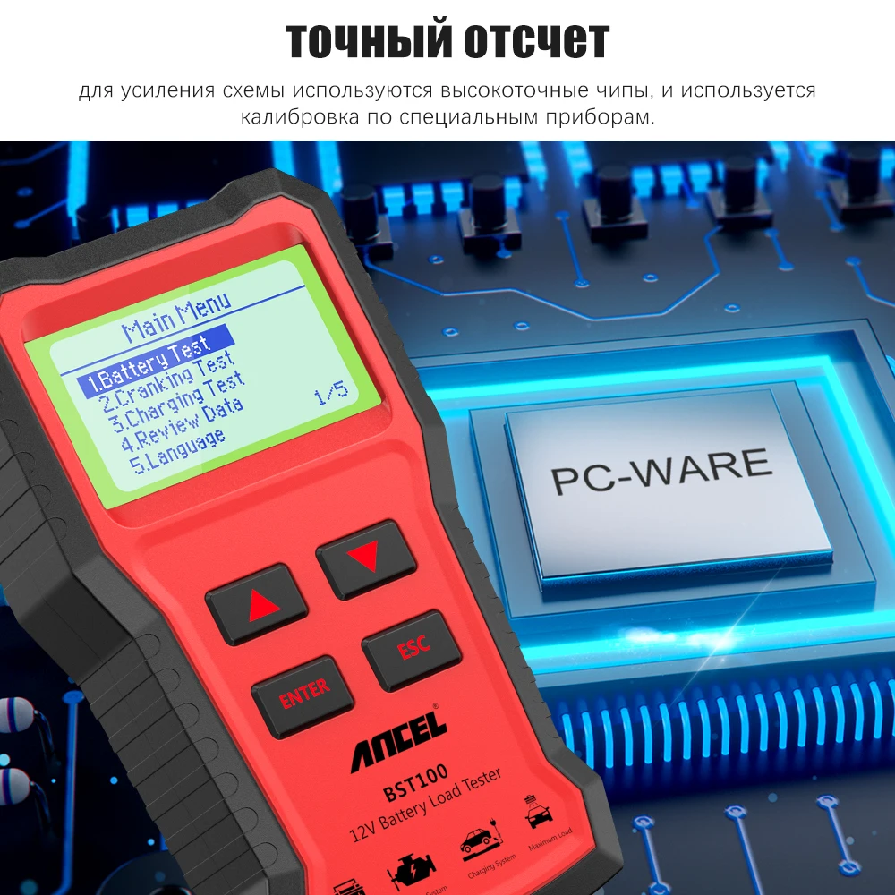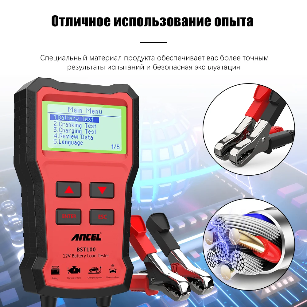 Тестер батареи Ancel BST100 используется для свинцово-кислотного пускового аккумулятора, а также для проверки следующих условий аккумулятора, запуска, зарядки и загрузки. Благодаря отличному дизайну, простоте в эксплуатации, точному считыванию, полным функциям этот тестер обеспечивает показания большим ЖК-дисплеем и подает подсказки звуком и светом при тестировании. Это если использует 4-проводной Кельвина способ, чтобы завершить сбор ряда сложных данных для расчета каждого типа тестирования данных со встроенным точным и улучшения цифровой процессор. Кроме того, некоторые улучшения цепи, включая Полярную защиту от разворота, защиту от перенапряжения, обнаружение свободного свинца, обеспечивают безопасность и удобство во время тестирования. Таким образом, это лучший инструмент в области продаж аккумуляторов, ремонта автомобилей и проверки батареи в системе оборудования, связанных с свинцово-кислотным пусковым аккумулятором.