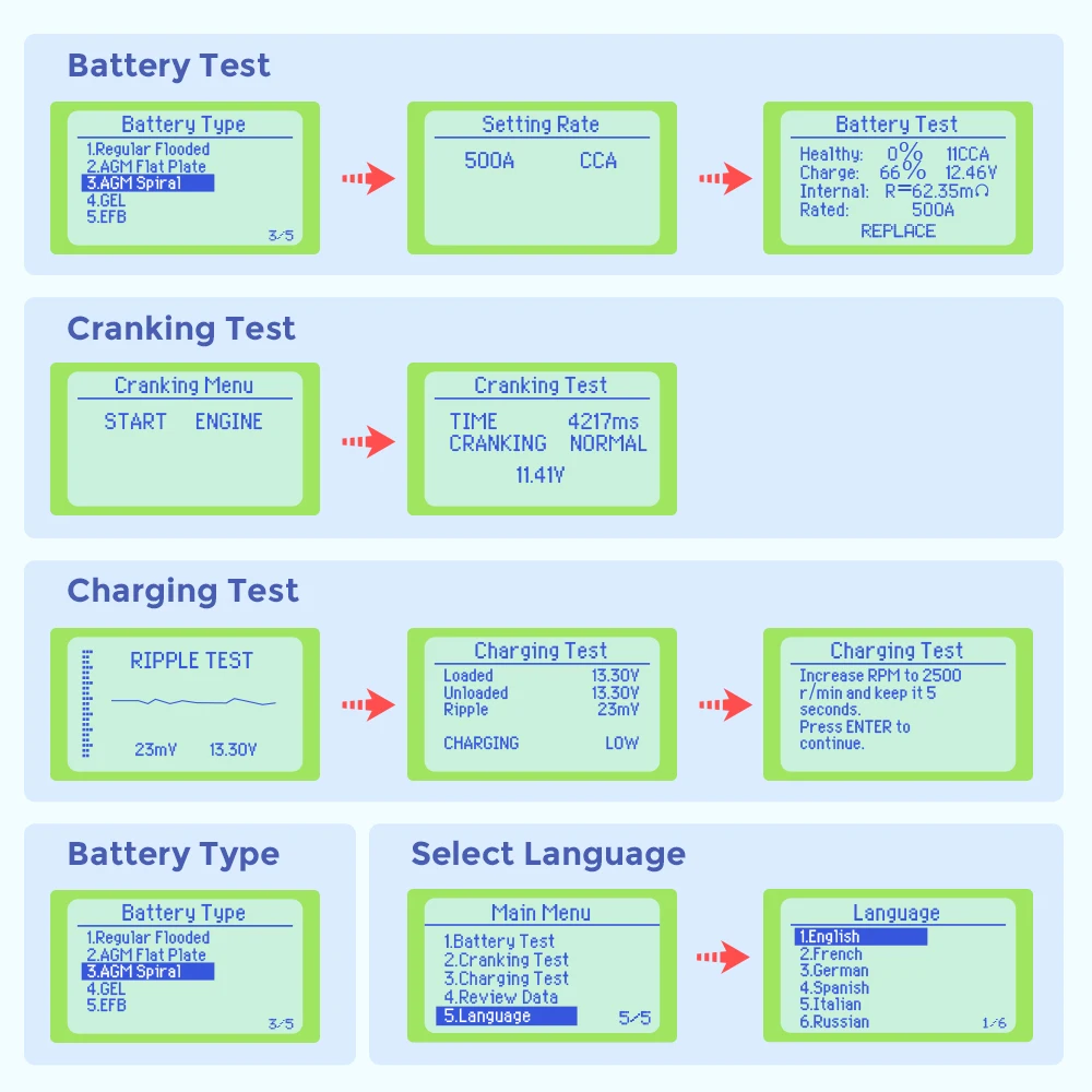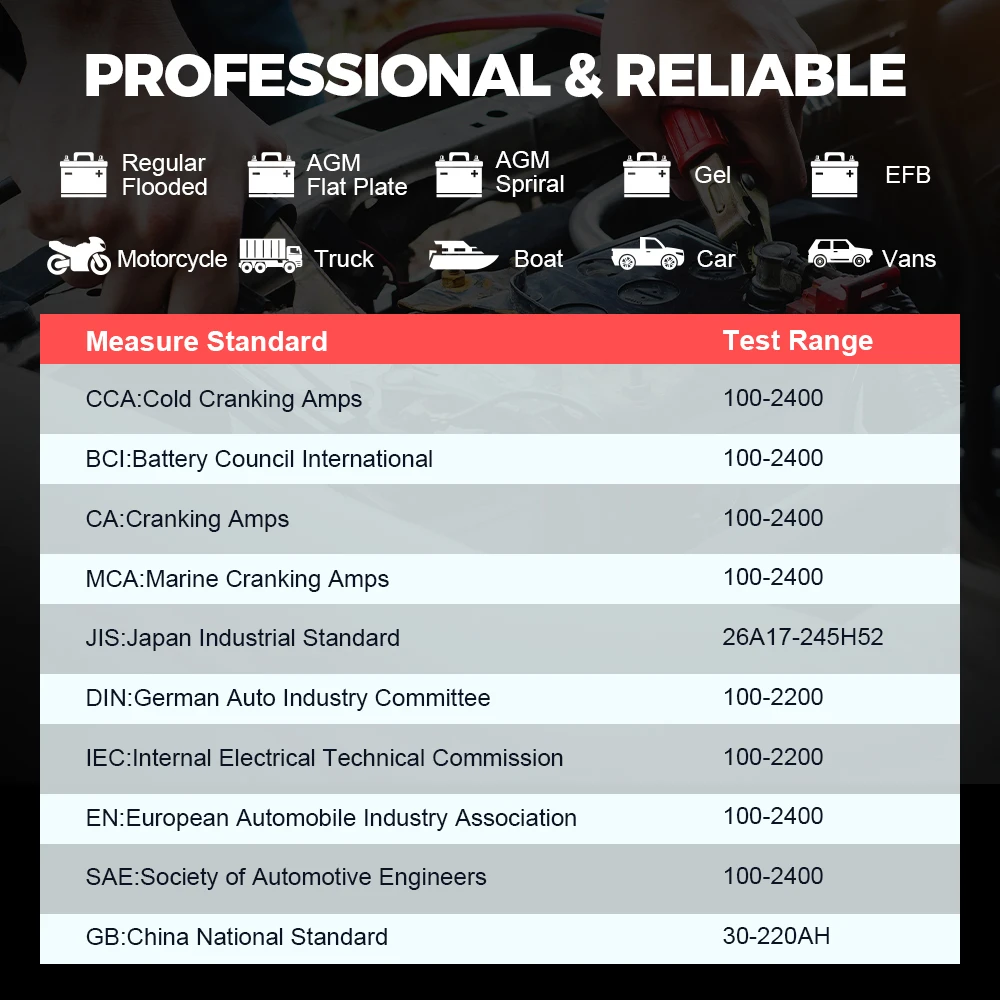 - Tester standards:CCA,CA,MCA,JIS,SAE,DIN