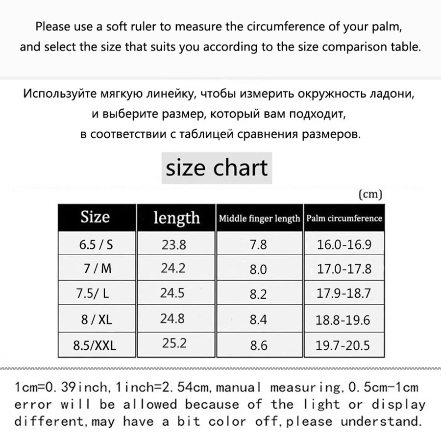 Пожалуйста, измерьте окружность ладони и выберите размер, который вам подходит, в соответствии с таблицей сравнения размеров.