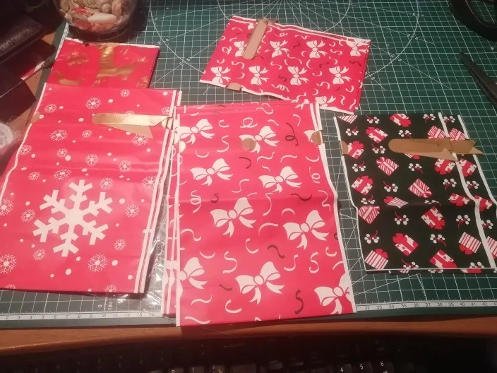 Отличные упаковочные новогодние пакеты с лентой в качестве завязок. Полностью соответствуют описанию. Доставка месяц в общей посылке в постамт. Рекомендую.